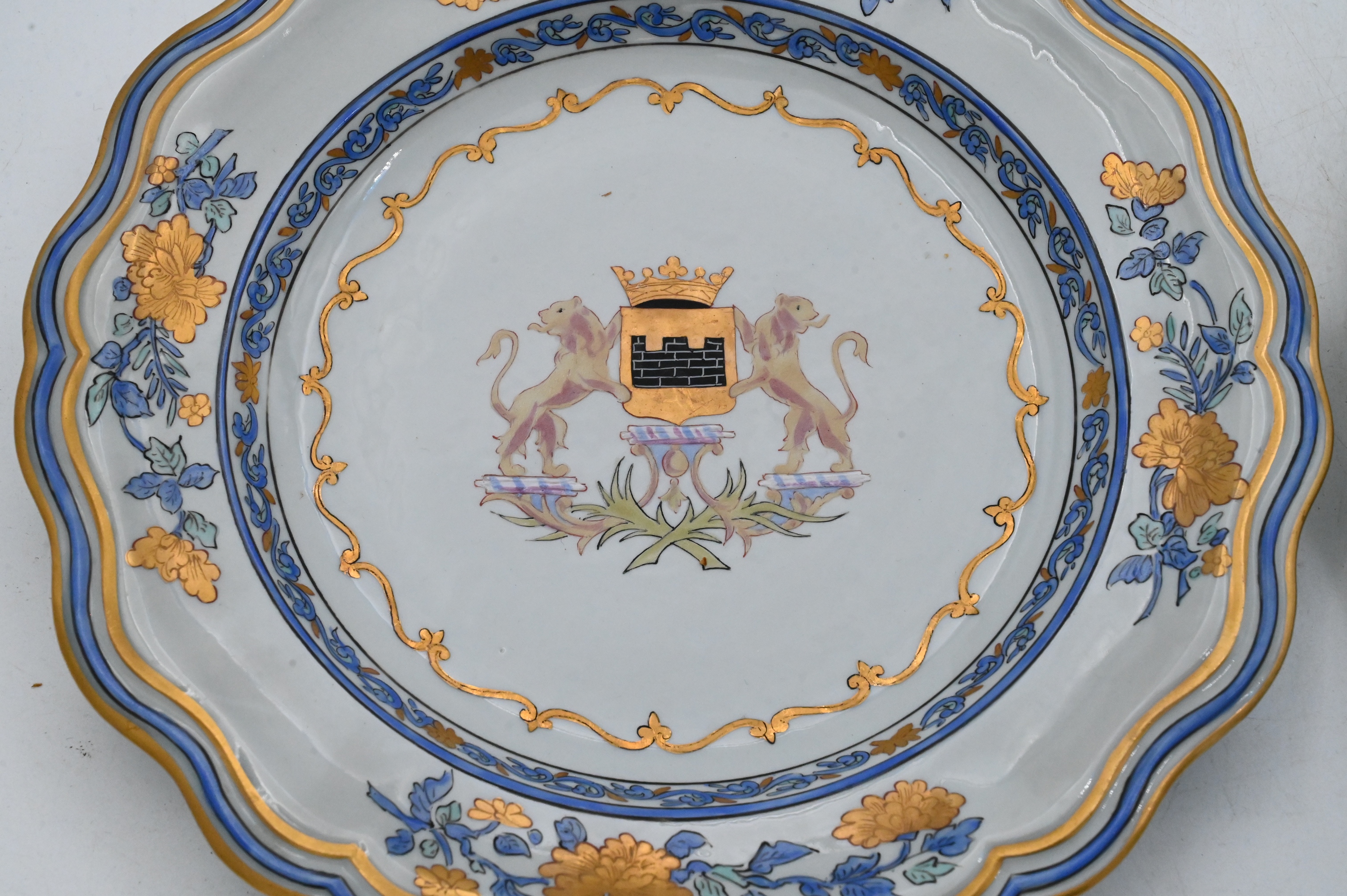 Each plate with scalloped, gilt-highlighted rim and blue-and-gilt floral border enclosing a central armorial device featuring a shield charged with a masonry tower beneath a coronet, flanked by lion supporters (unidentified arms). Typical Samson armorial decoration and palette.