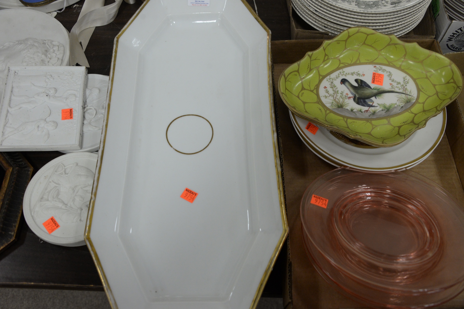 Six Tray Lots of Various Porcelain Plates and Platters, to include pink glass plates a white gold rimmed fish platter a reticulated compote blue colandine dinner plates P. Regout fruit bowl a set of Foley China, along with dessert plates, etc.