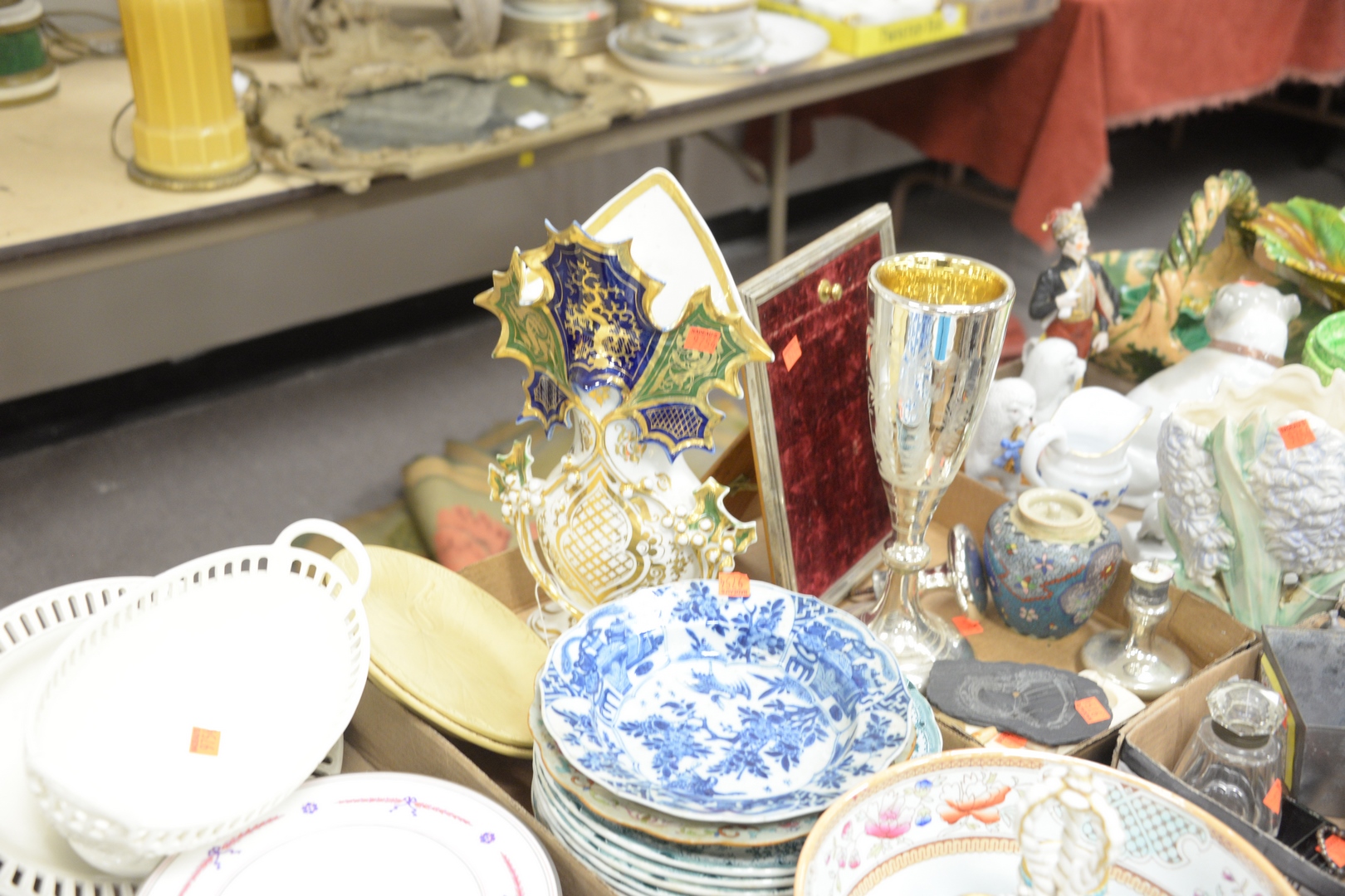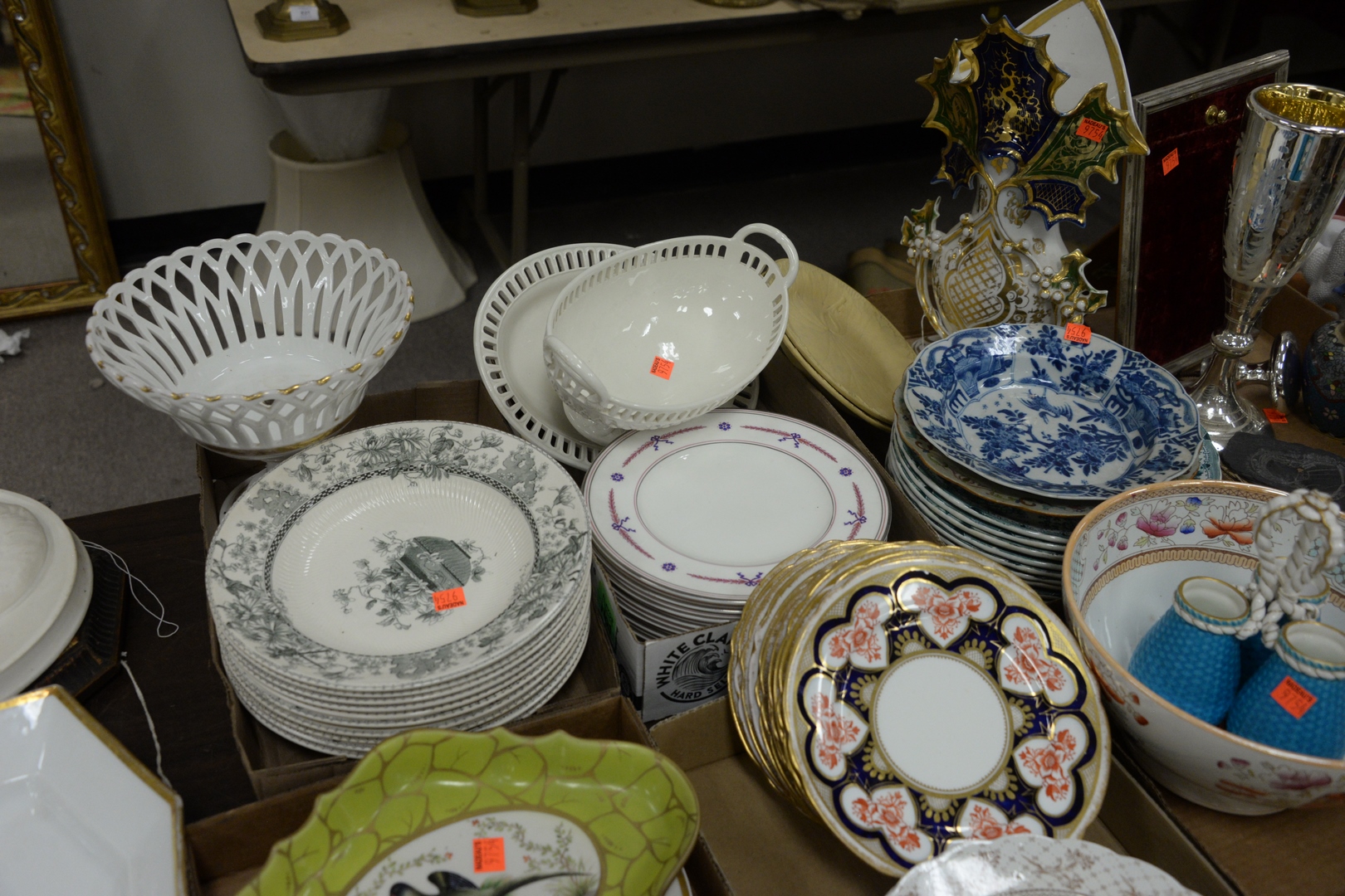 Lot 471: Six Tray Lots of Various Porcelain Plates and Platters, to include pink glass plates a white gold rimmed fish platter a reticulate…