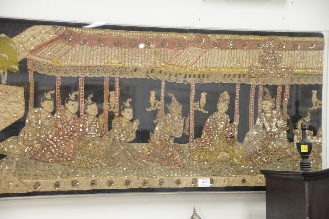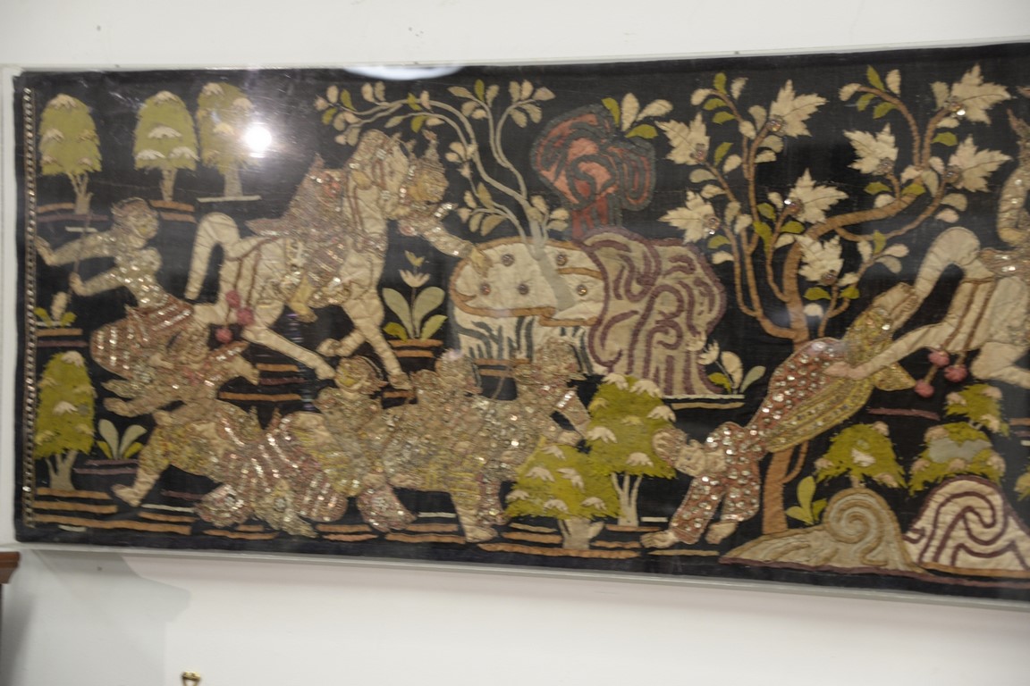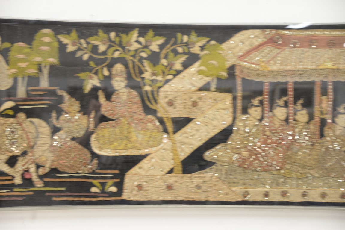Lot 471: Textile panel with applied figure with sequins, pearls and stones with scene of horseman, women, and deity, probably 18th century. 2…