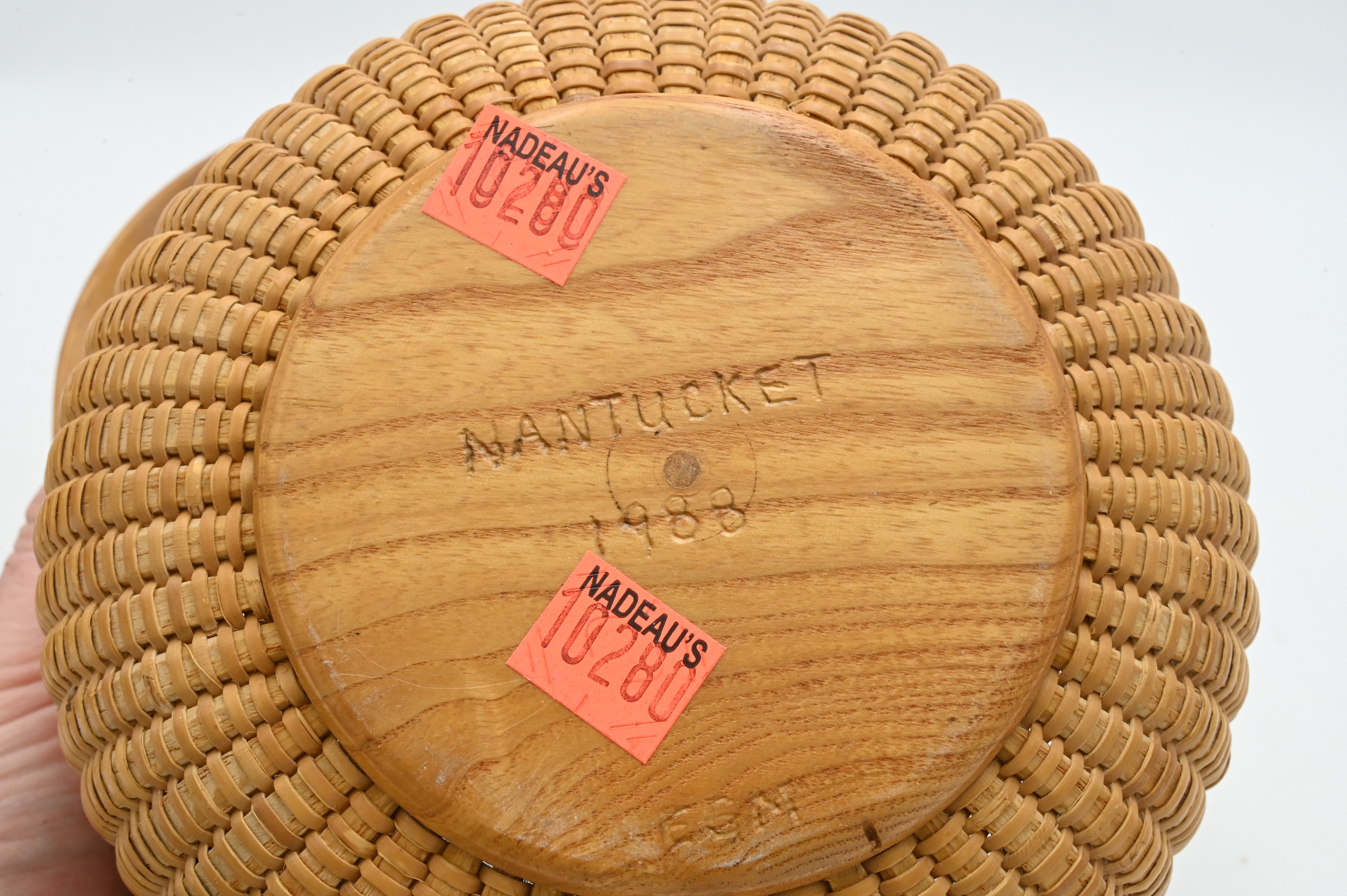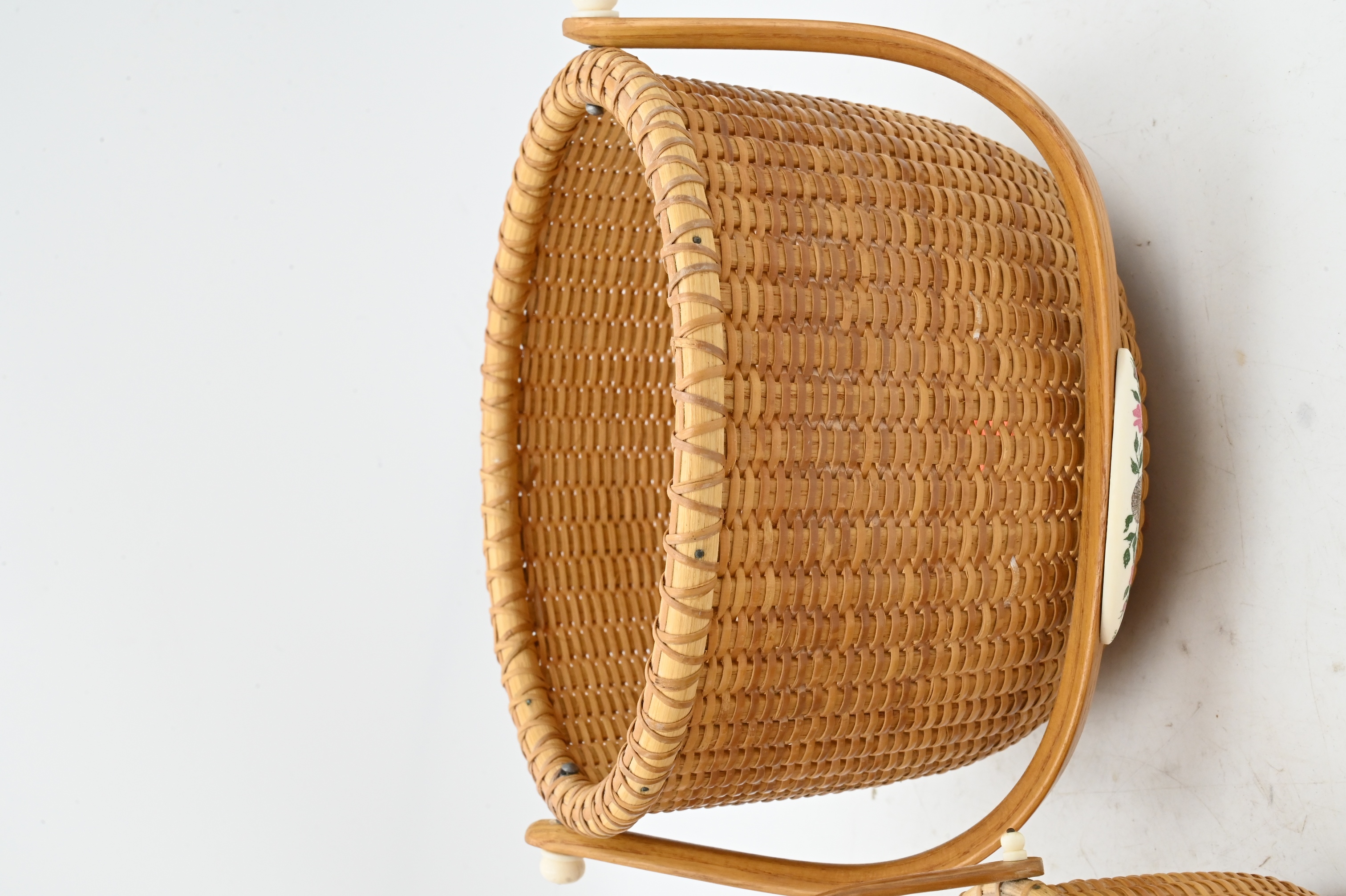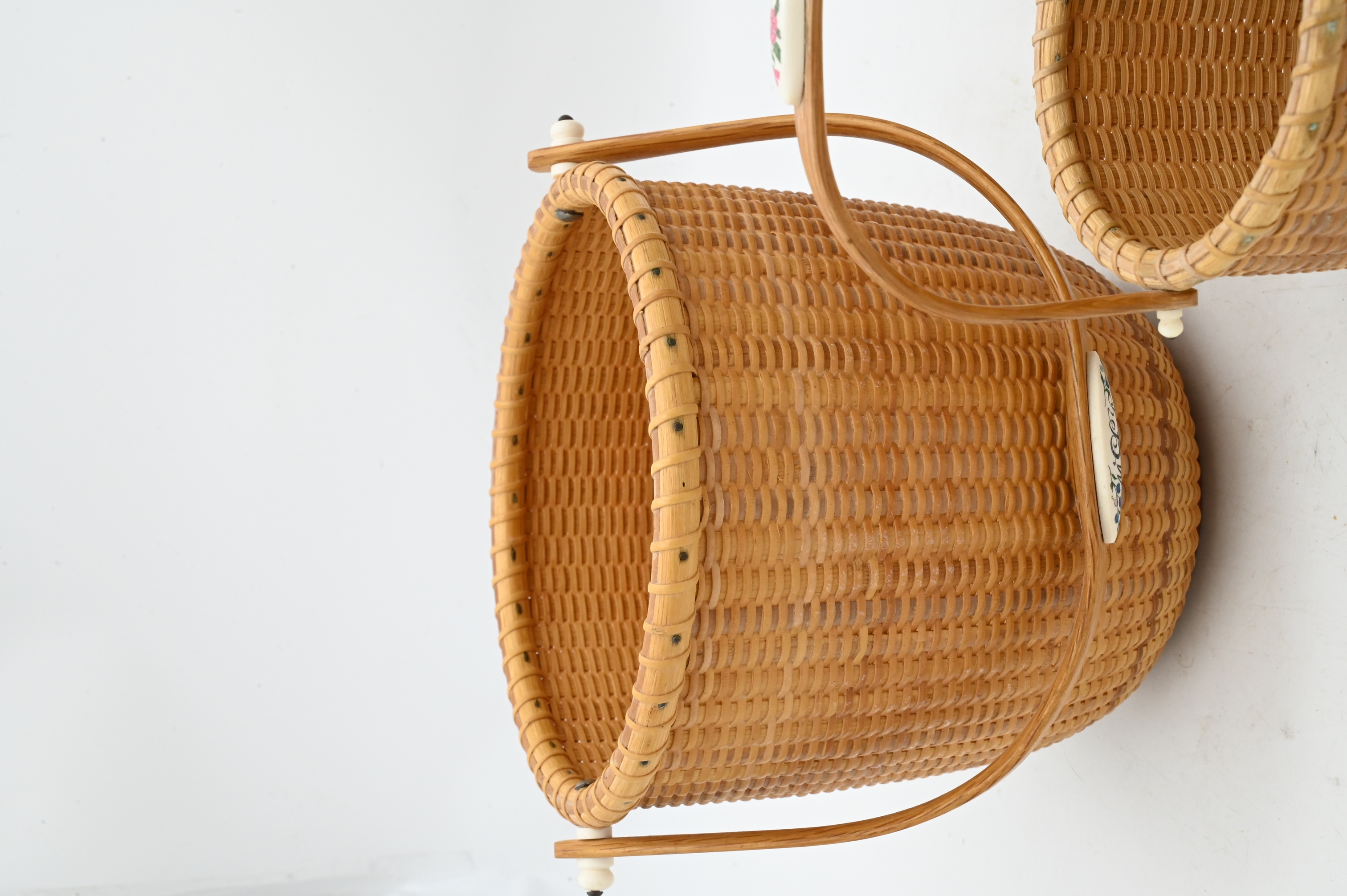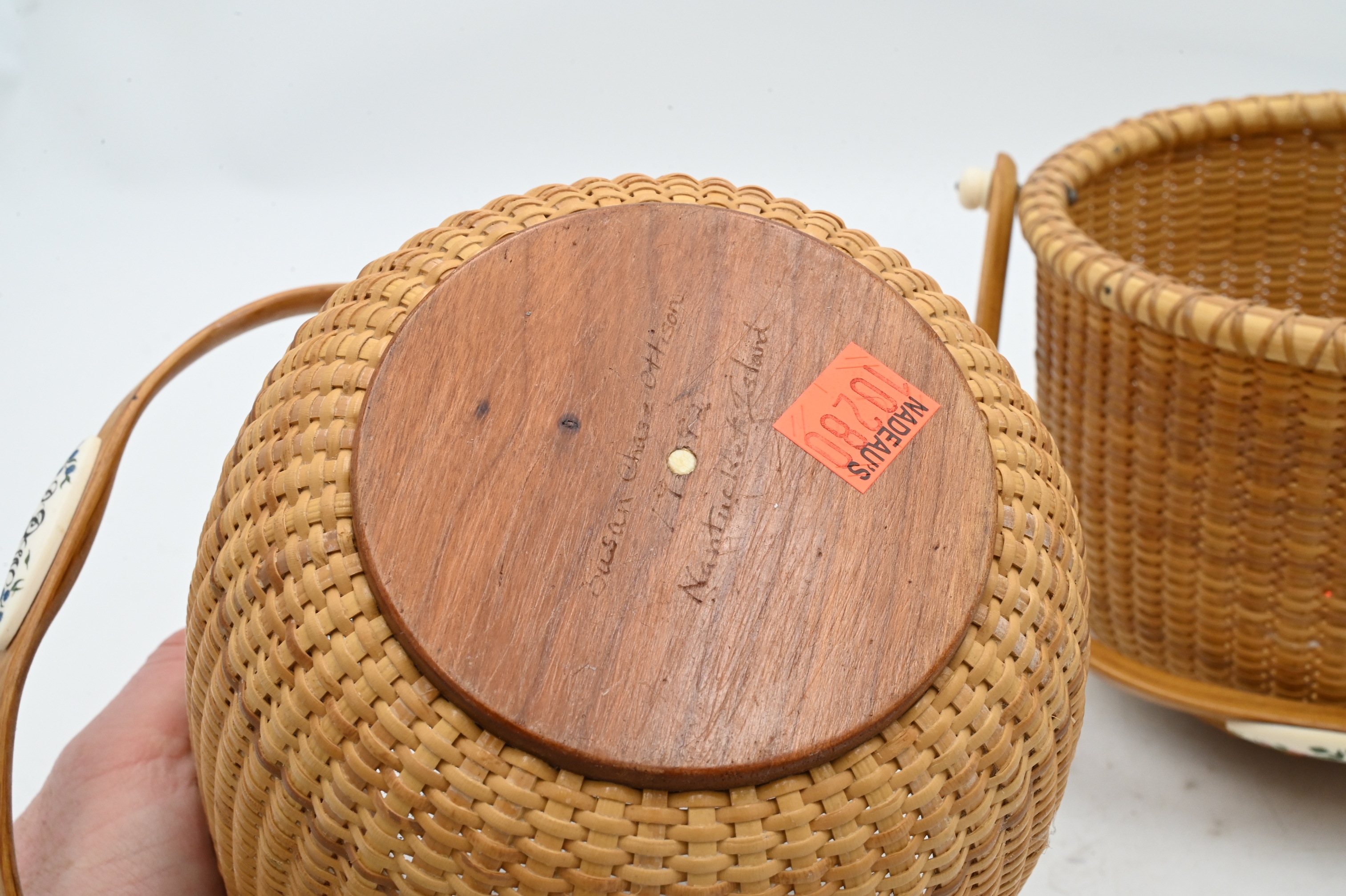two Susan Chase Ottison baskets, one smaller basket signed and dated “Susan Chase Ottison 1990 Nantucket Island” height 3 1/4 inches, diameter 4 inches, one larger signed and dates “Susan Chase Ottison 1992 Nantucket Island” height 6 inches, diameter 6 1/2 inches, the other basket initialed “EGM Nantucket 1988” height 5 1/2 inches, diameter 7 inches, each with scrimshaw accents on the handles