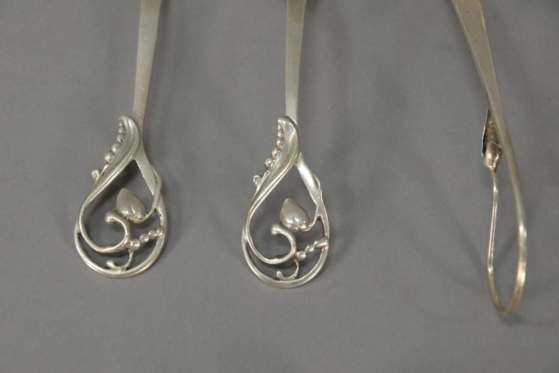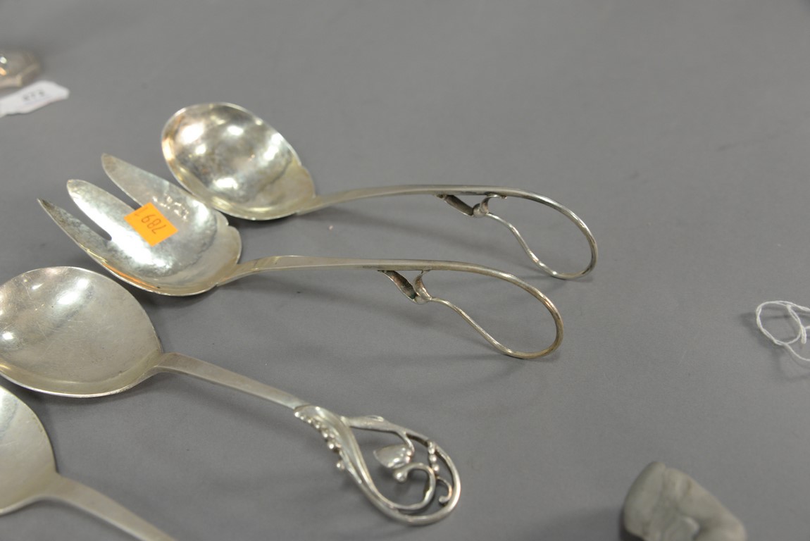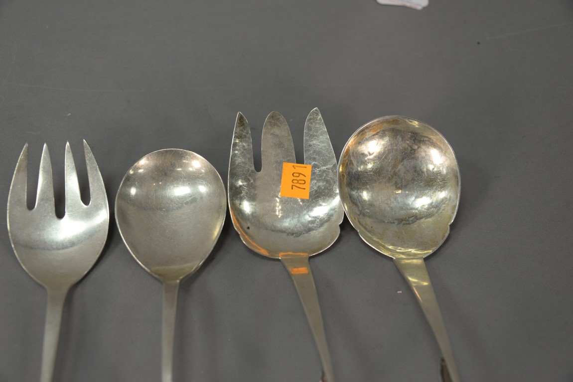 Two pairs of sterling silver salad serving sets, one hand hammered marked PR. lg. 8in.-9in. 11 troy ounces