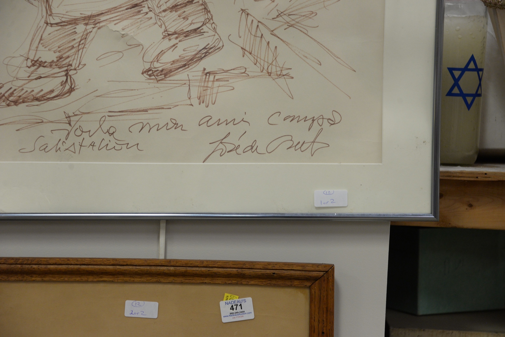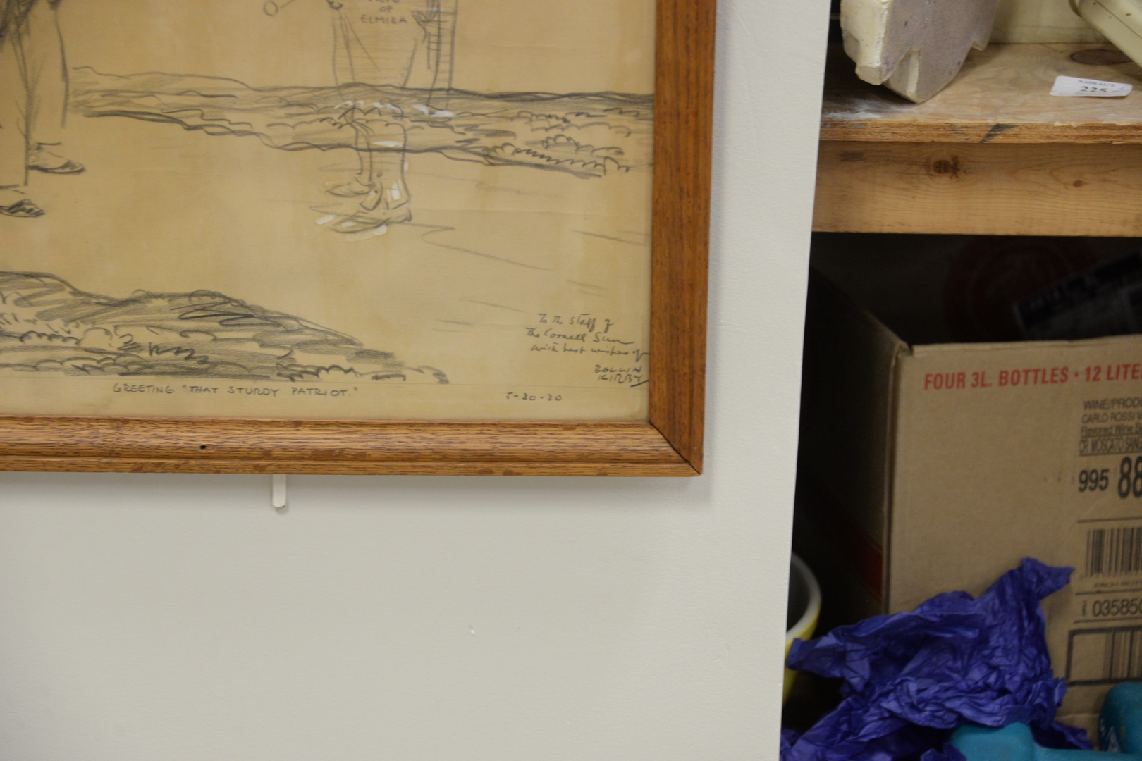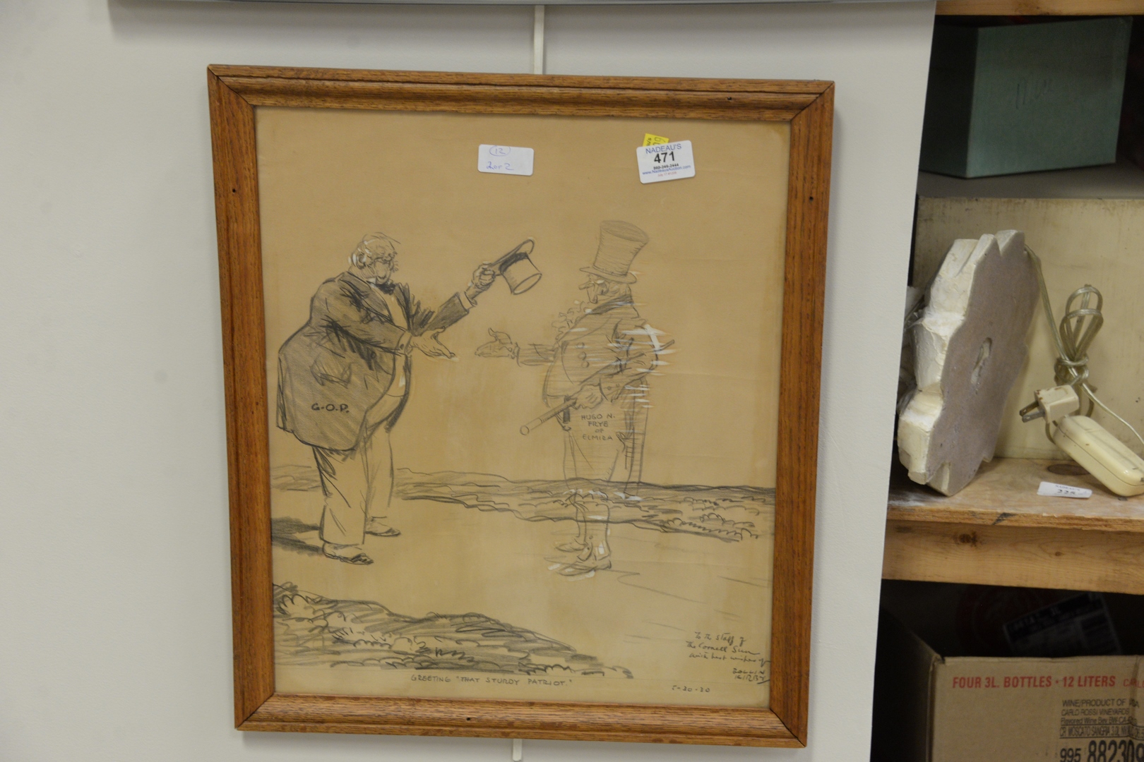 Lot 471: Two Piece Group of Satirical Illustrations, to include a Rollin Kirby “Greeting that Sturdy Patriot”, charcoal on paper, signed, titled, inscribed, and dated “5-30-30” along the lower edge; along with a New York City illustration “Books Very Exciting” inscribed indistinctly along the edge, sight size of largest 24 1/2″ x 19″.