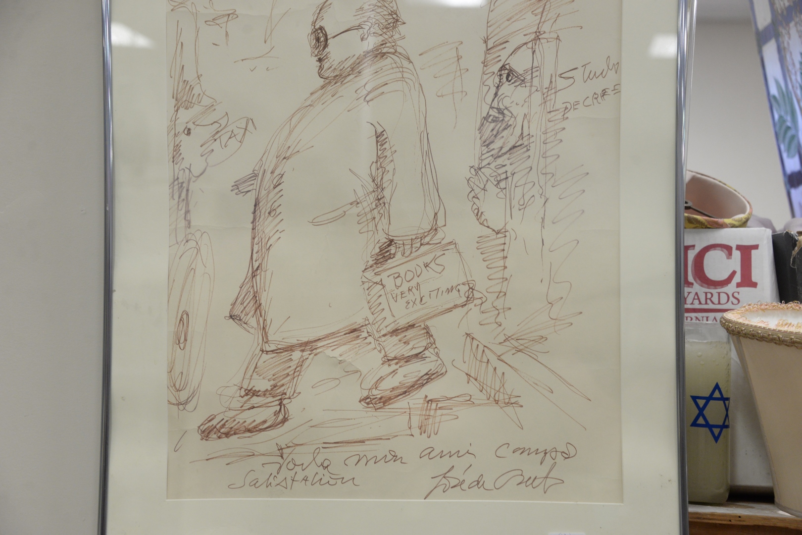 Two Piece Group of Satirical Illustrations, to include a Rollin Kirby “Greeting that Sturdy Patriot”, charcoal on paper, signed, titled, inscribed, and dated “5-30-30” along the lower edge; along with a New York City illustration “Books Very Exciting” inscribed indistinctly along the edge, sight size of largest 24 1/2″ x 19″.