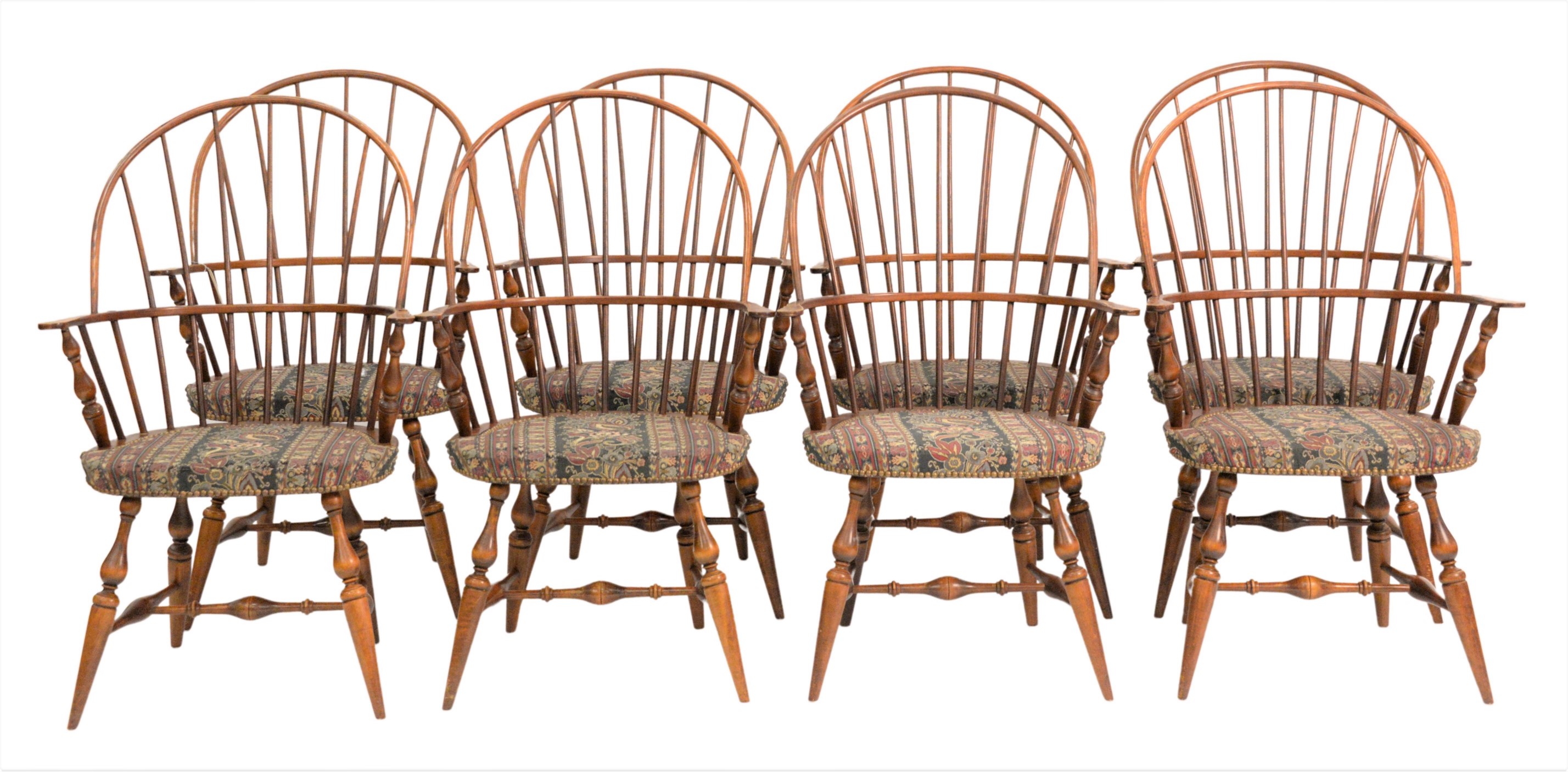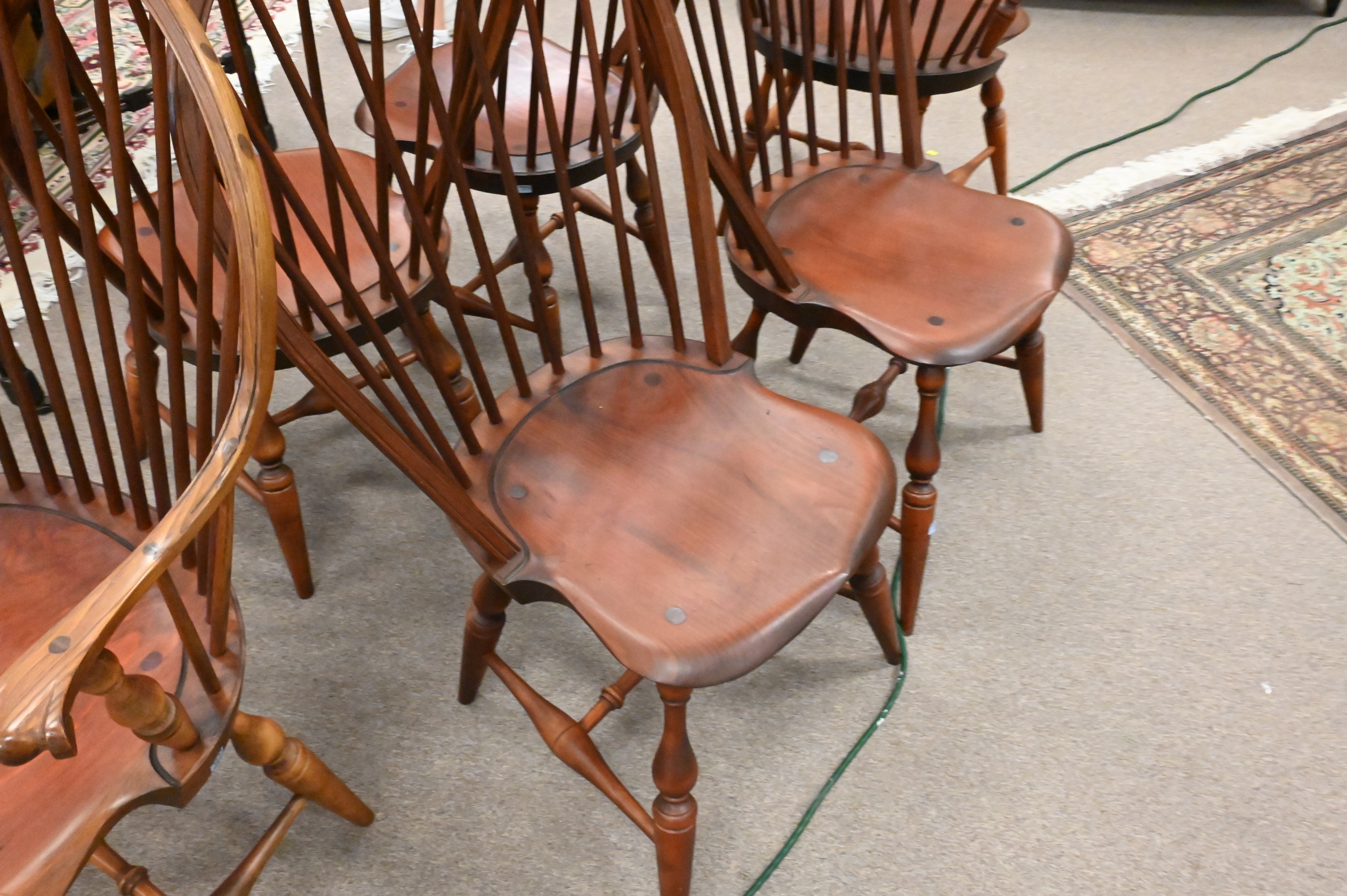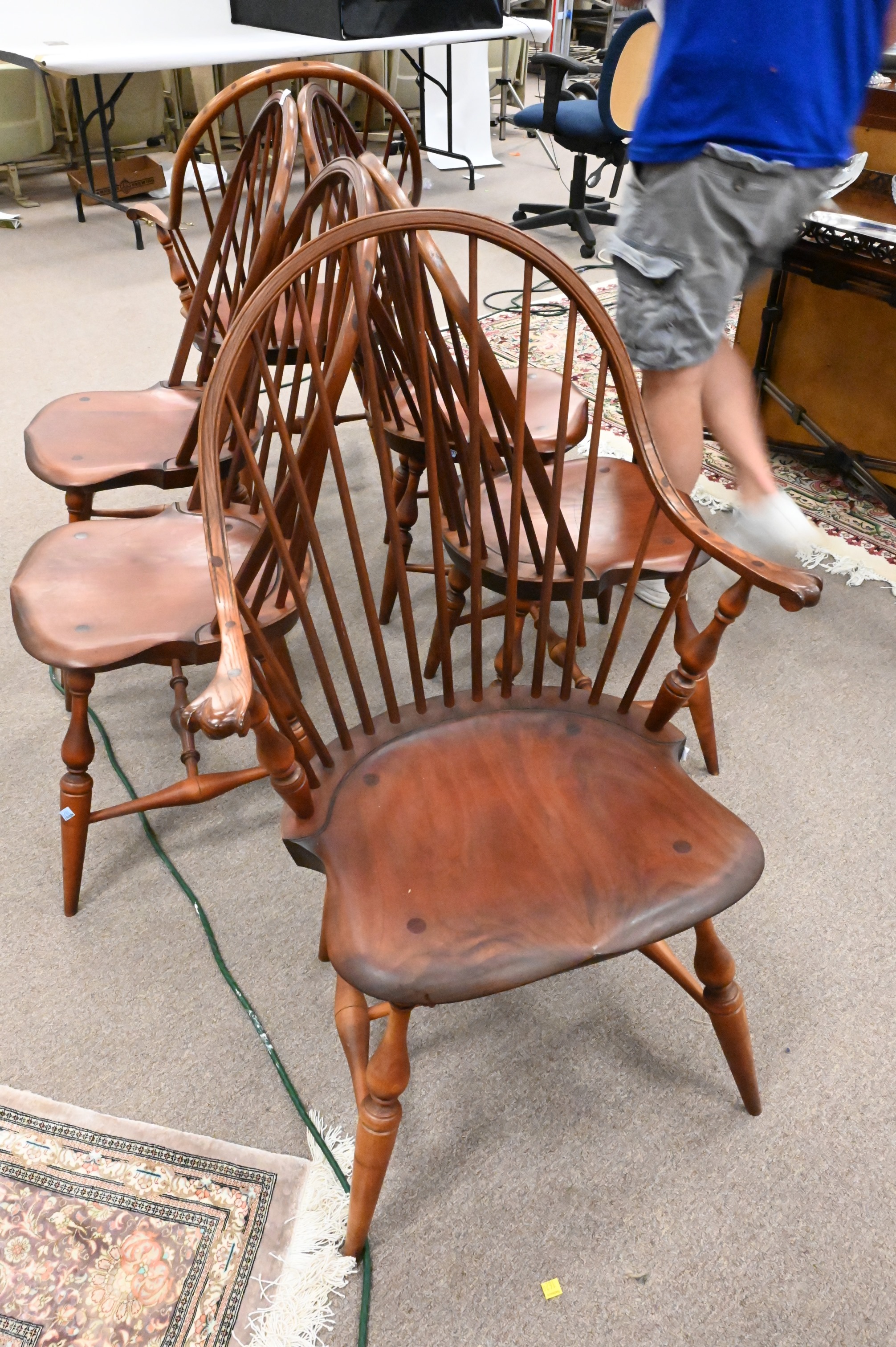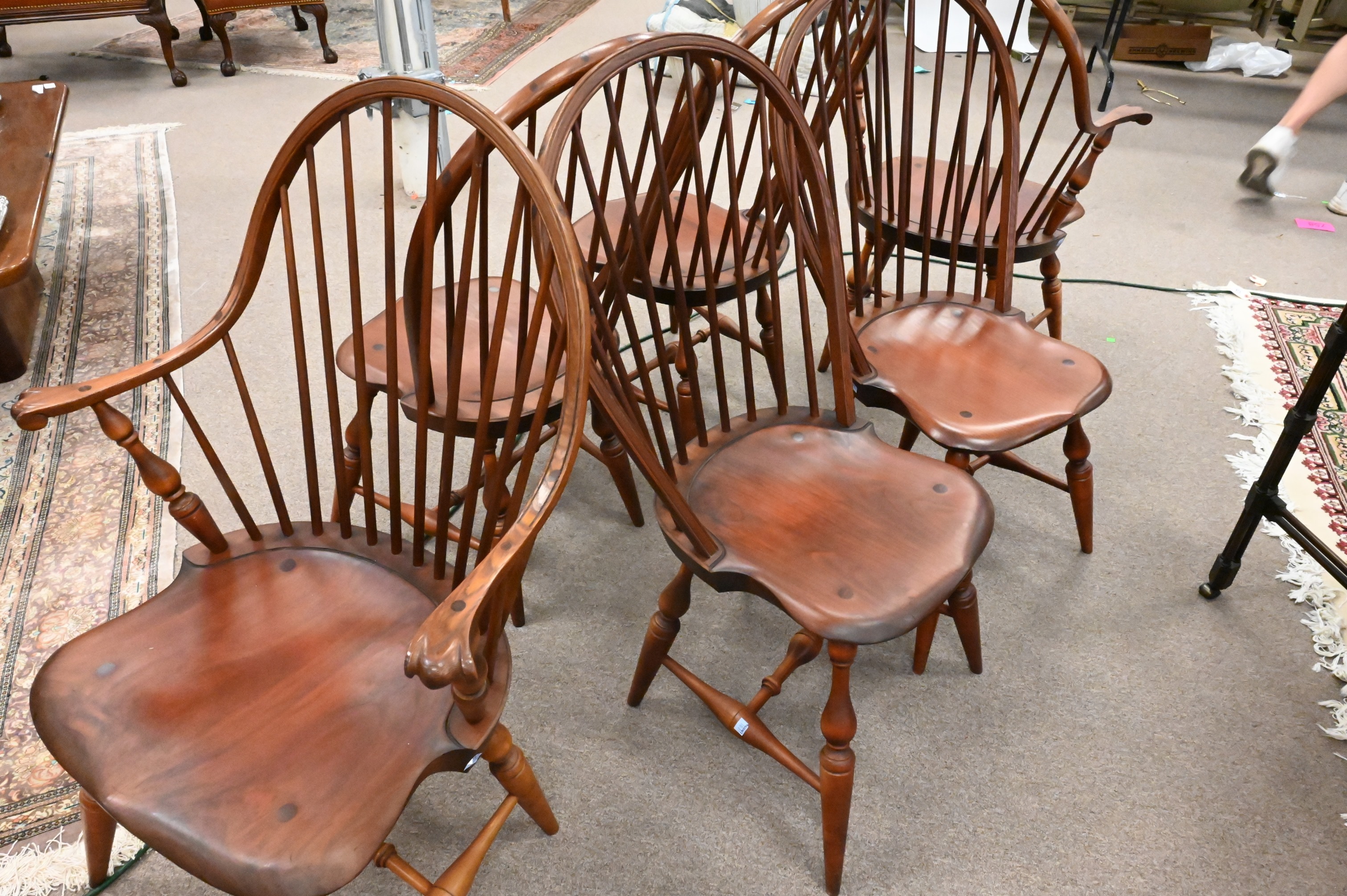 Warren Chair Works Set of Six Windsor Style Chairs, having two with continuous arms, along with four bow back side chairs, height 39 inches.