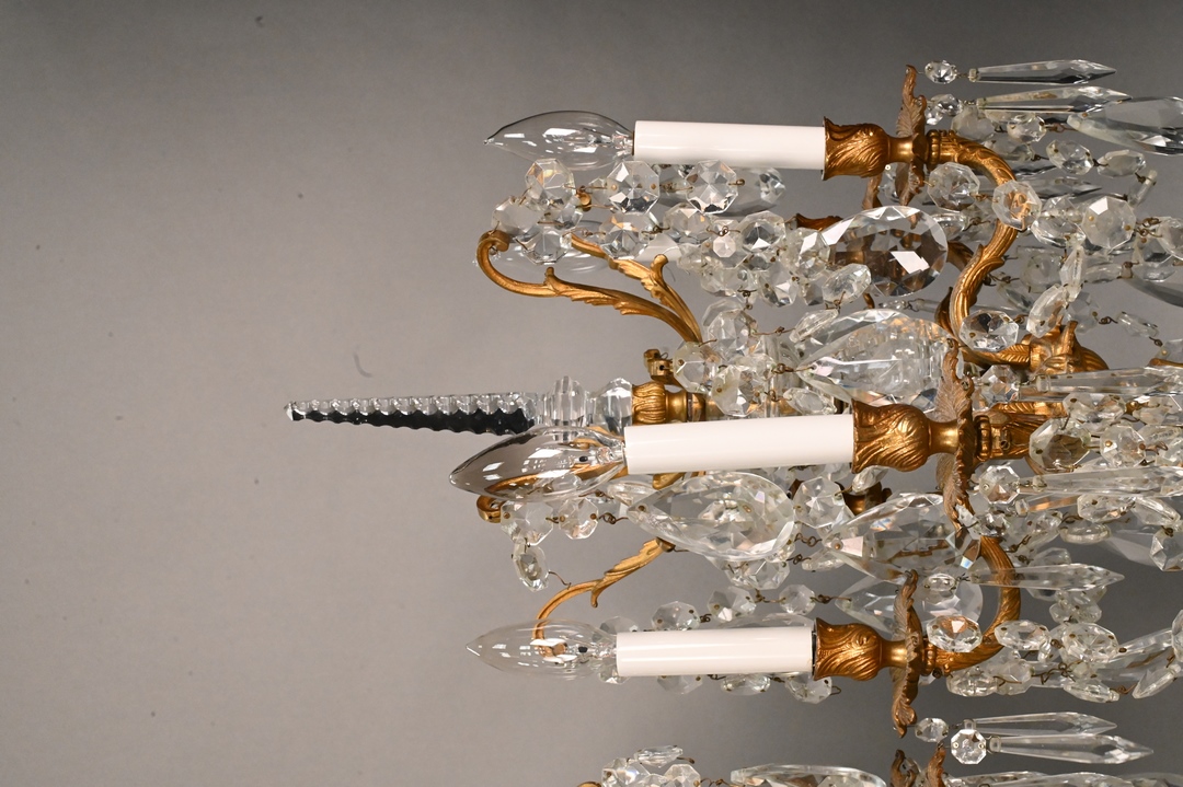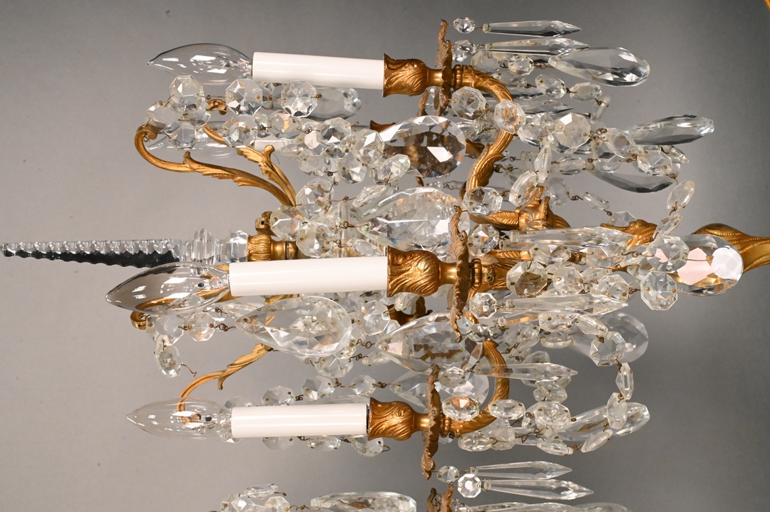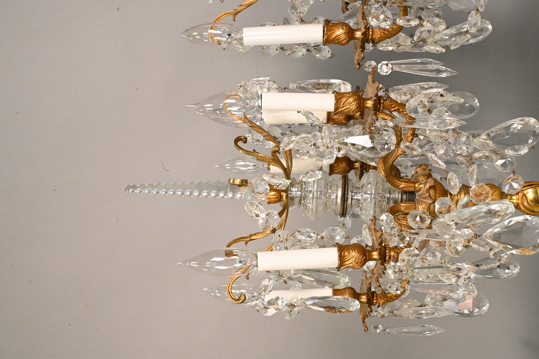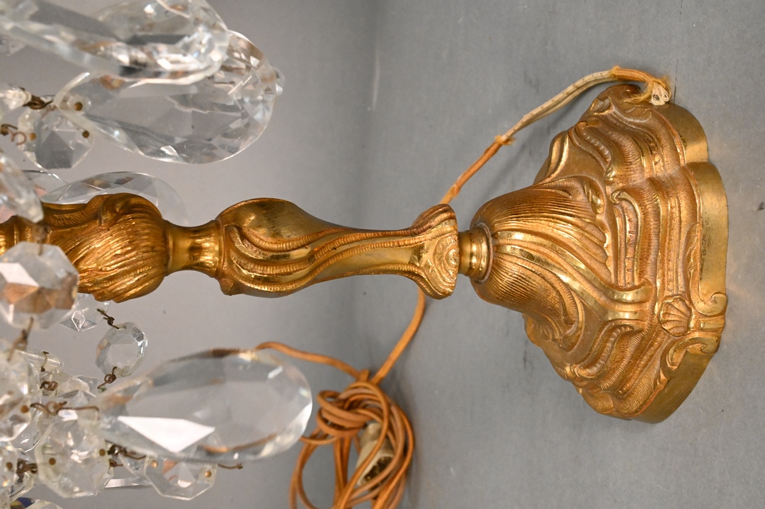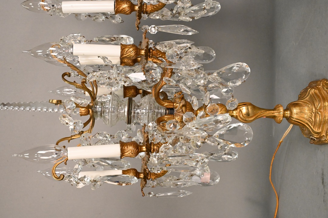 Condition: overall fair condition, internally wired, some chips and losses to glass prisms, rubbing to gilded areas