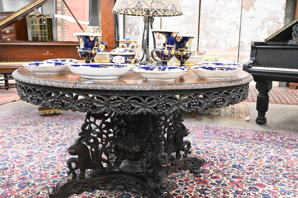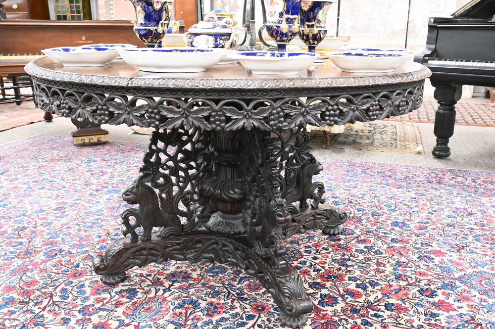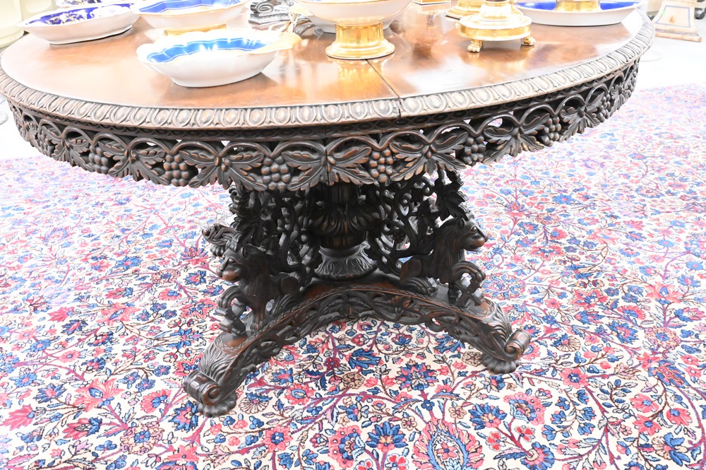 Lot 472: Anglo Indian Tip Table, having carved skirt and base carved with foo dogs, crack in top, height 30 1/2 inches, diameter 52 inches.