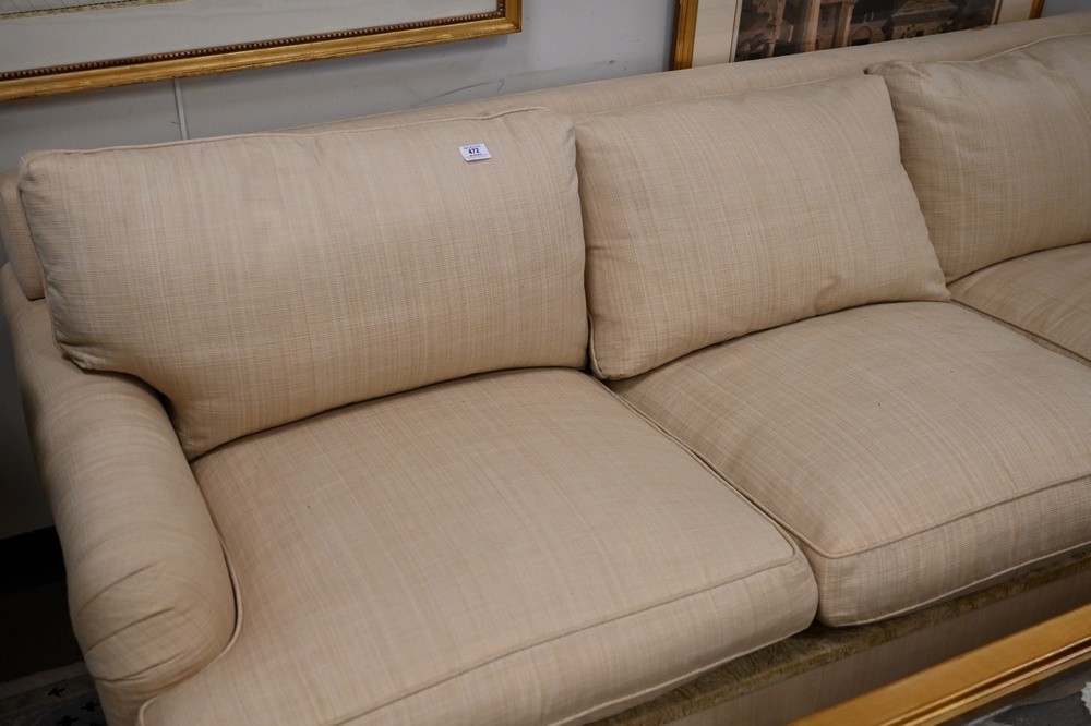 Lot 472: Avery Boardman Upholstered Three-Cushion Sofa, height 29 inches, length 85 inches, (very clean).