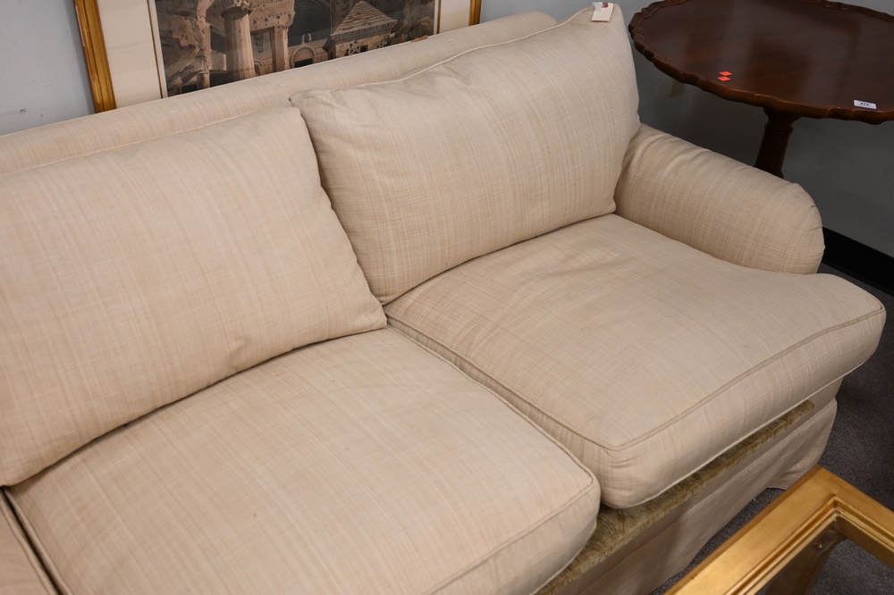Avery Boardman Upholstered Three-Cushion Sofa, height 29 inches, length 85 inches, (very clean).