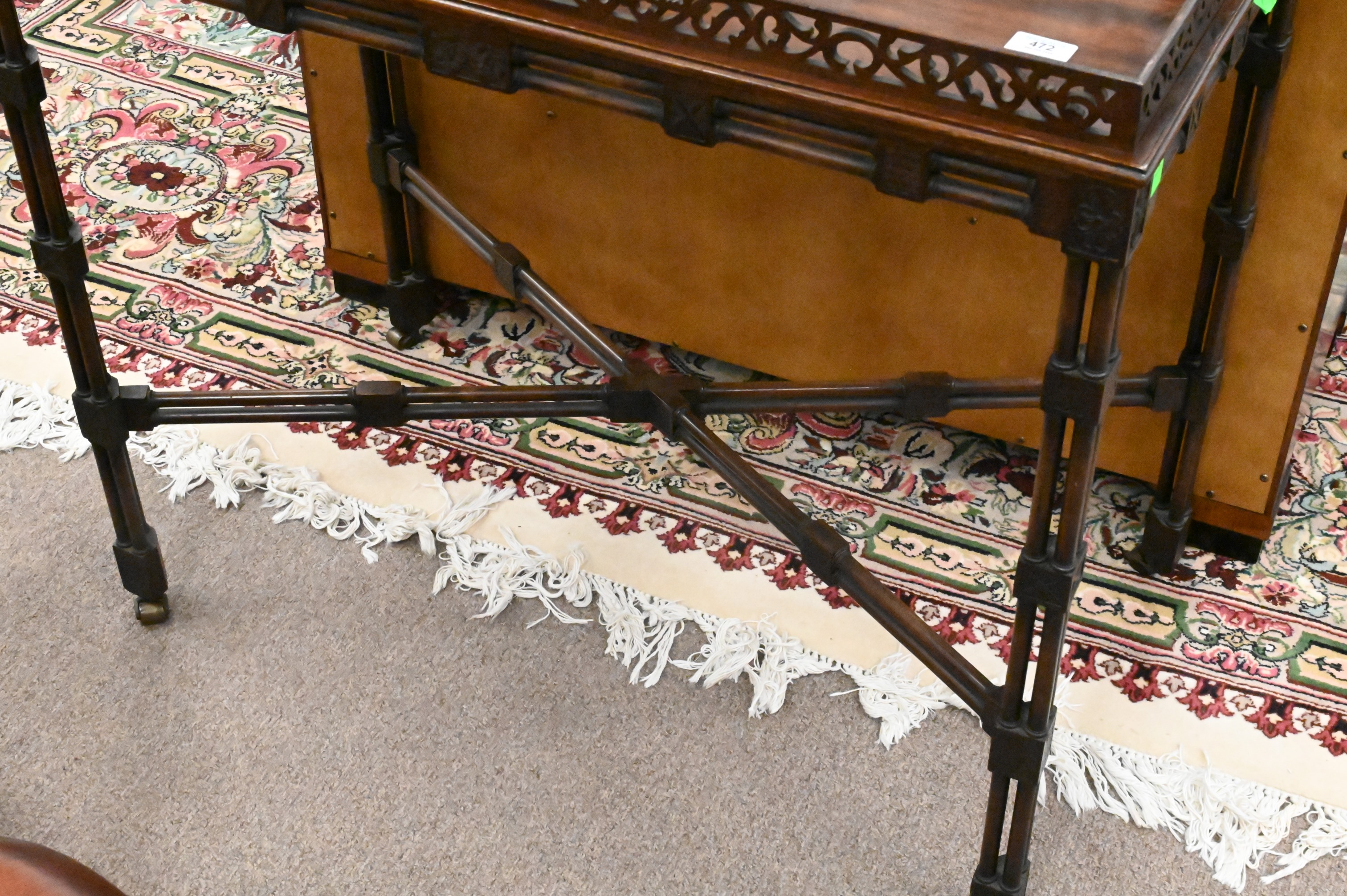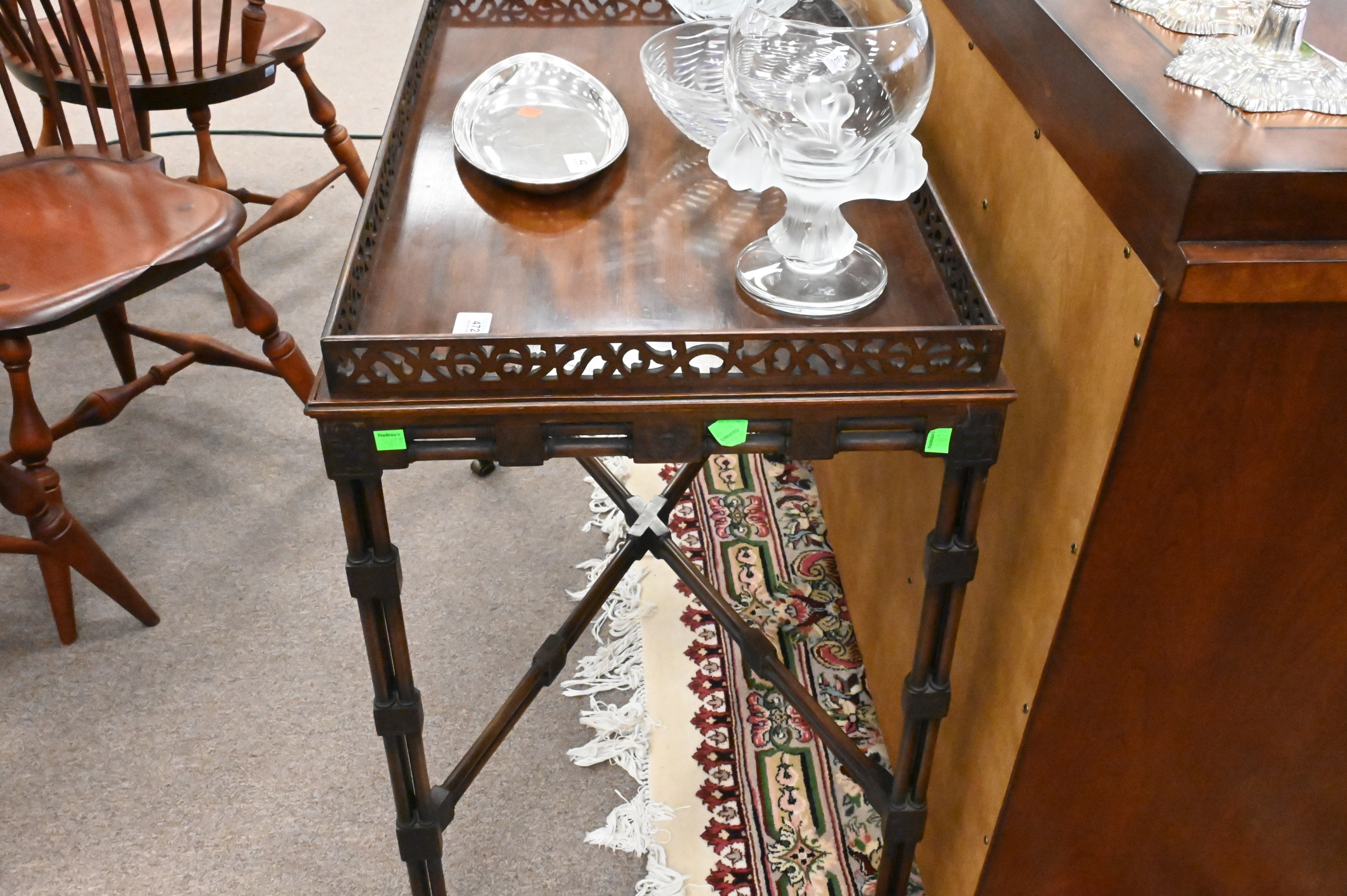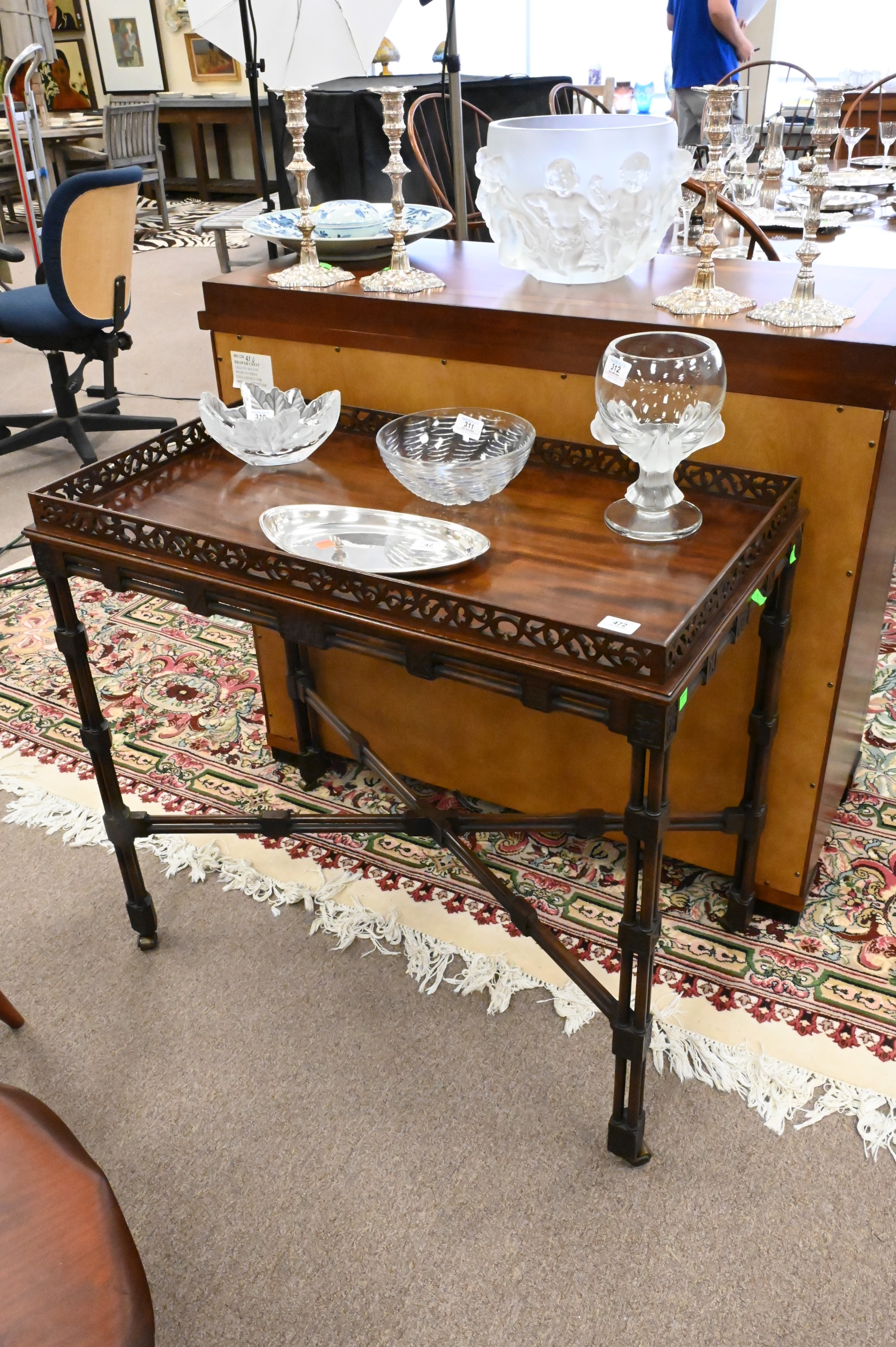 Chinese Chippendale Style Mahogany Carved Center Table, having reticulated gallery over carved frieze and X stretcher, height 31 inches, Top 33 inches x 18 inches.