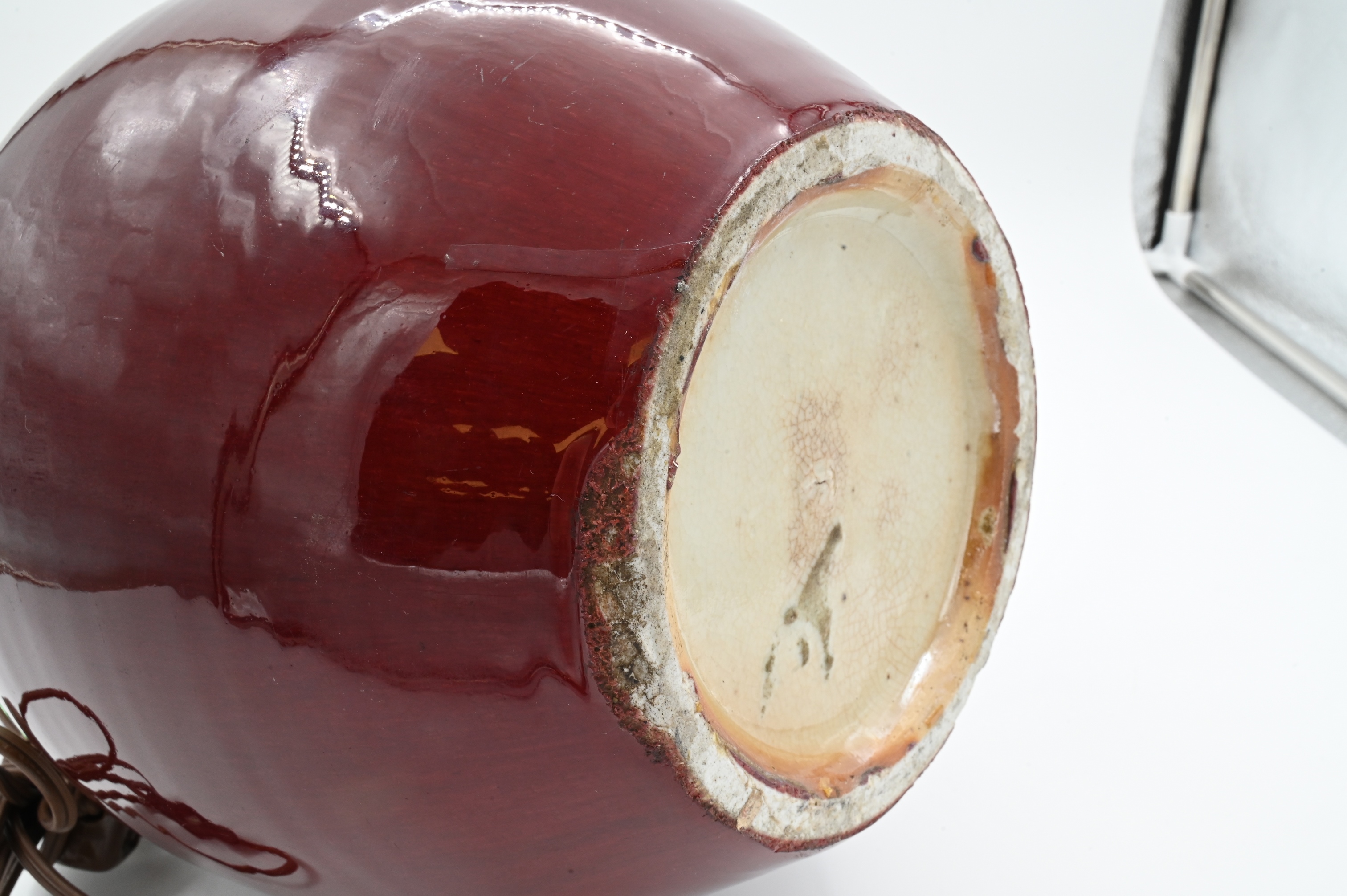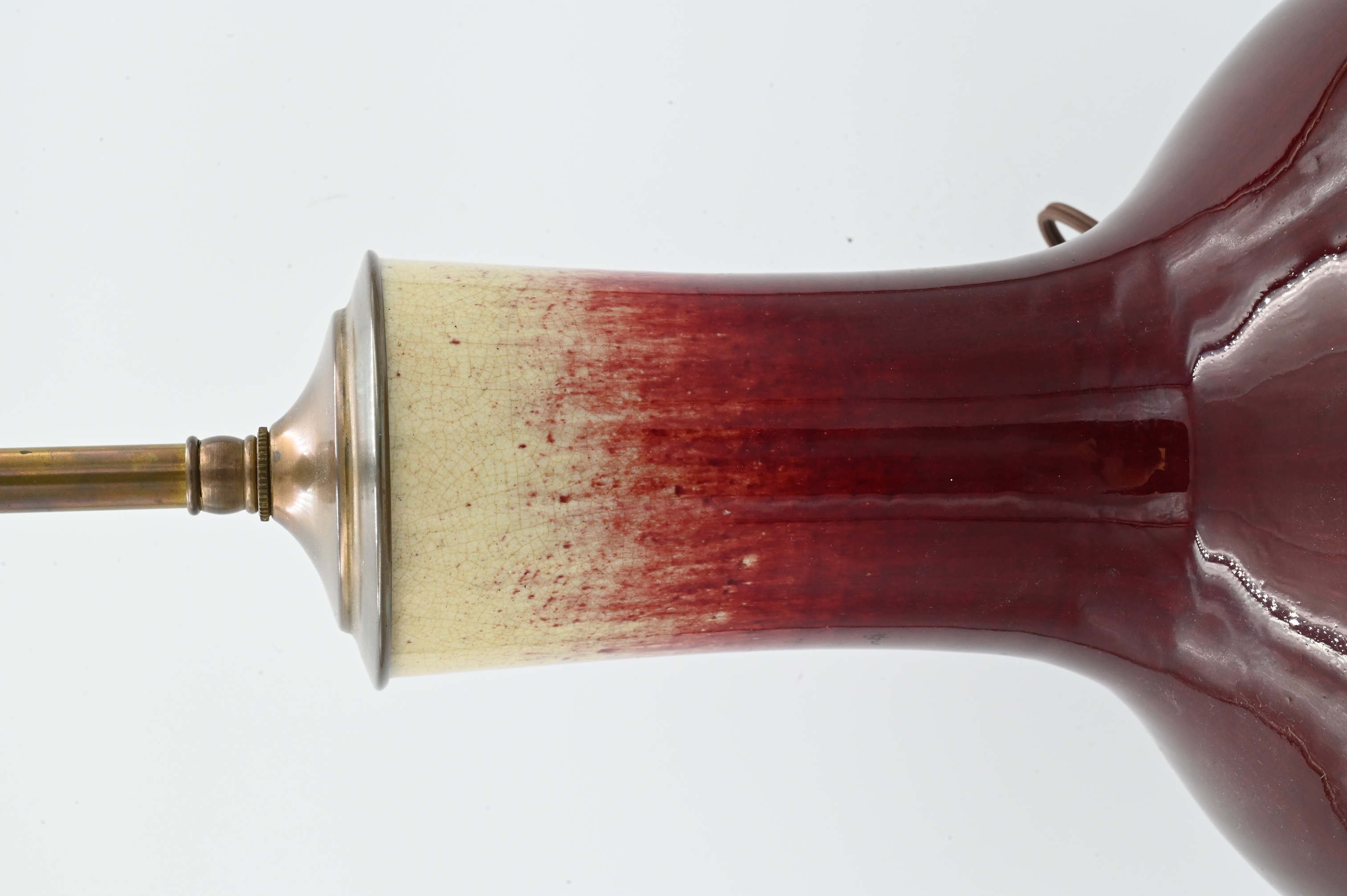 of bottle form having pale celadon at the neck, “Sang de Boeuf” glaze now mounted as a table lamp, 19th century