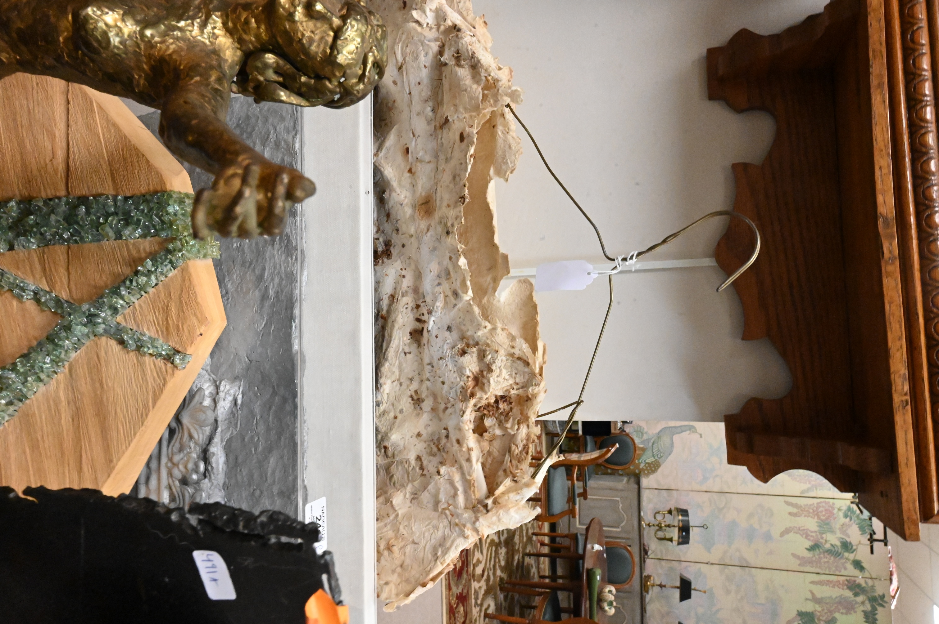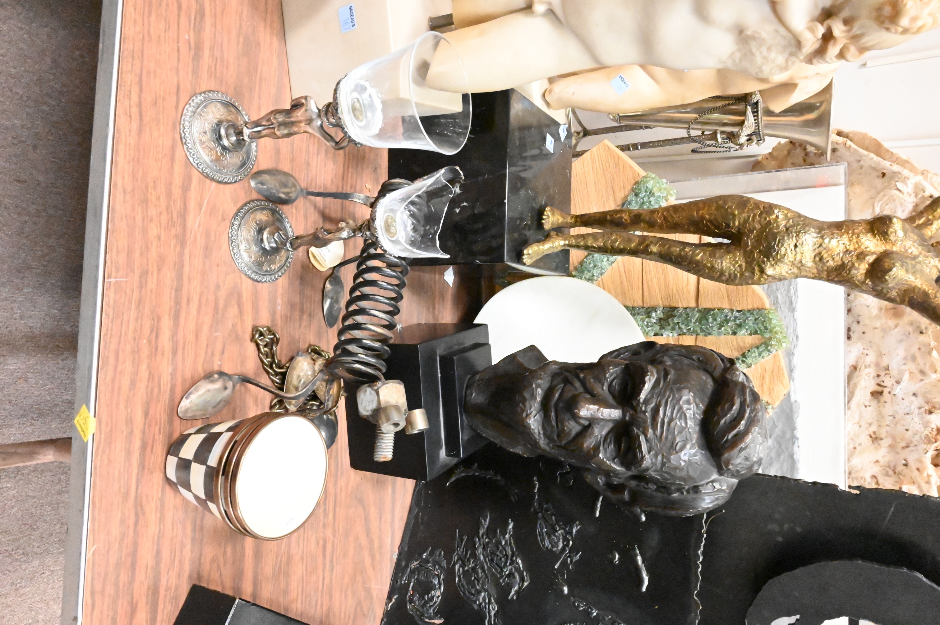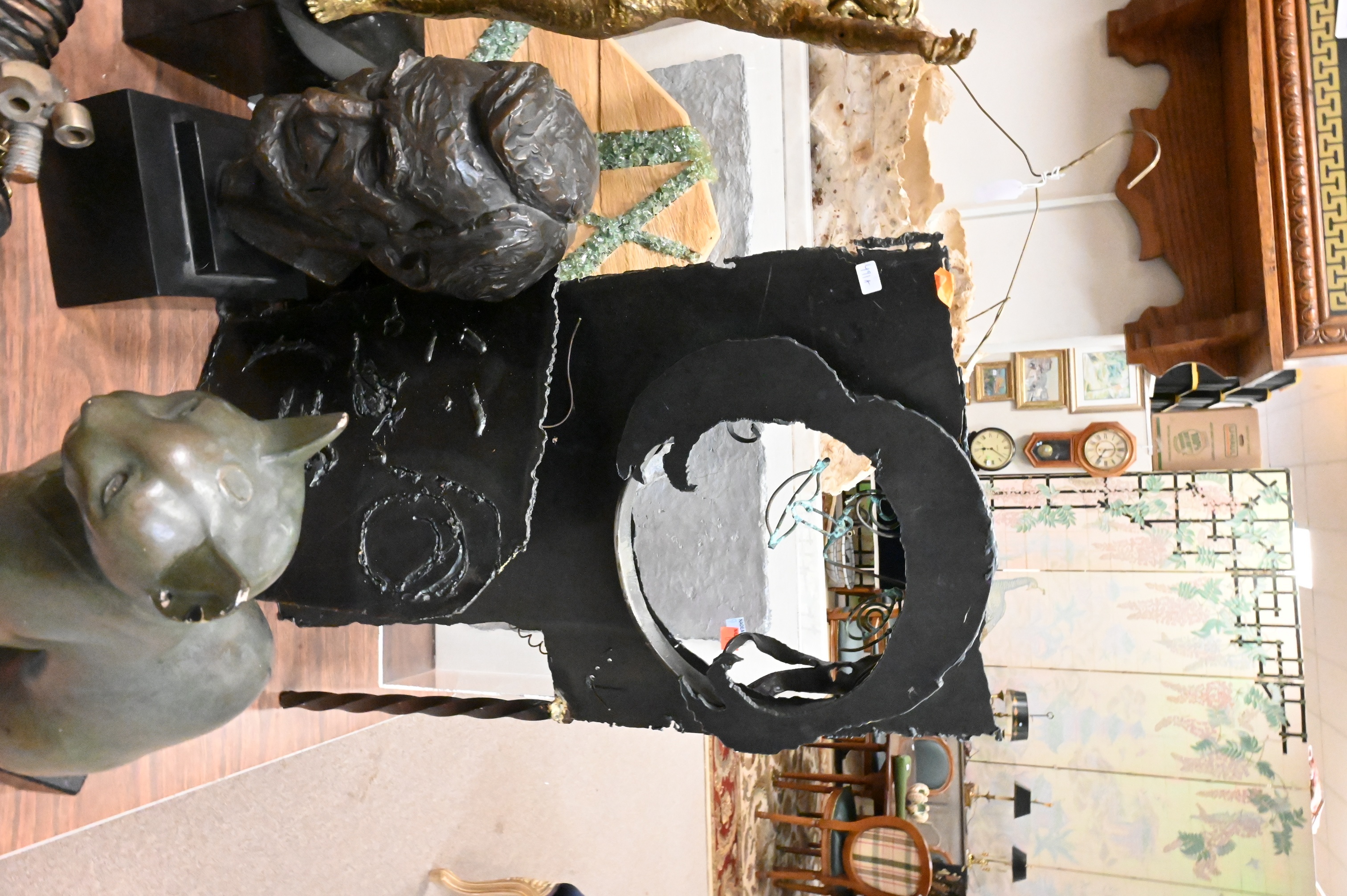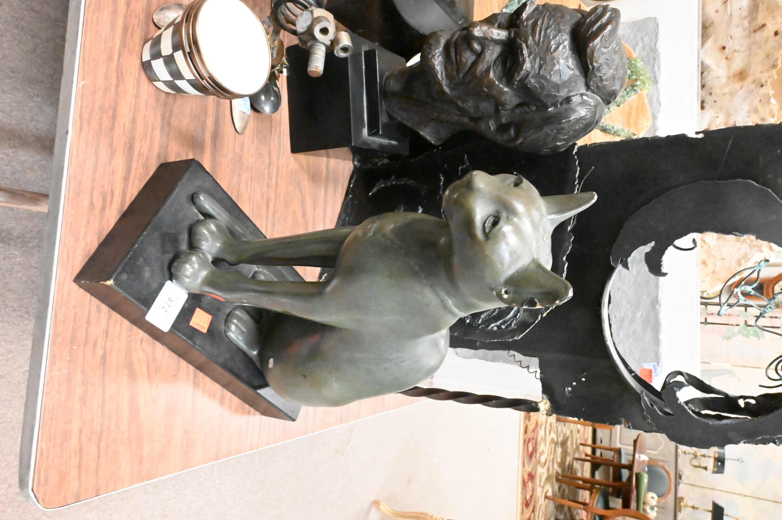 Leo Cherne (American 1912 – 1999) bronzed resin bust of Abraham Lincoln, 1955, signed and dated to base, Alva Studios Egyptian cat figure after Egyptian sculpture of the Saite-Ptolemaic period (663-524 B.C.) after the original exhibited at the Louvre Museum in Paris, France, spoon sculpture by Darko Zadravec, Carol Gluck (20th Century) Metal sculpture of a woman’s face, handmade paper T-shirt on hanger, shadowbox skull face with plaque etc…