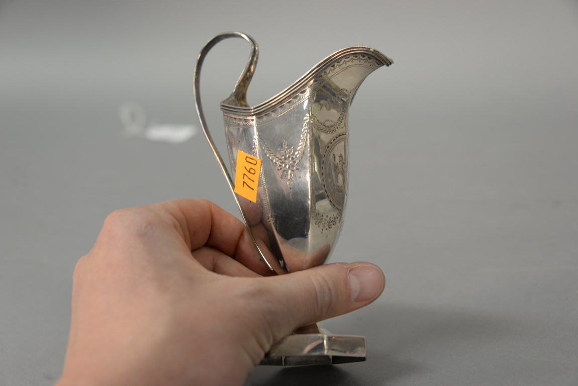 English silver creamer with simple handle with chased designs and eagle on front, on eight sided base. ht. 6 1/2 in. 4.2 troy ounces Provenance: The Estate of Natalie Rafferty