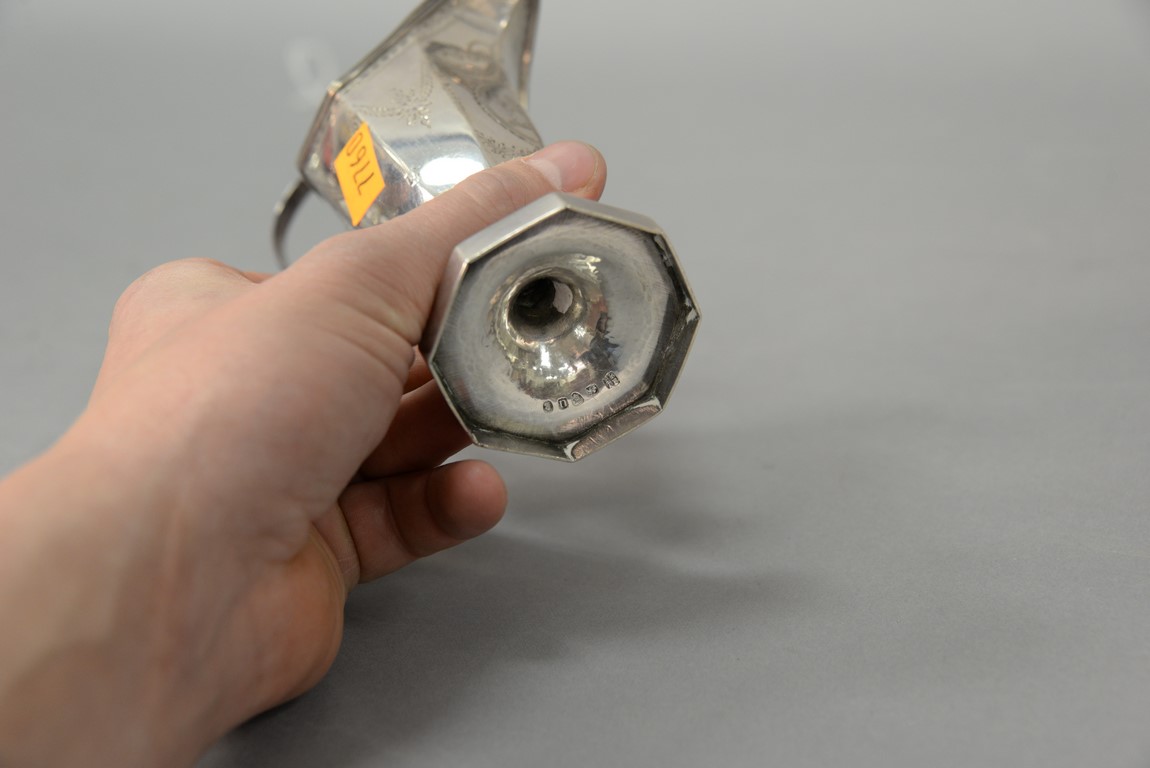 Lot 472: English silver creamer with simple handle with chased designs and eagle on front, on eight sided base. ht. 6 1/2 in. 4.2 troy…