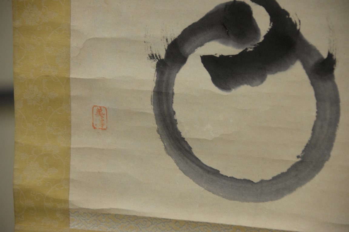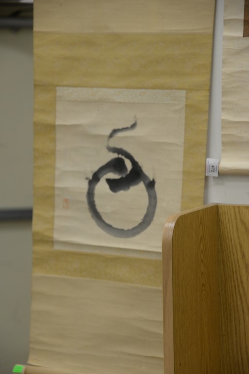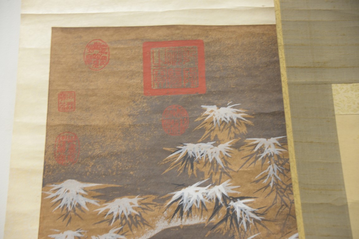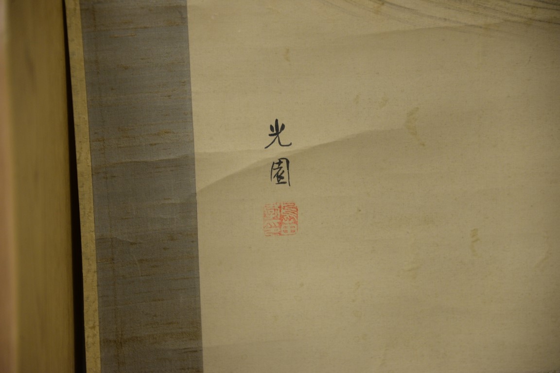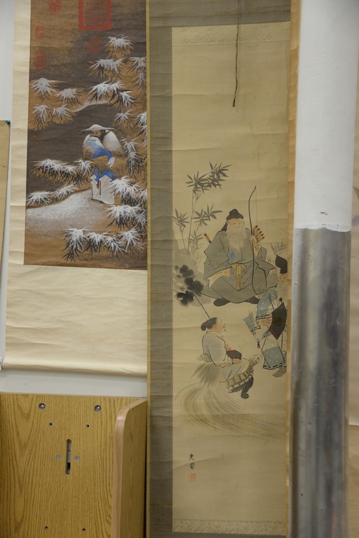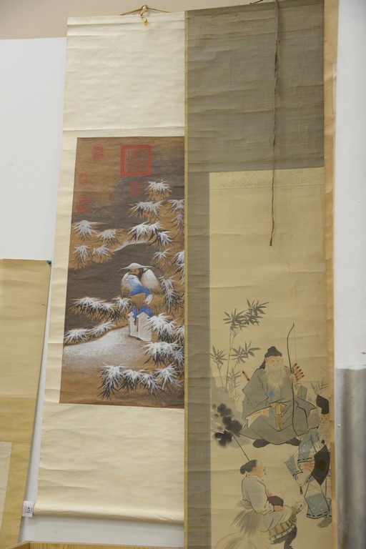 Five Oriental scrolls to include a watercolor on silk of scholars, two watercolors on paper of men, watercolor on paper of symbol, and watercolor on paper of iris. image sizes 14 x 12 to 50 x 16