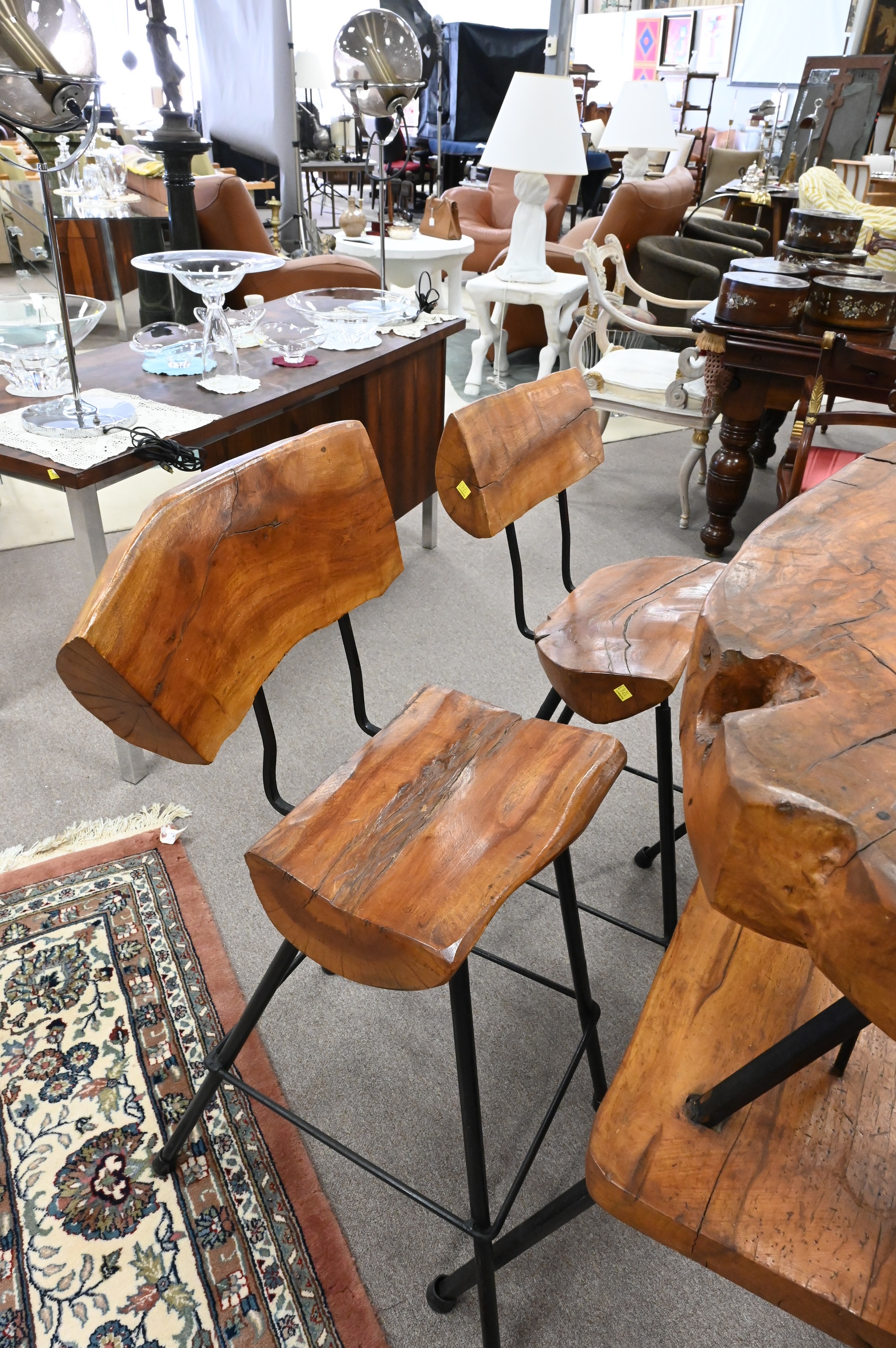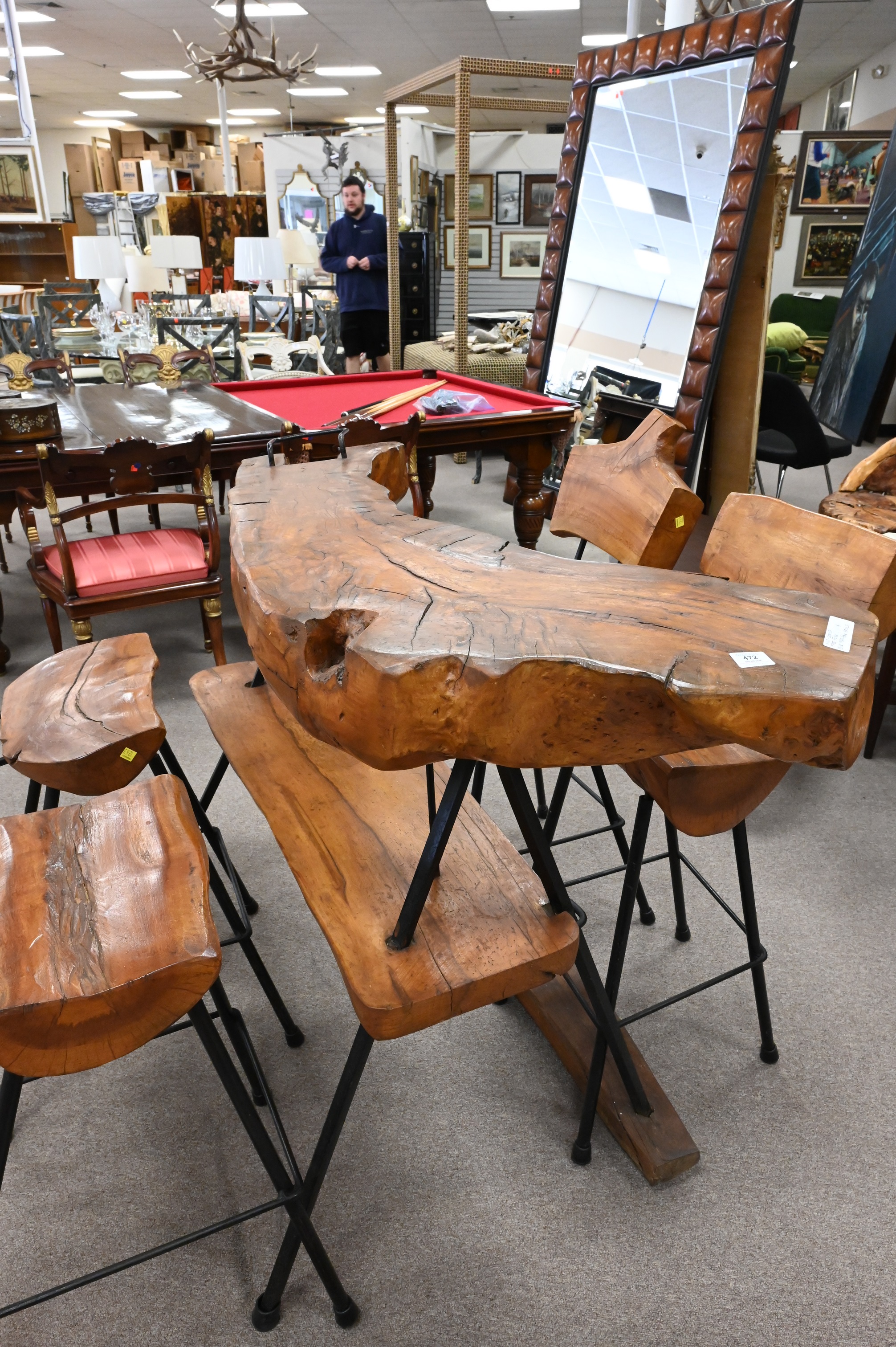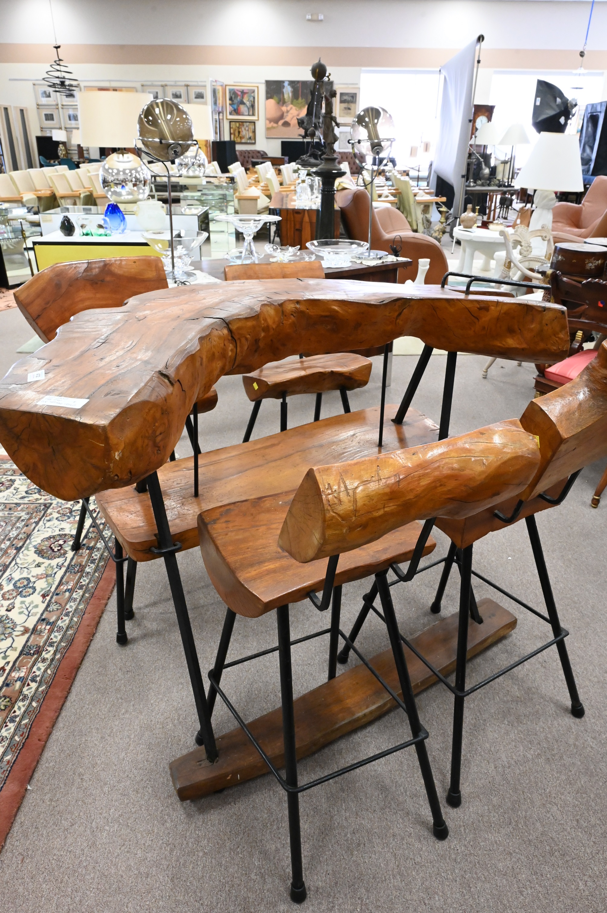 Five Piece Live Edge Bar and Bar Stools Set, to include four stools having heavy wrought iron legs, bar height 40 inches, stool height 42 inches, bar length 55 inches.