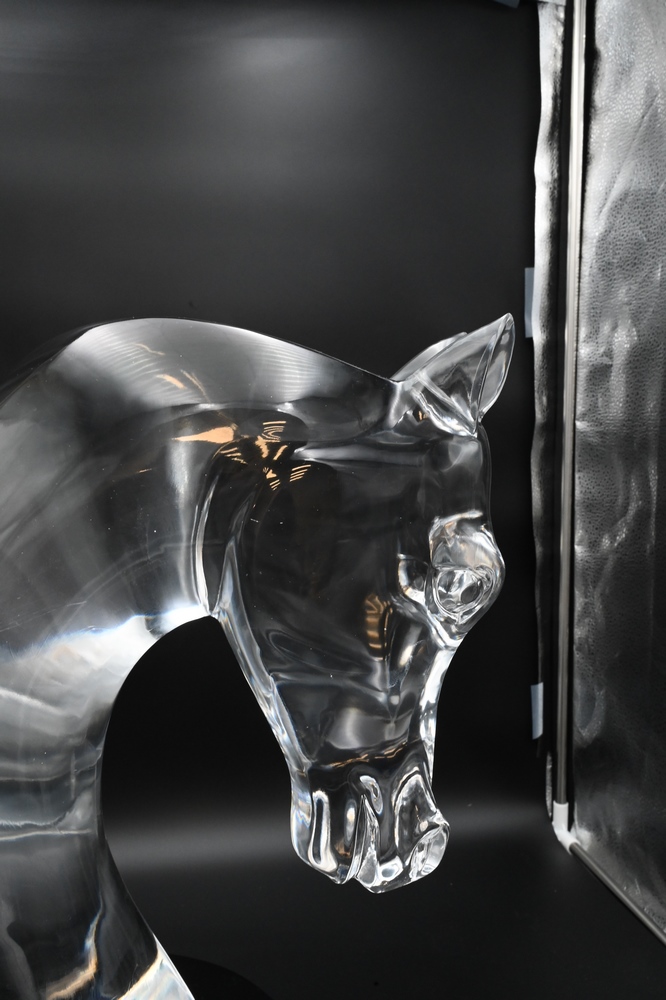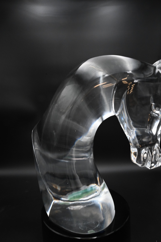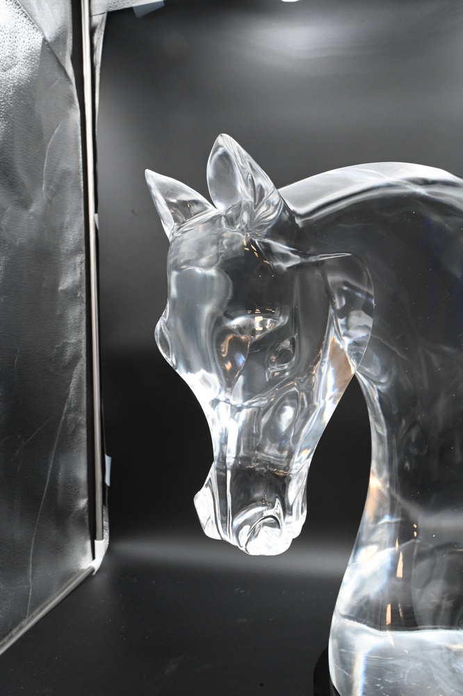 Lot 472: Lalique Cristal Tete De Cheval, horse head sculpture designed by Mark Lalique, 1953, on black granite base, marked Lalique in block …