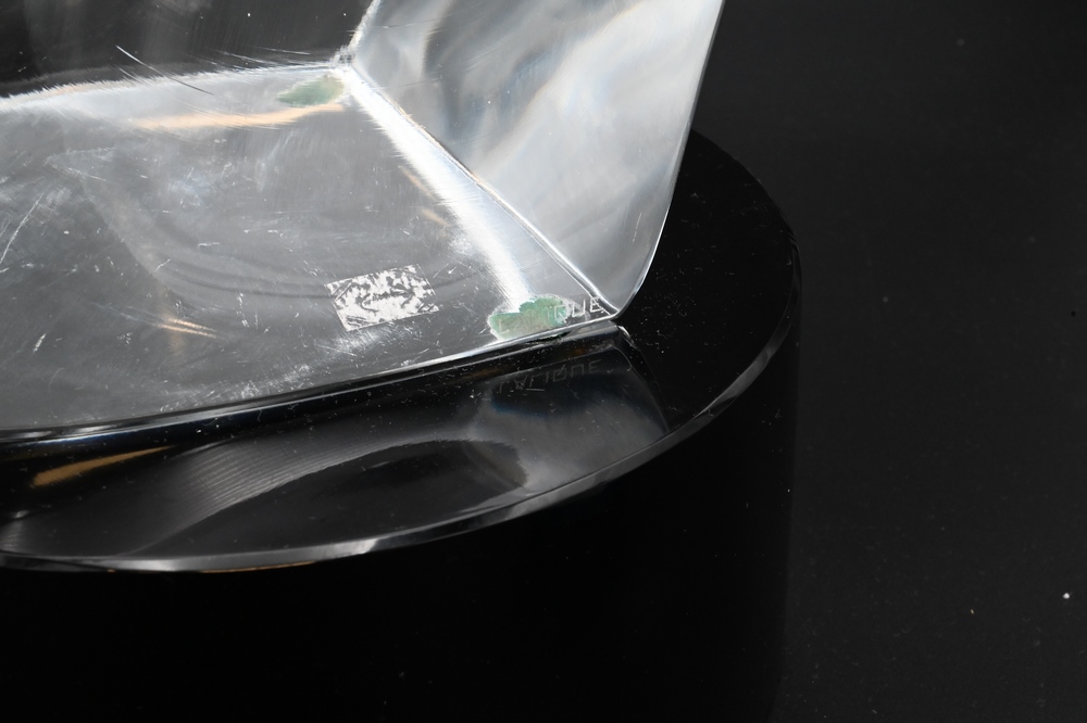 Lalique Cristal Tete De Cheval, horse head sculpture designed by Mark Lalique, 1953, on black granite base, marked Lalique in block lettering, height 19 1/4 inches plus 4 inch base, (minor chips on bottom edge).