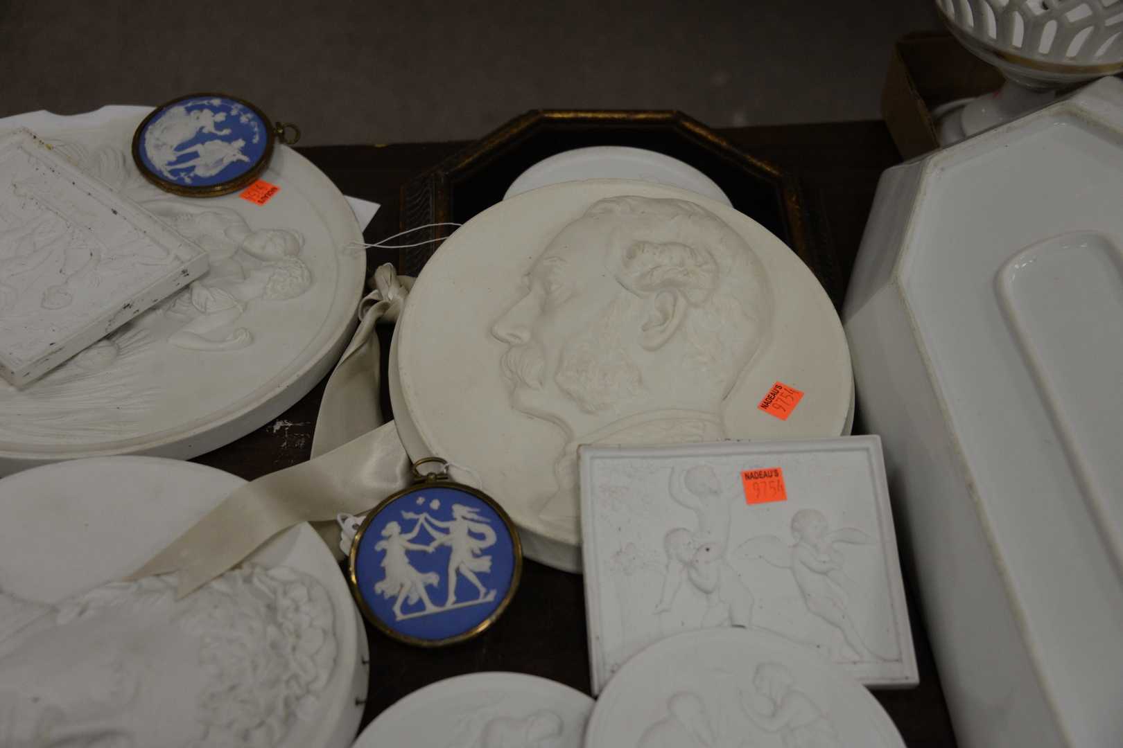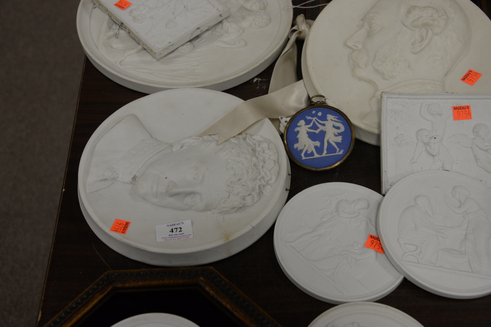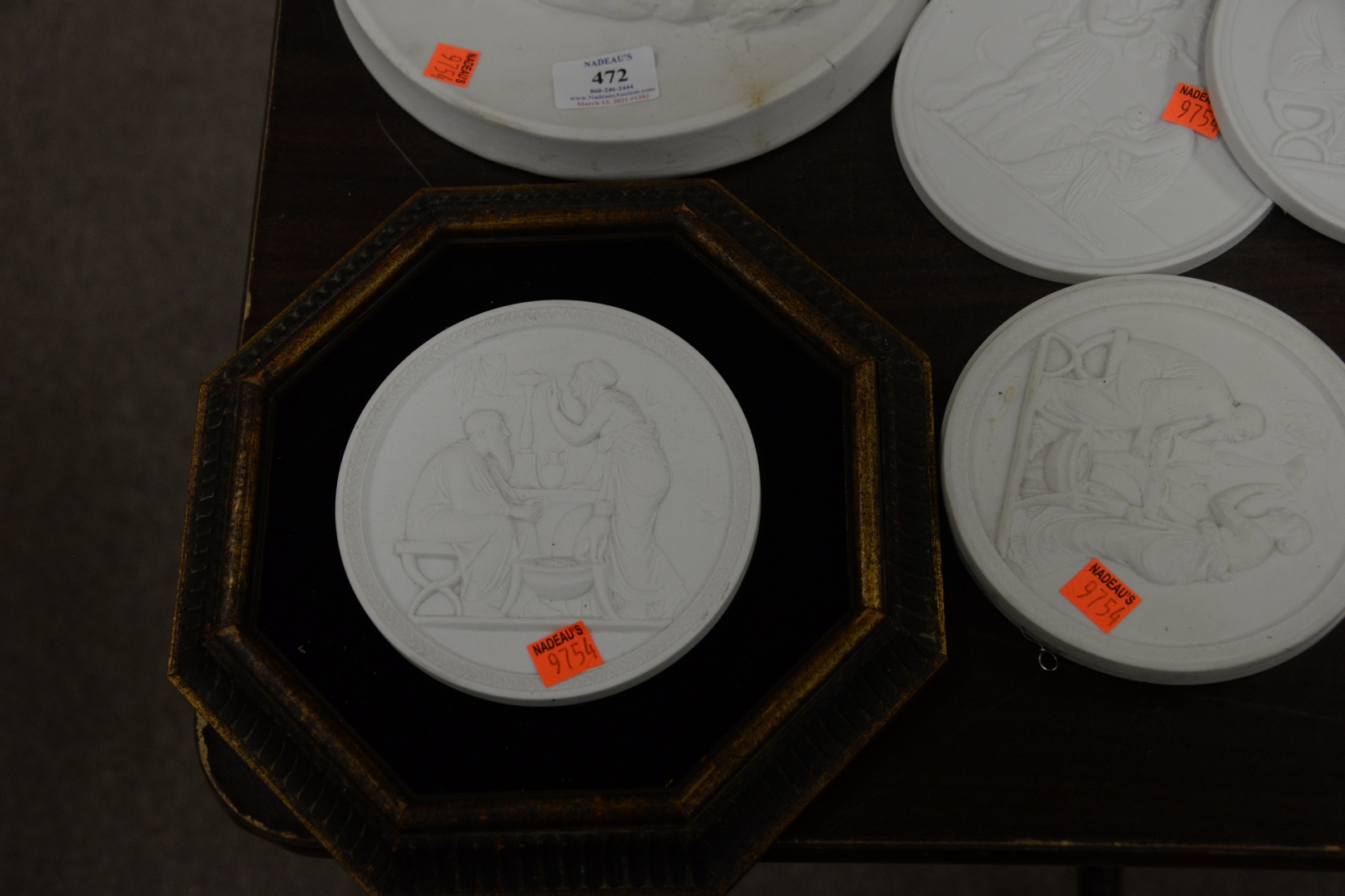 Lot 472: Large Grouping of Composite Figural Wall Plaques, to include two small Wedgwood medallions, stone composite and porcelain.