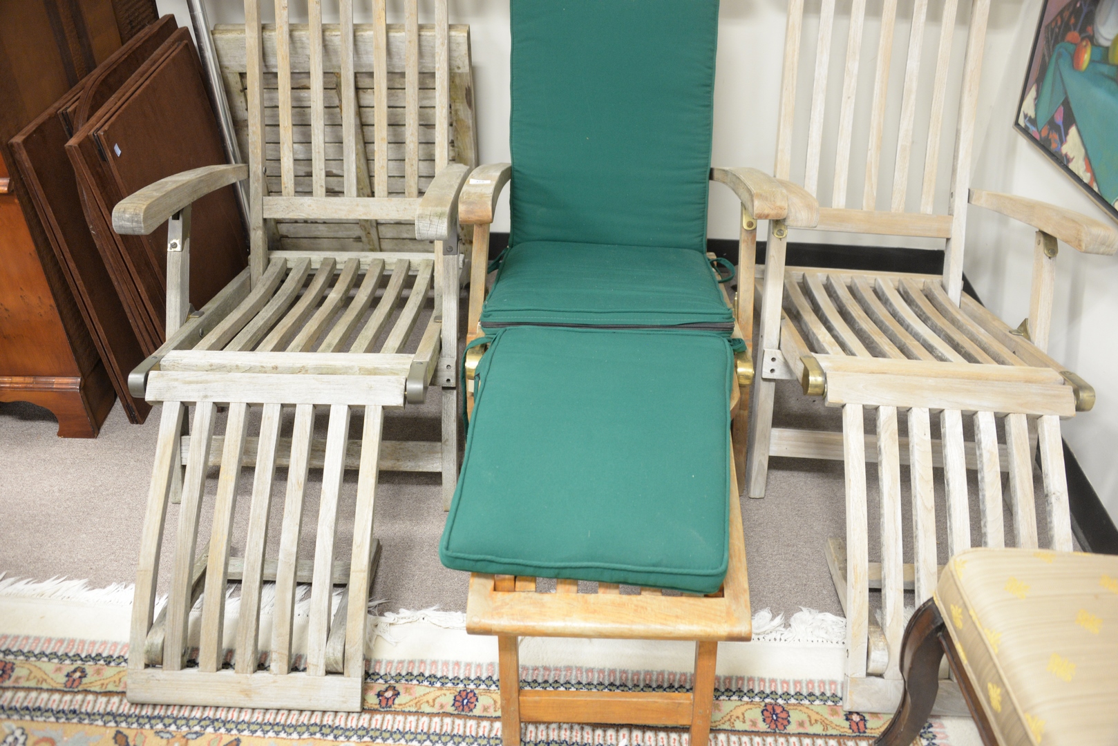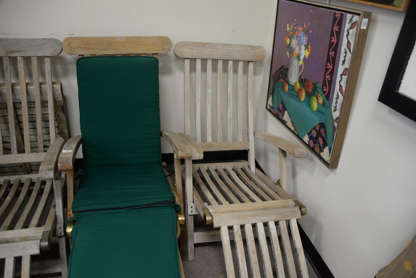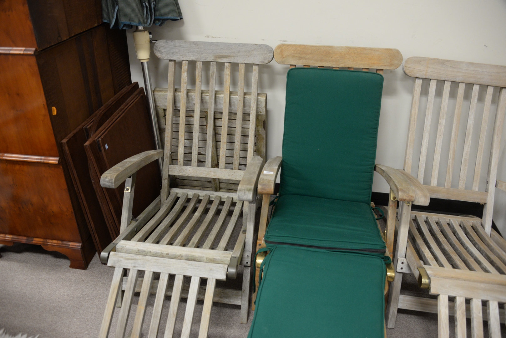 Lot 472: Set of Three Outdoor Classics Teak Lounge Chairs with adjustable foot rests, length 57 inches.