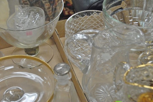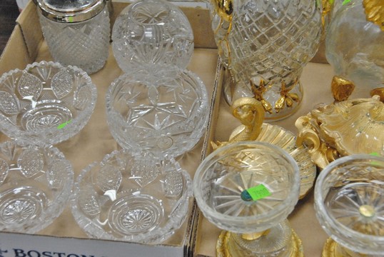 Lot 472: Six box lots to include Orrefors bowl, bronze and glass dishes, cut glass , eagle and owl pitcher, bowls, etc.