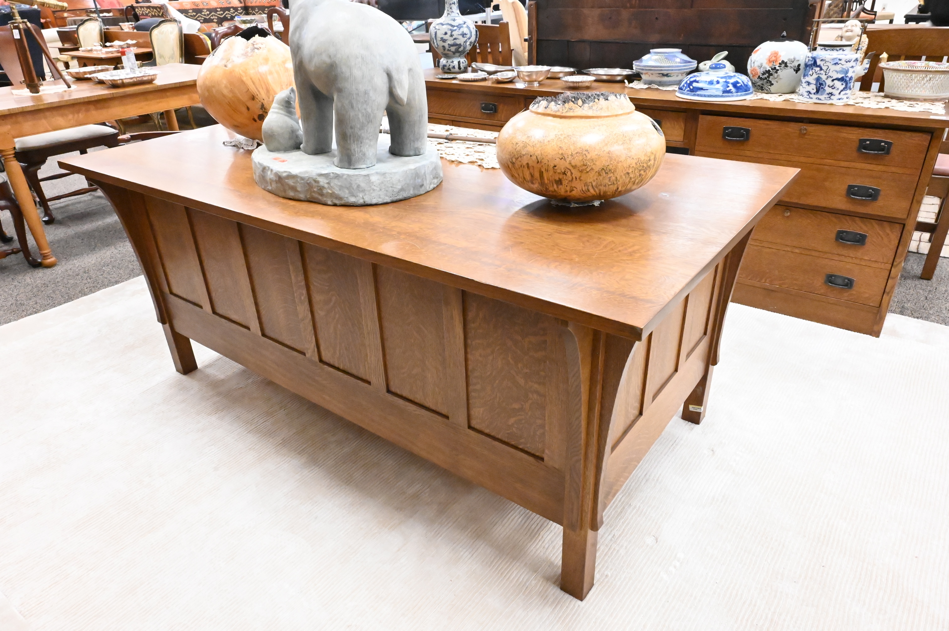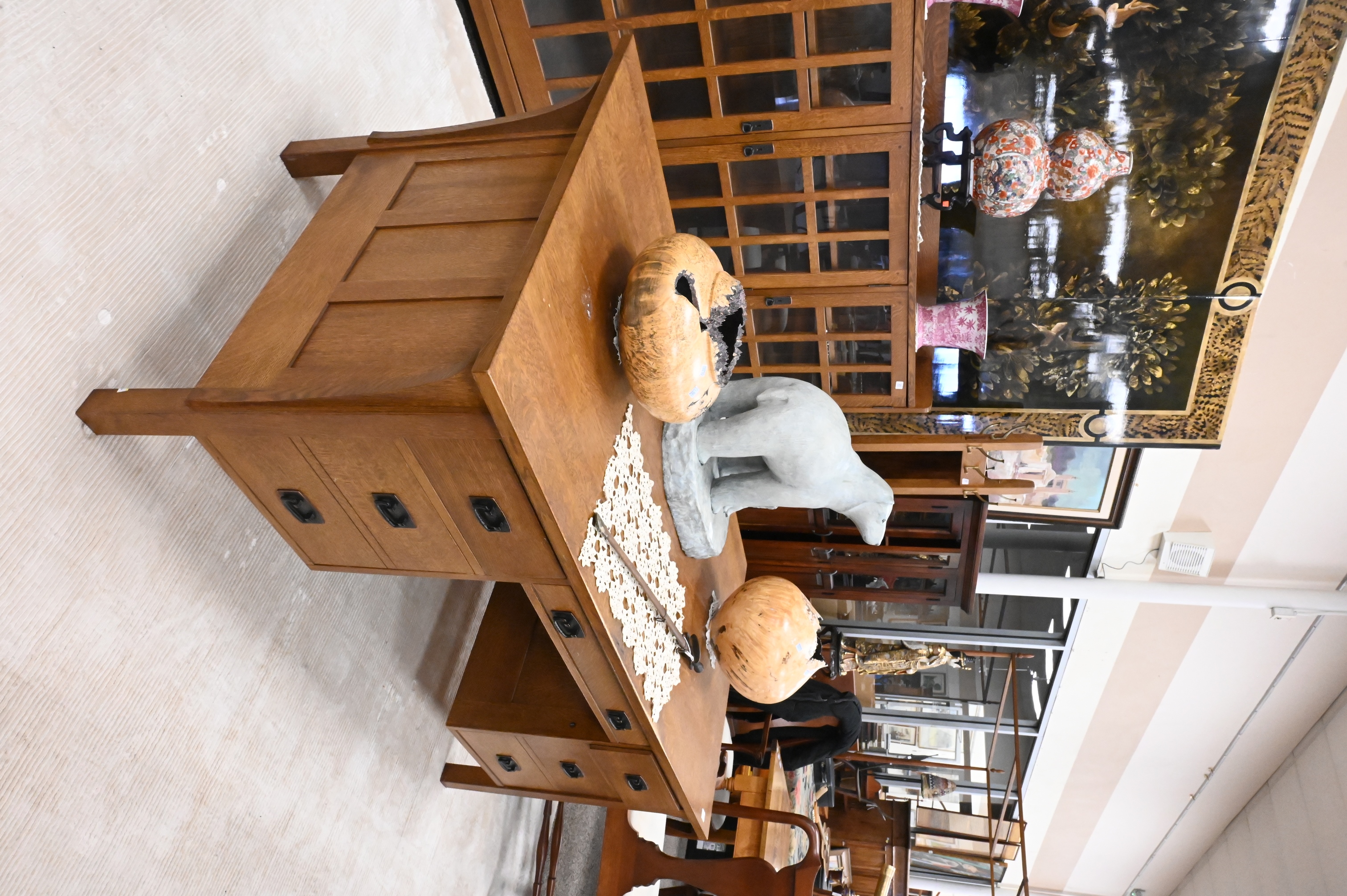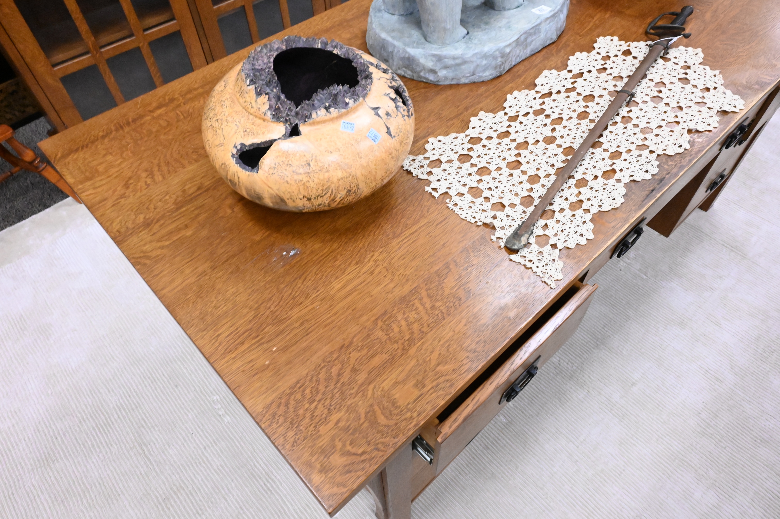 having central drawer flanked by three drawers on each side, wear to front writing surface