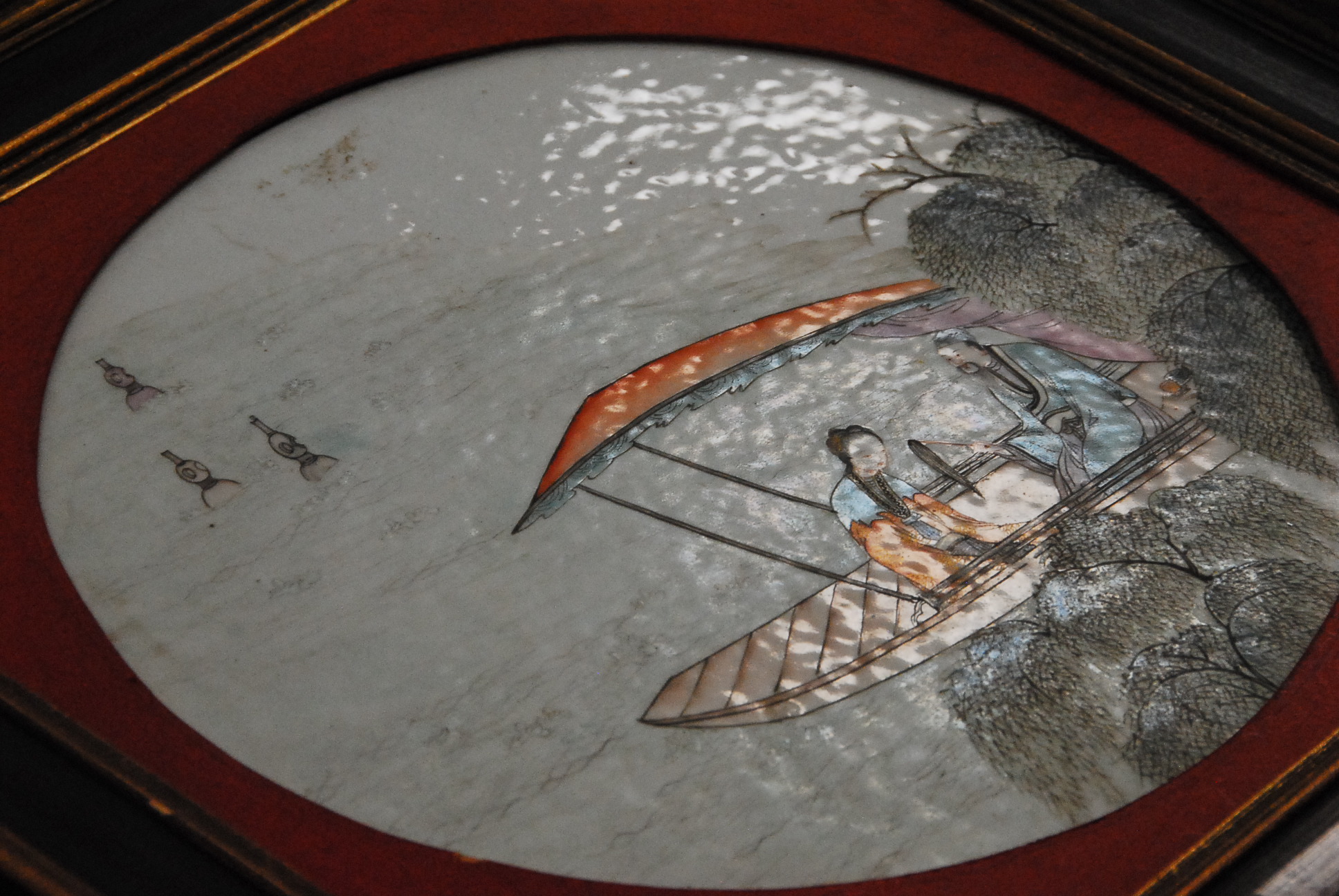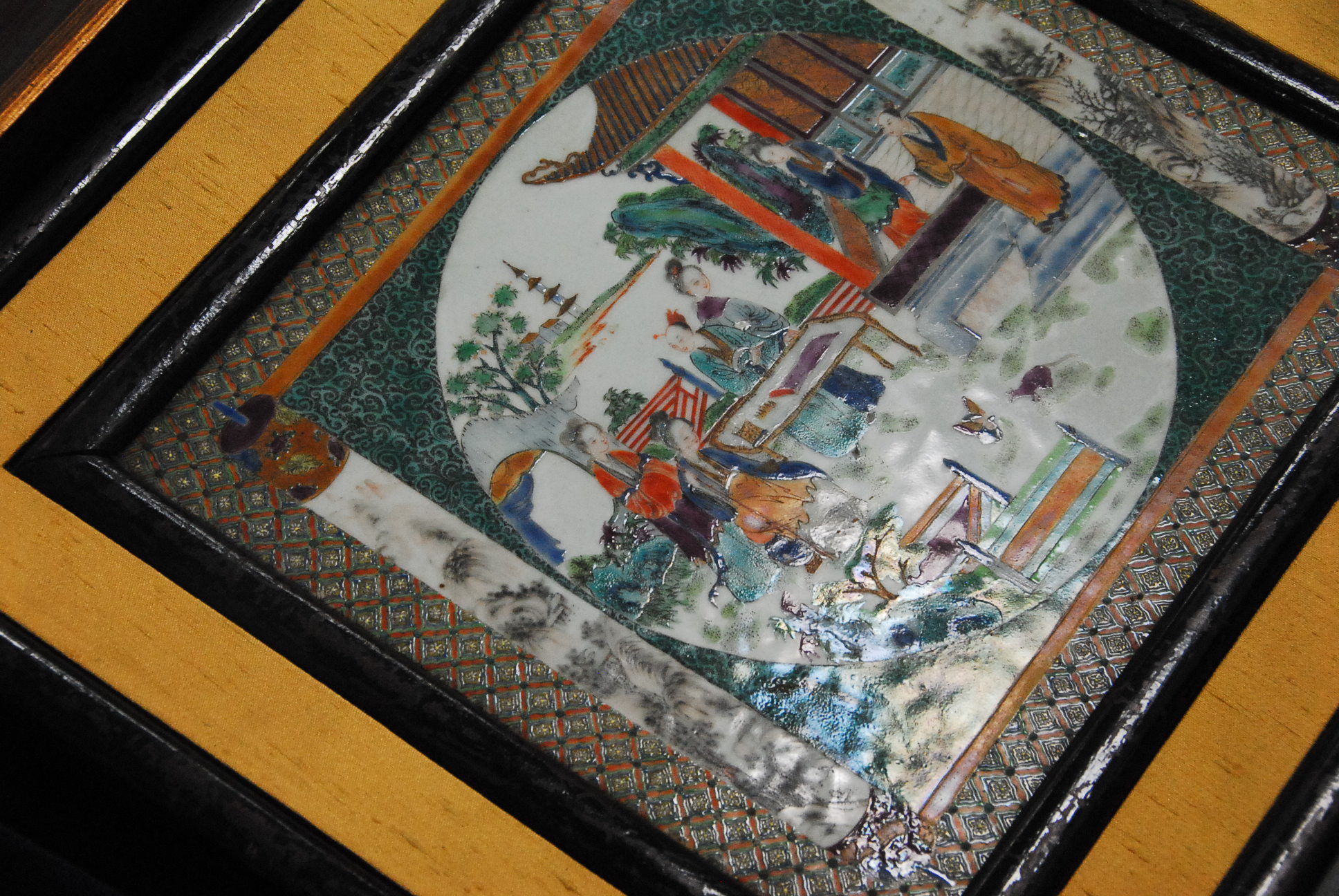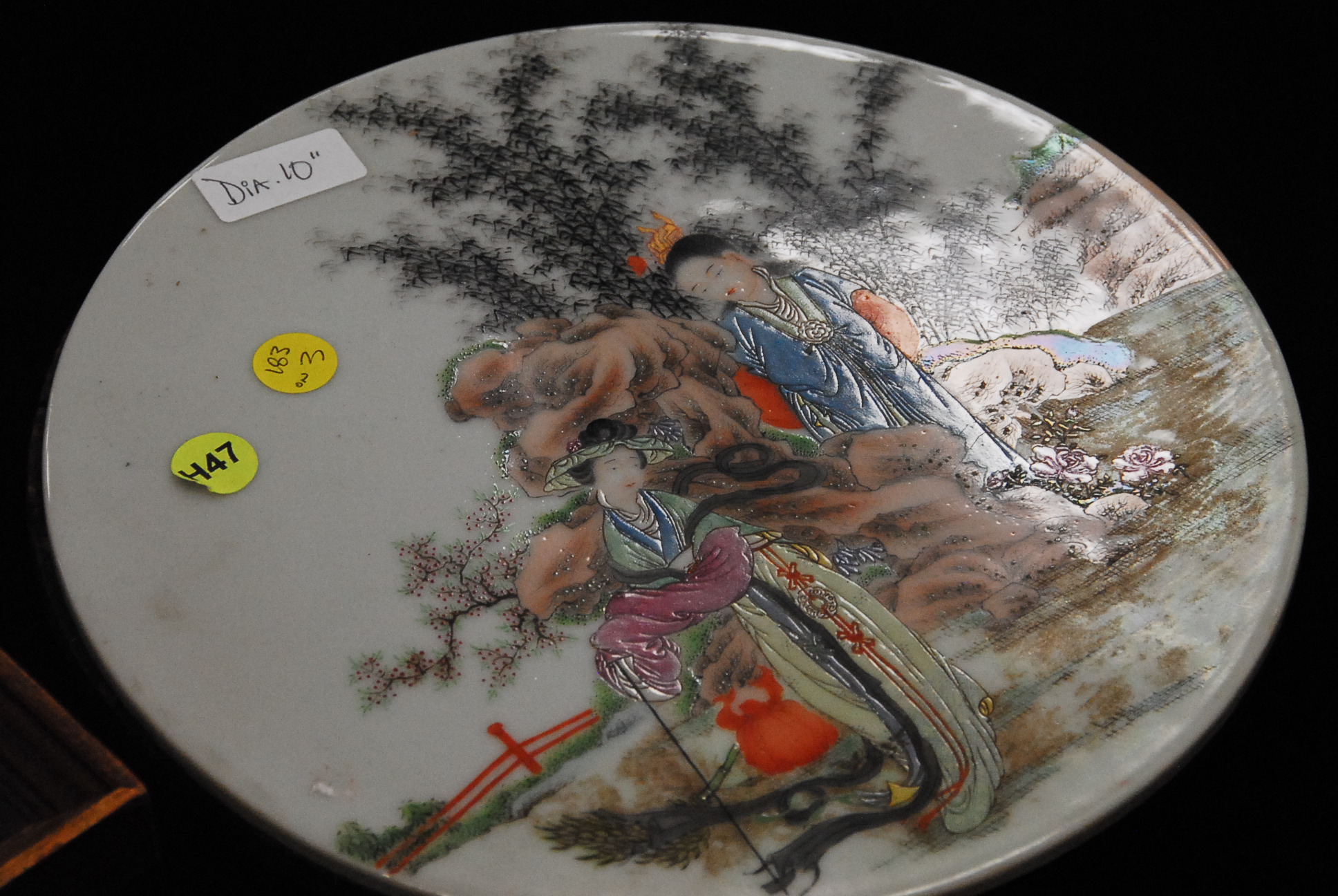 Three Famille Rose plaques, one of courtyard scene 9 1/2 x 11, one of a man and woman in a boat, dia. 11 1/2, and one of landscape with two people dia. 10.
