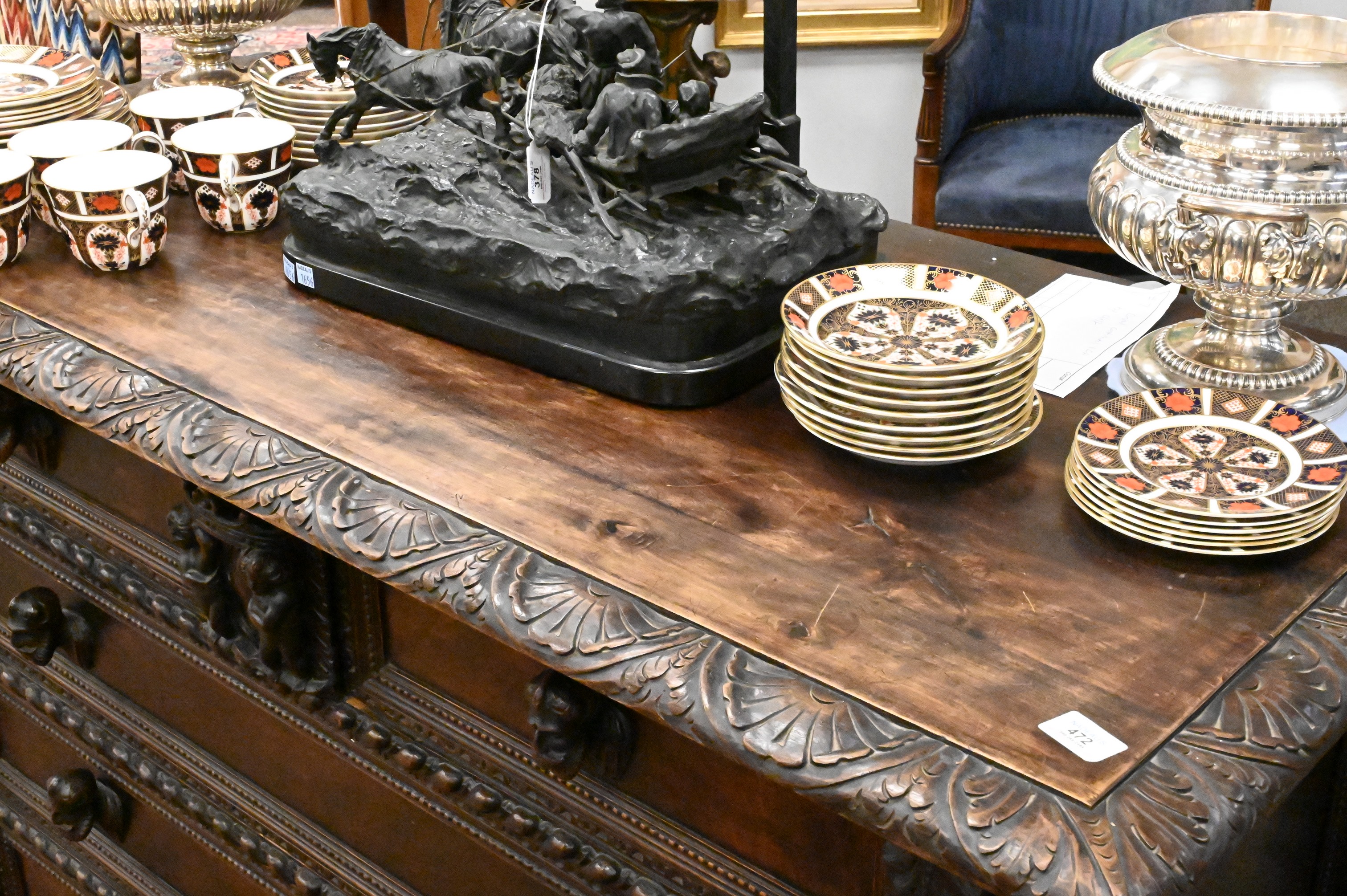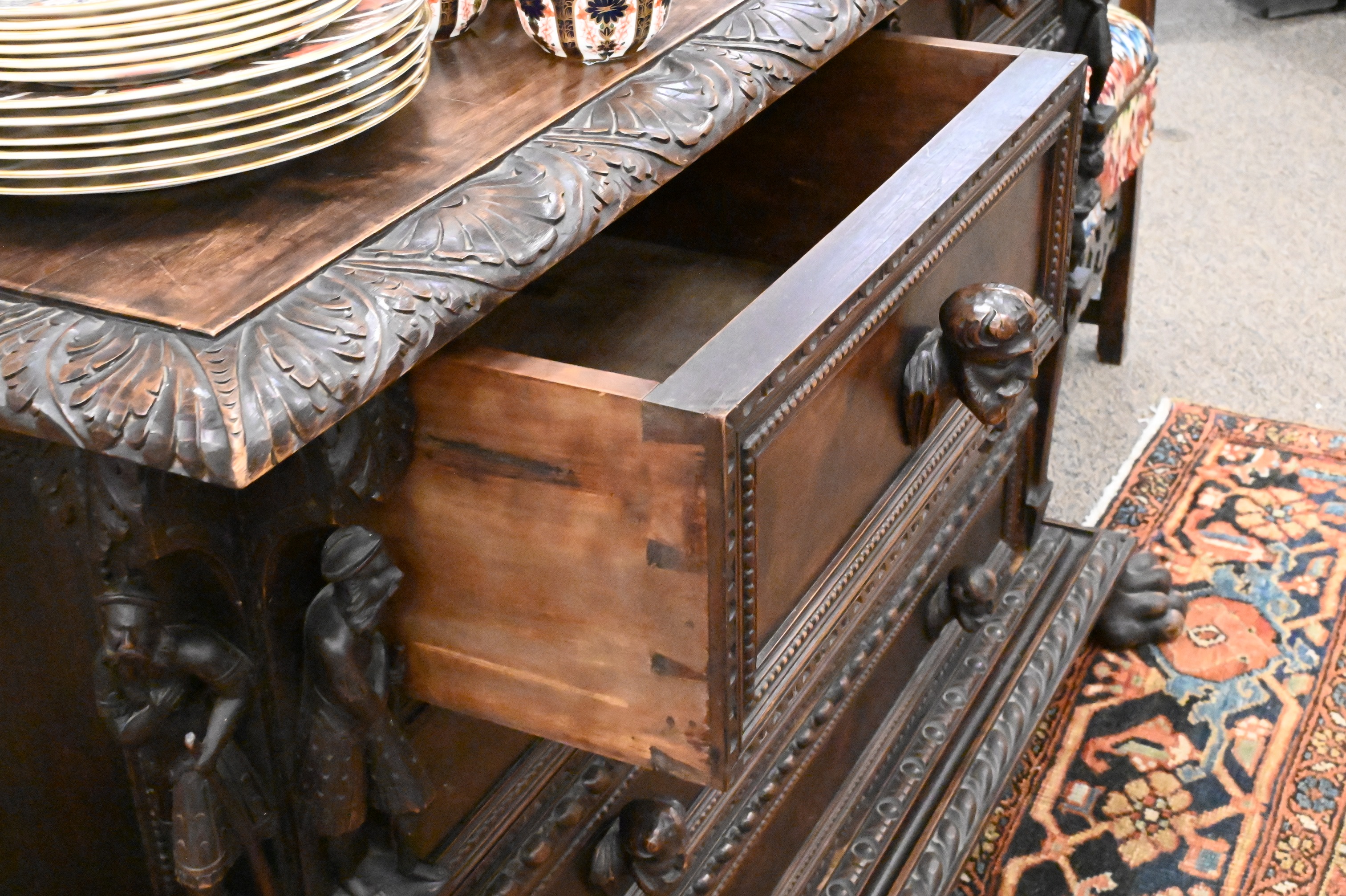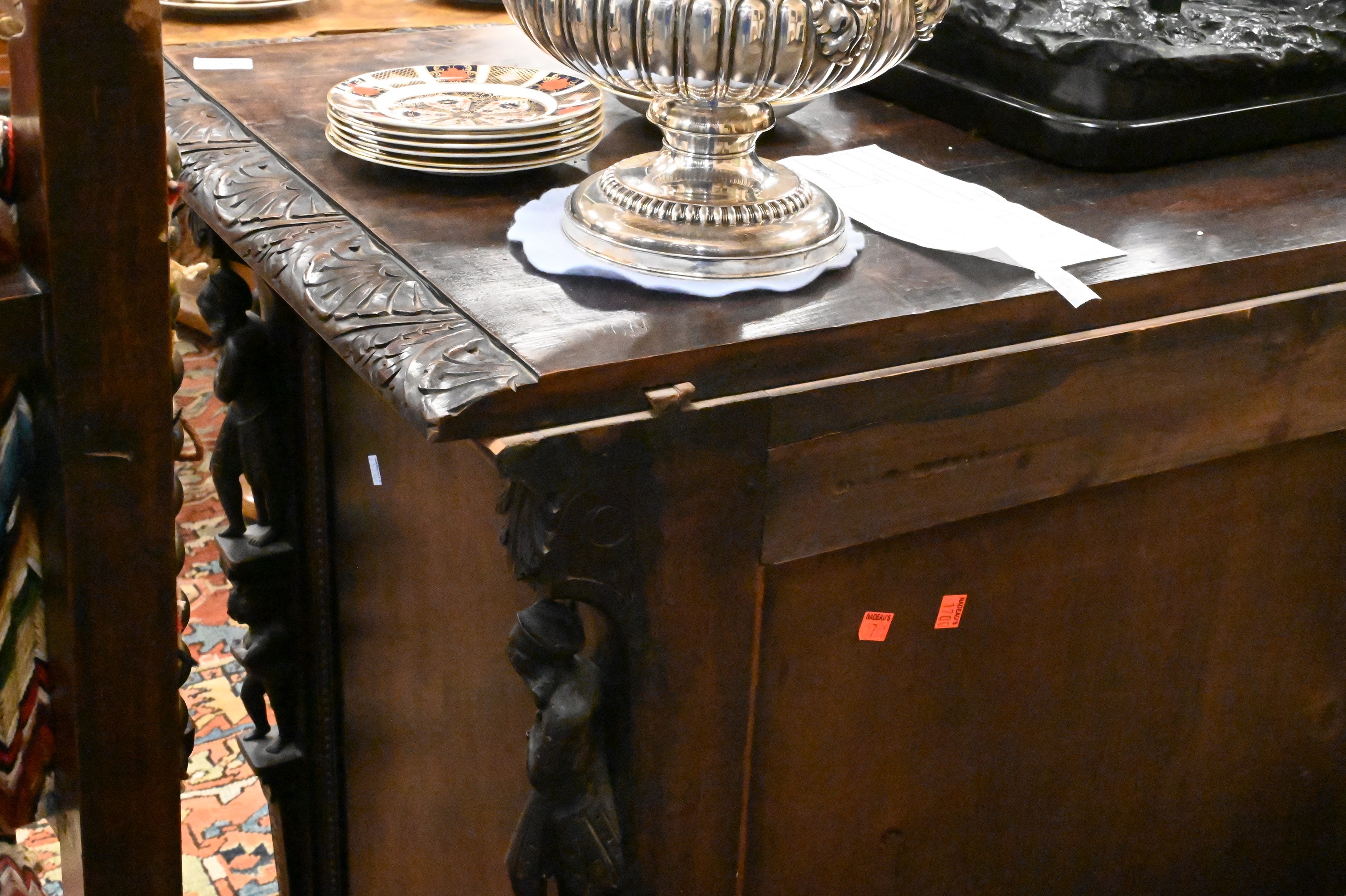 in the manner of North Italian Style, having three fully carved figures on either side and carved male face pulls, all set on large claw feet, late 19th/early 20th century