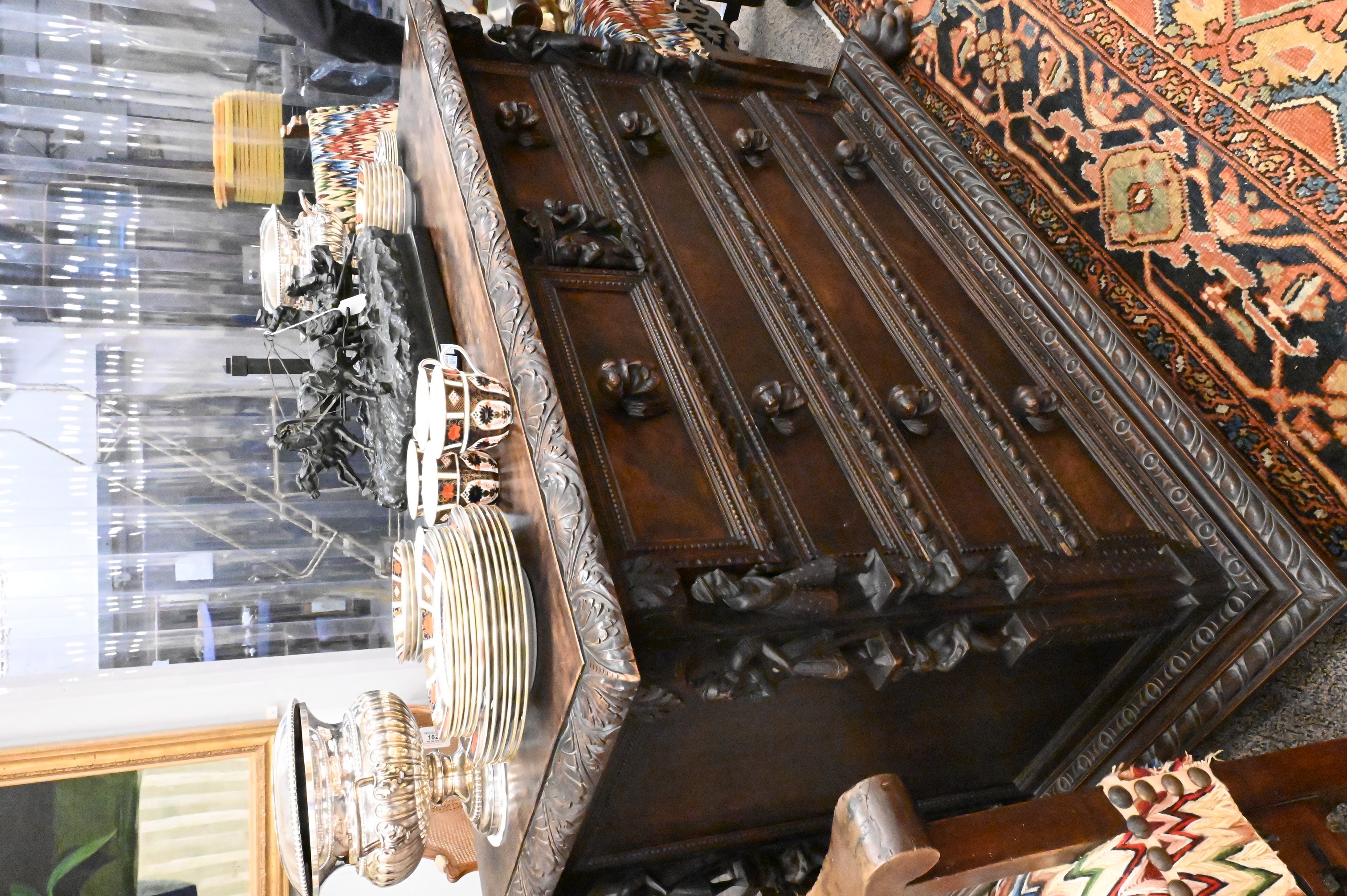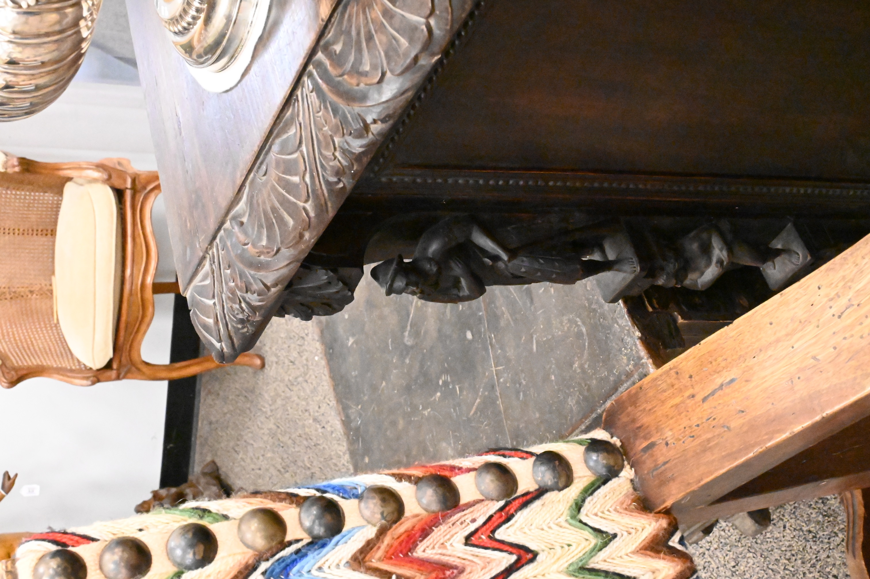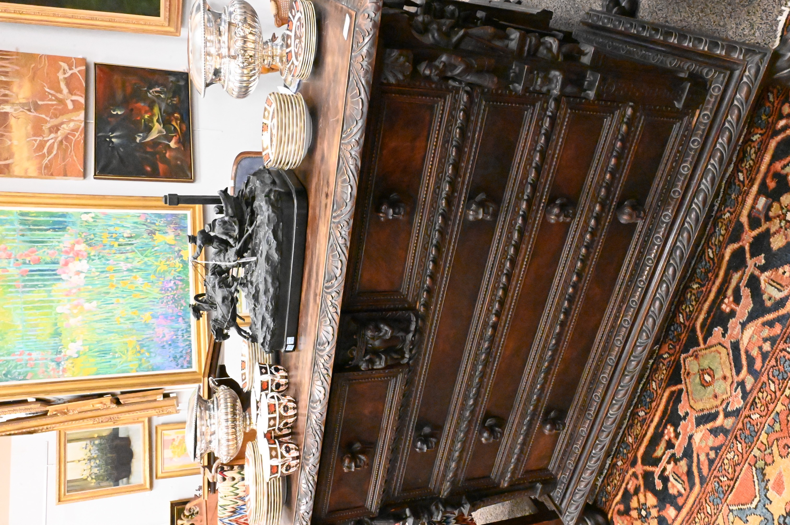 in the manner of North Italian Style, having three fully carved figures on either side and carved male face pulls, all set on large claw feet, late 19th/early 20th century