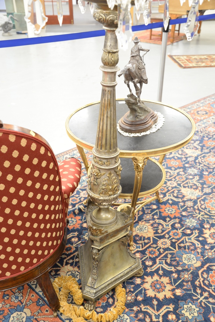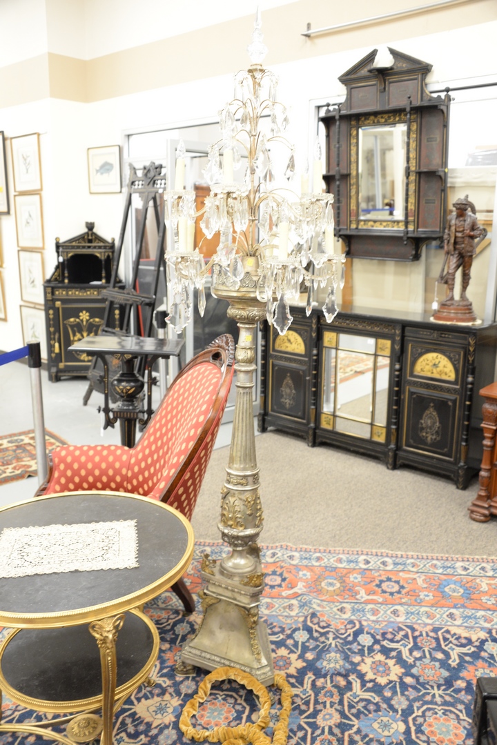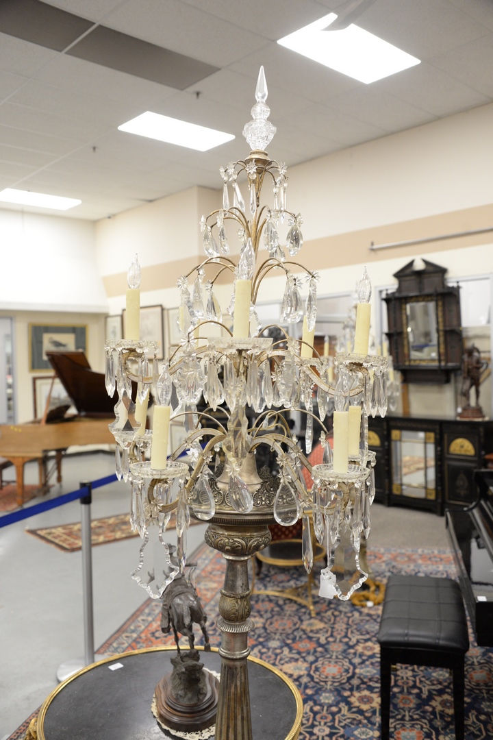 Lot 473: A Pair of Baroque Candelabra Floor Lamps ten light with crystal prisms on silver plated bases and claw feet height 86 inches
