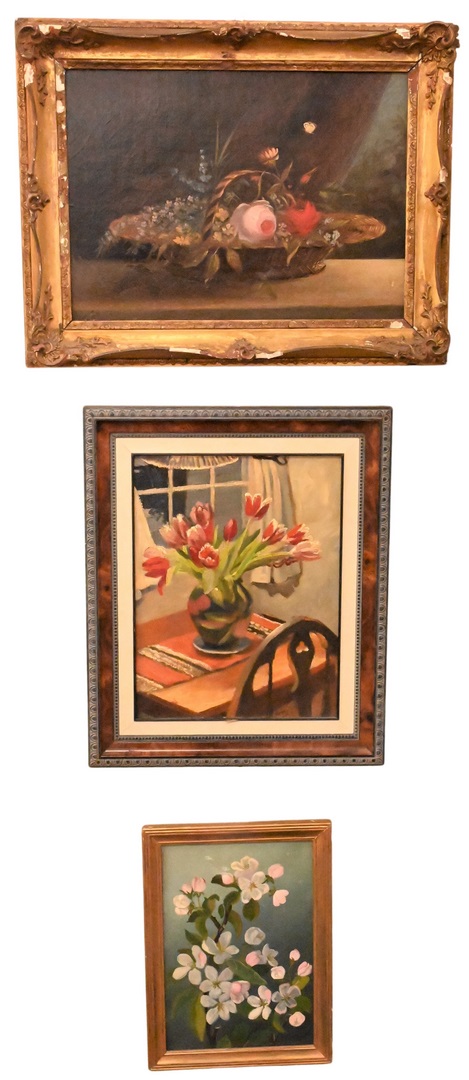 Four Piece Framed Still Life Lot, to include Korin Strong oil on board, “Kitchen Table Tulips”, signed lower right, titled and dated on verso; oil on board, still life of flowers, unsigned; oil on board, still life of floral basket with butterfly; along with a still life of a table with flowers, fruit and chalice, oil on canvas, initialed “M.T.” lower right; largest 15 1/2″ x 20″.