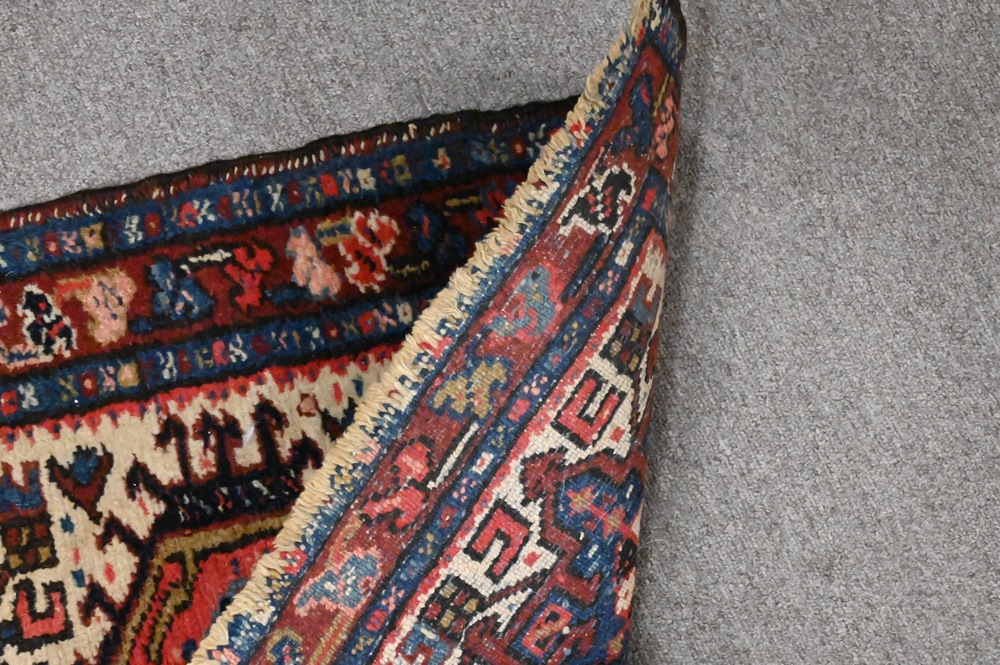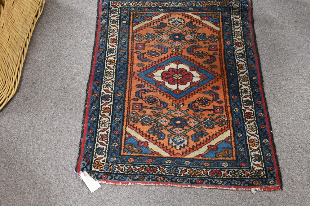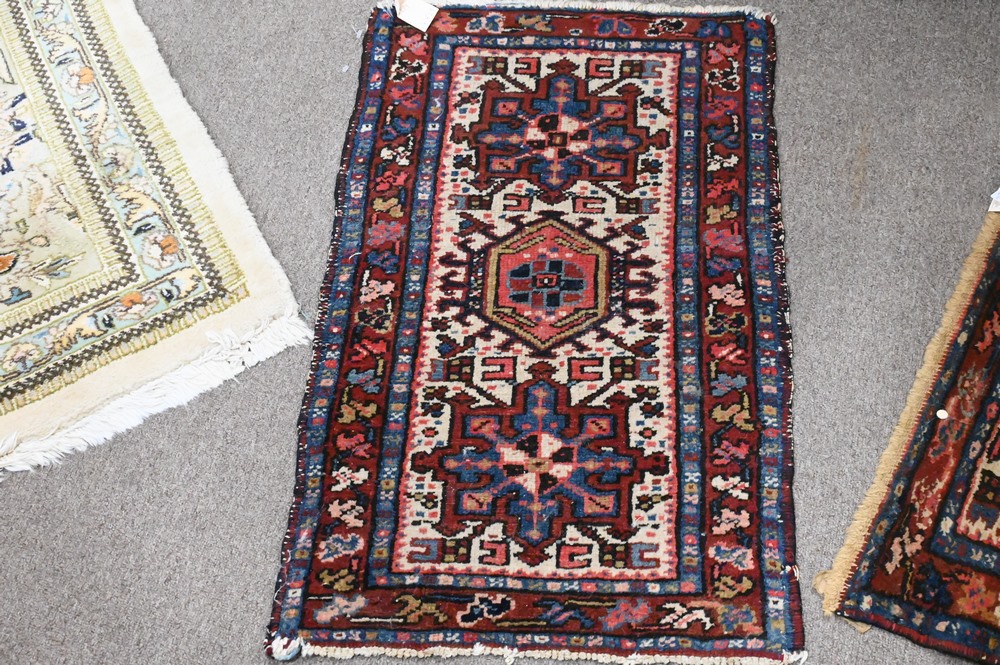 Four Piece Lot, to include three Oriental throw rugs, one bag face, two Heriz, and one Hamadan; 1′ 8″ x 2′ 9″; 1′ 10″ x 2′ 10″; 2′ 1″ x 2′ 7″; 1′ 7″ x 1′ 8″.