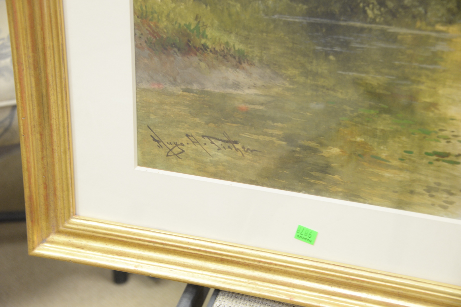 Lot 473: Hugo Anton Fisher (Czech/American, 1854 – 1916), sunset in the reeds, watercolor and gouache on paper, signed lower right “Hugo A. Fisher”, sight size 21 1/2″ x 30″.