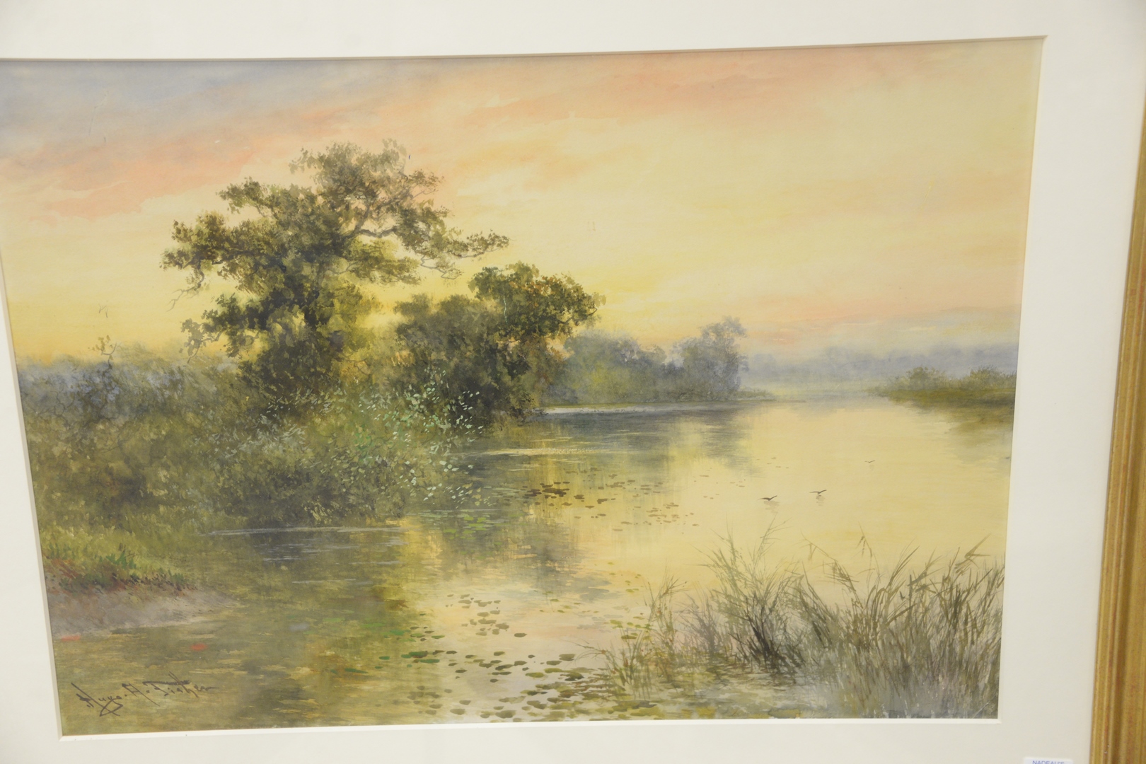 Hugo Anton Fisher (Czech/American, 1854 – 1916), sunset in the reeds, watercolor and gouache on paper, signed lower right “Hugo A. Fisher”, sight size 21 1/2″ x 30″.
