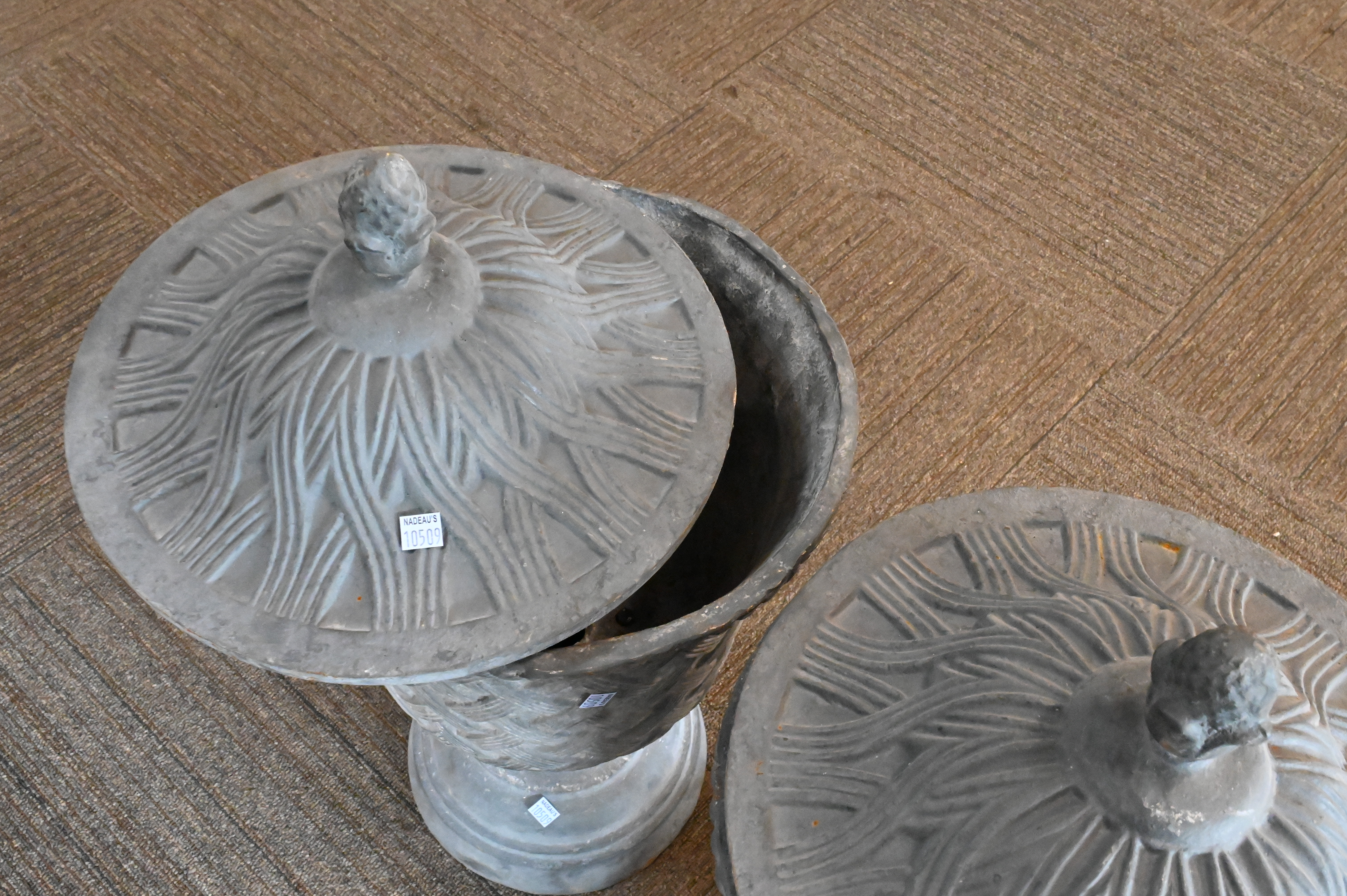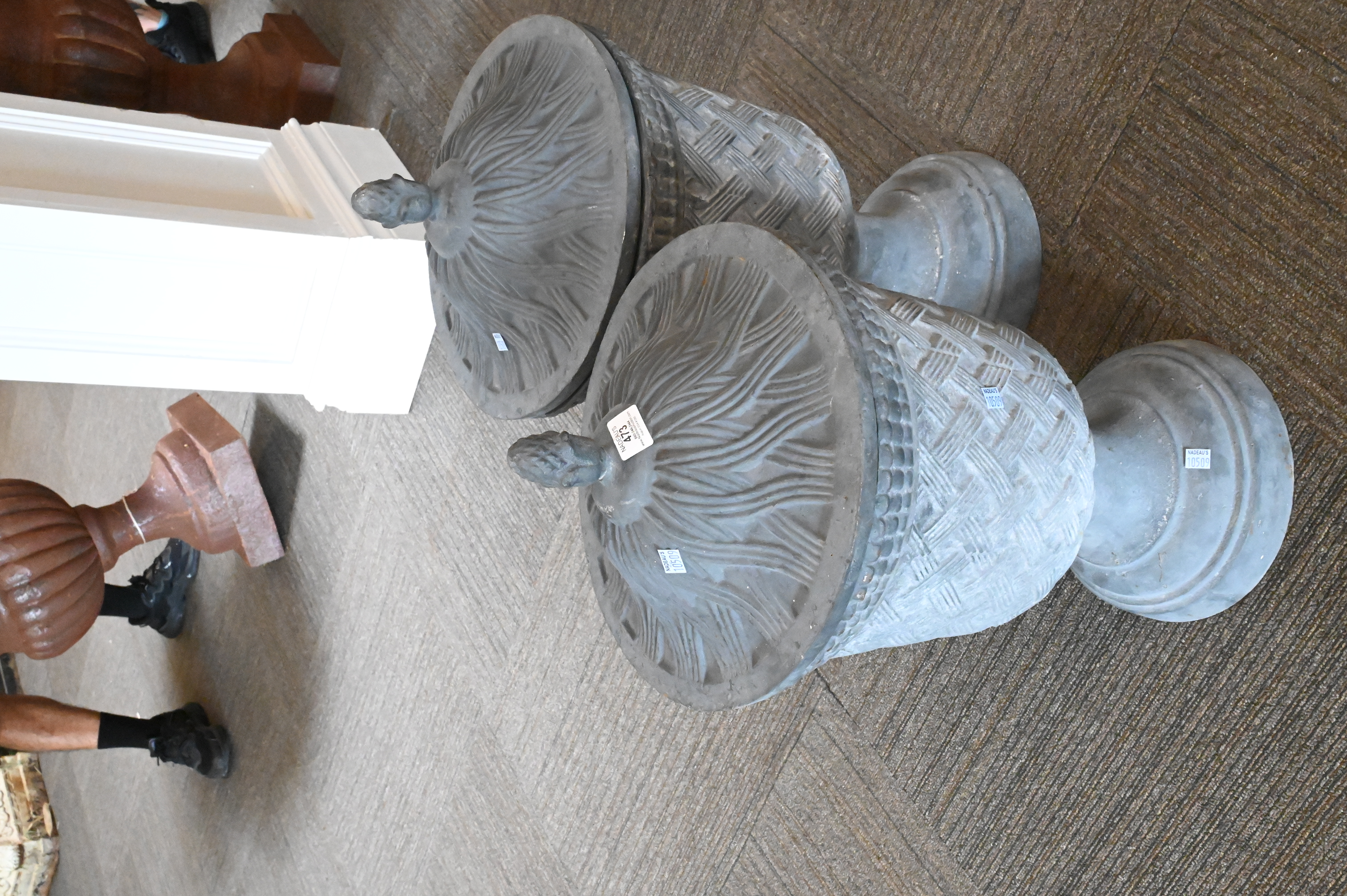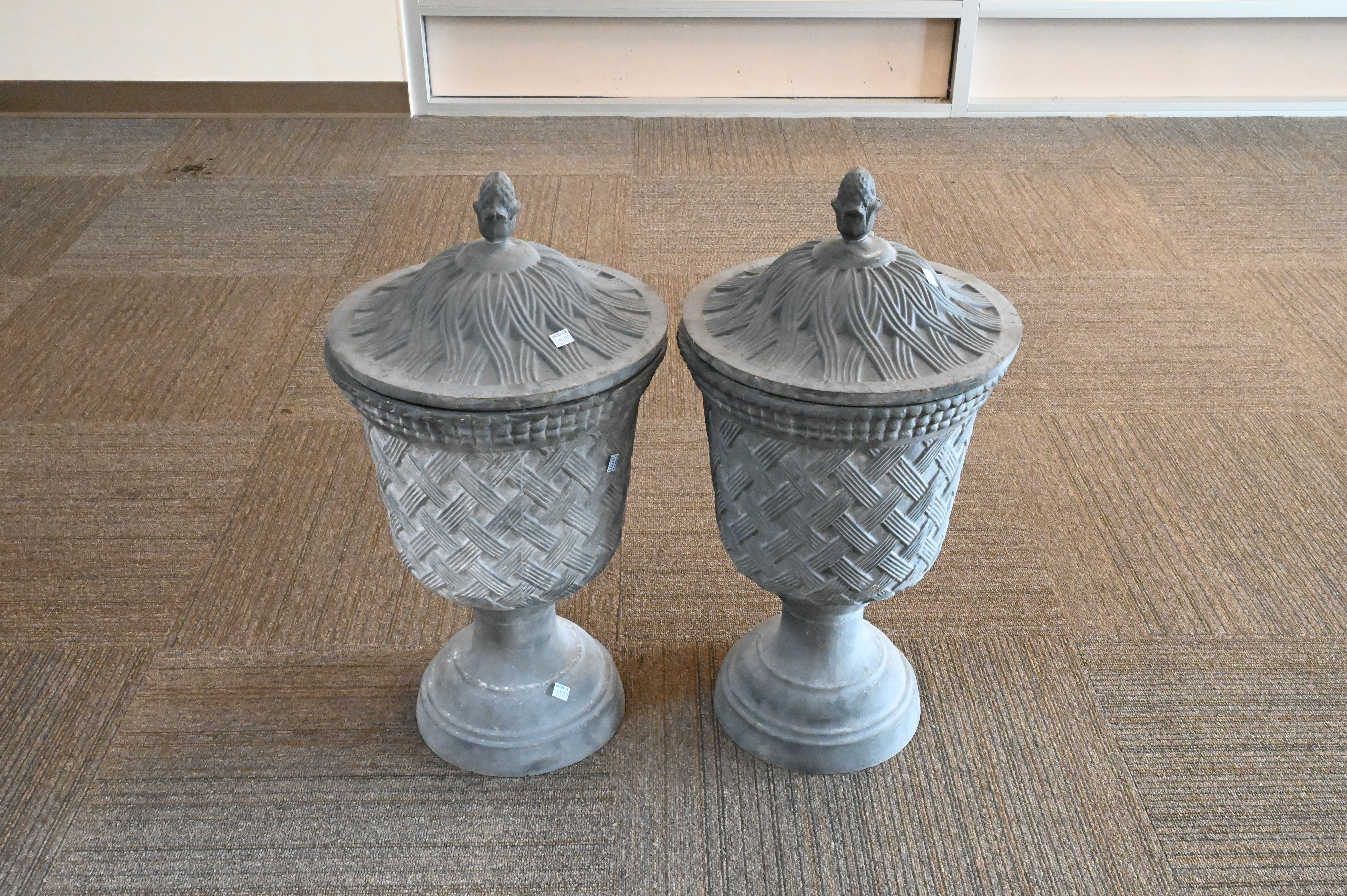 Lot 473: Pair of Iron Outdoor Covered Urns