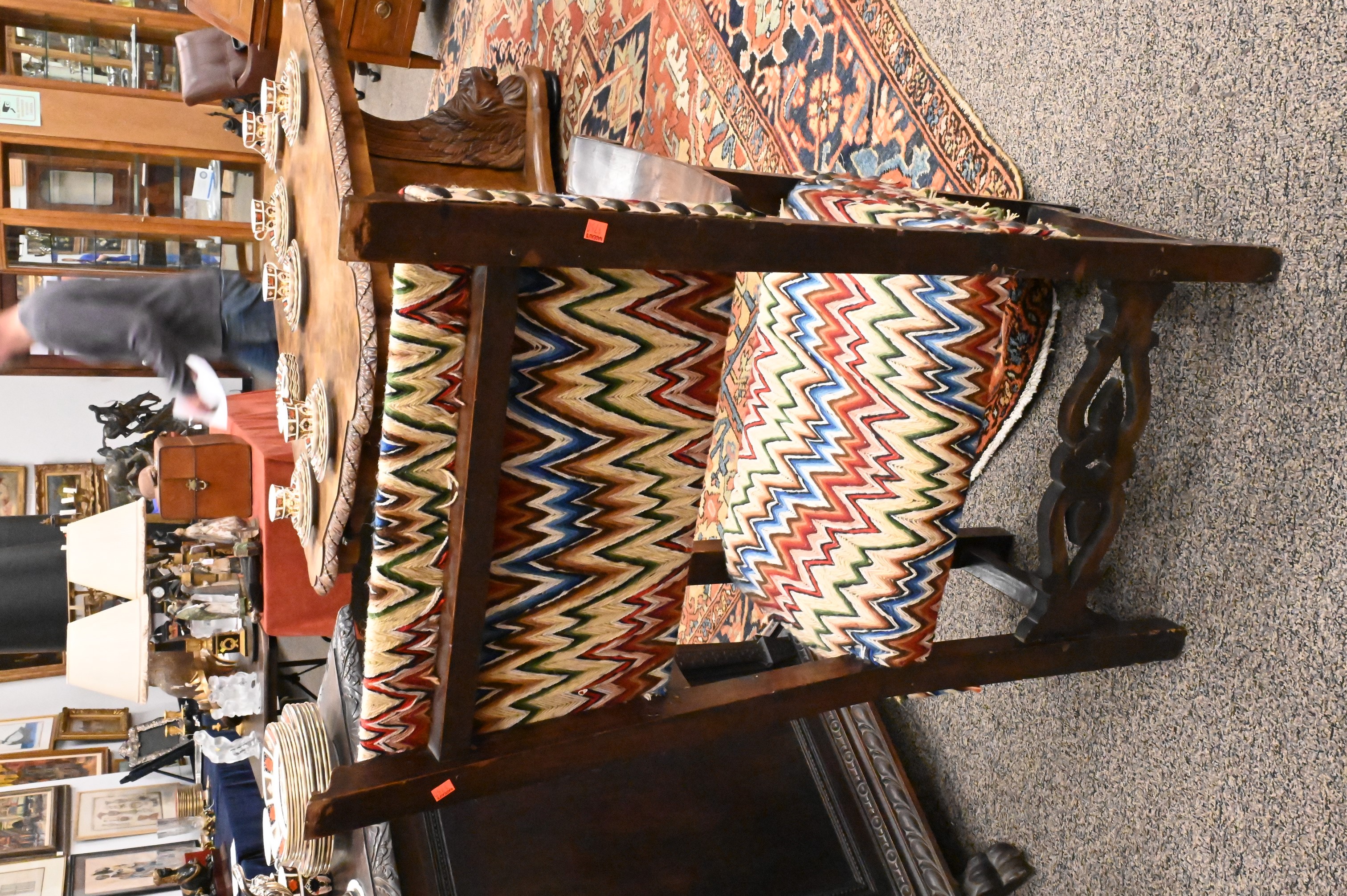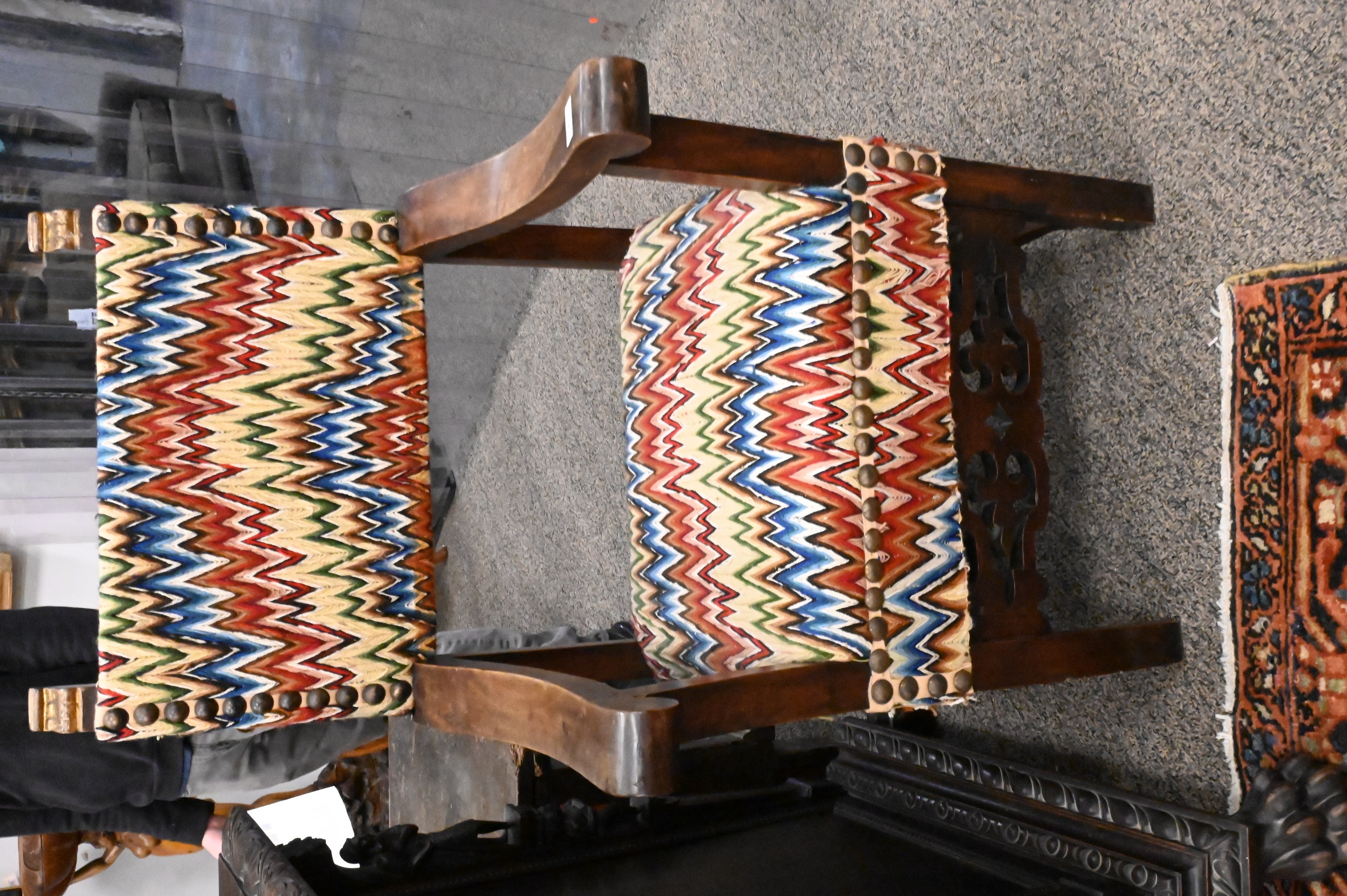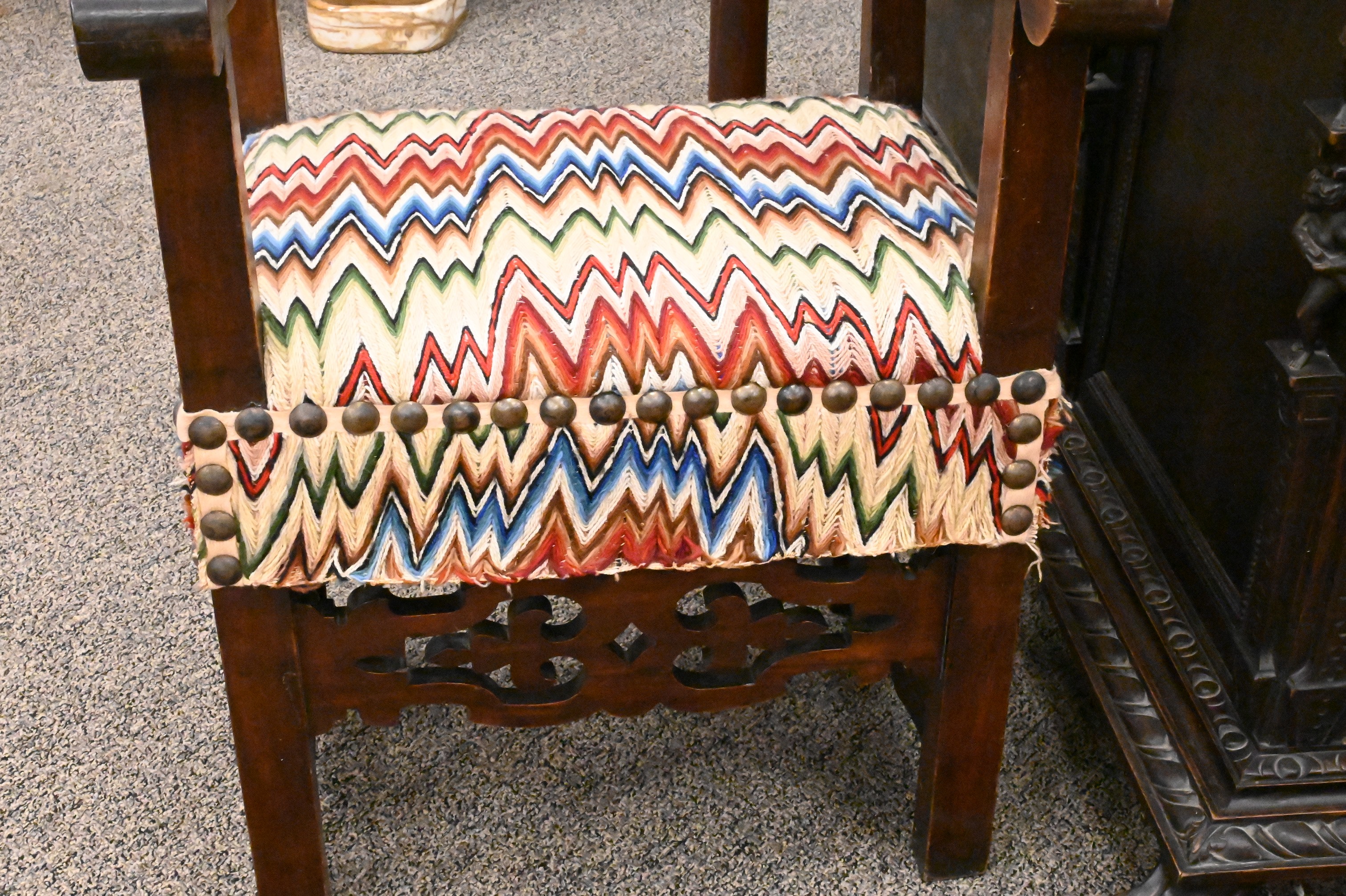 Lot 473: Pair of Italian Walnut Renaissance Revival Parcel-Gilt Decorated Tall-Back Arm Chairs