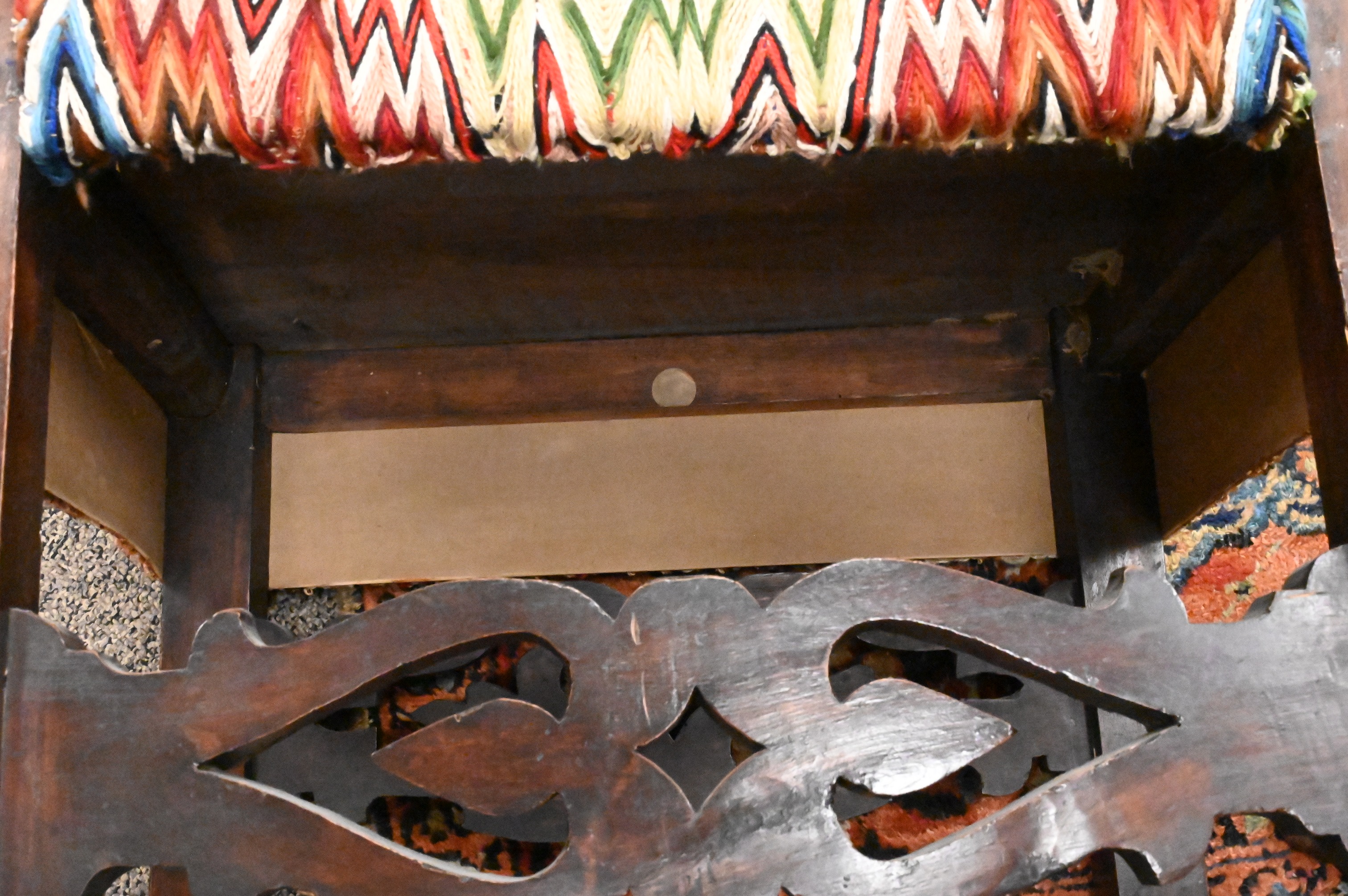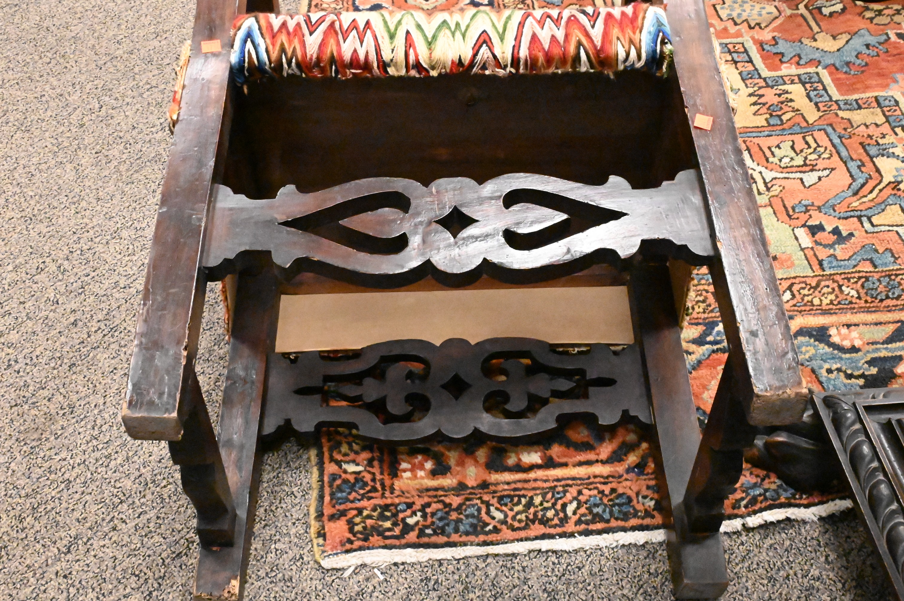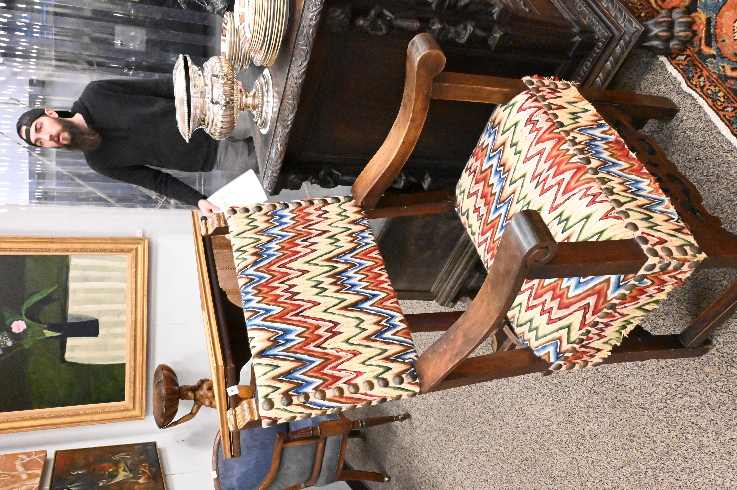 Lot 473: Pair of Italian Walnut Renaissance Revival Parcel-Gilt Decorated Tall-Back Arm Chairs