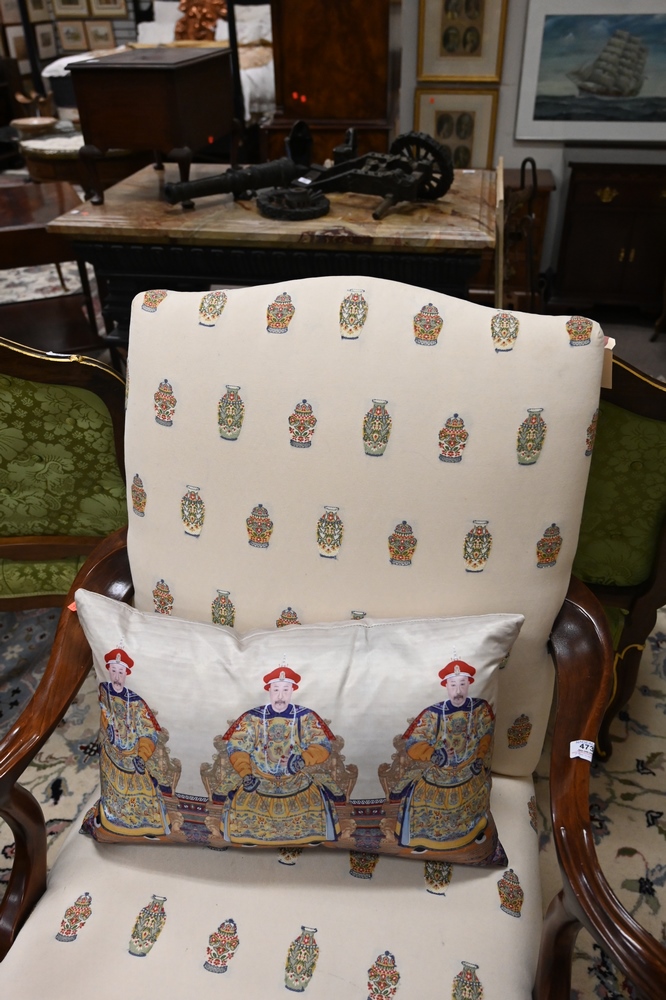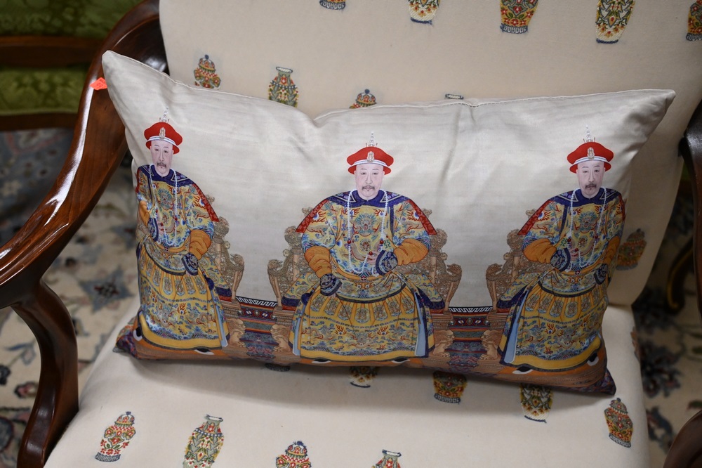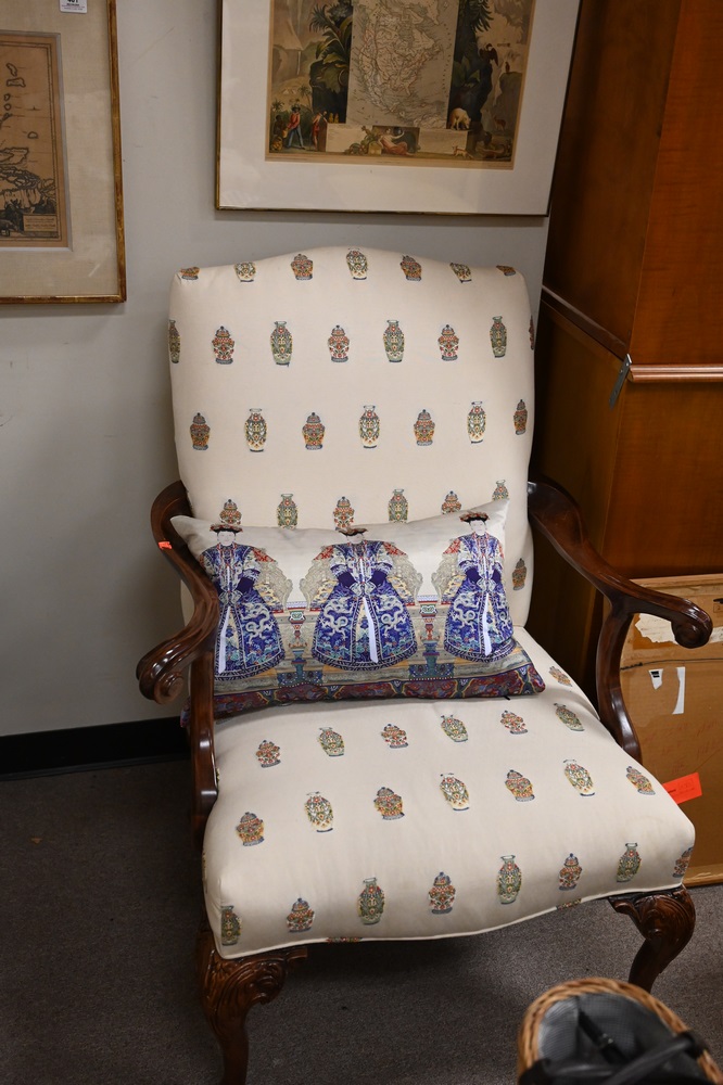Lot 473: Pair of Mahogany Chippendale Style Open Armchairs, having custom upholstery, each with Chinese silk ancestral portrait pillows, height 41 inches.