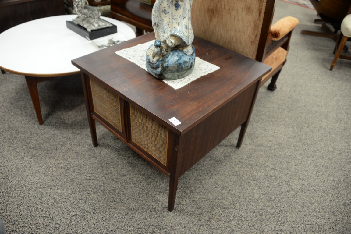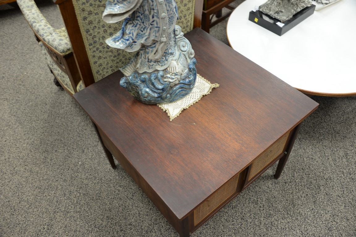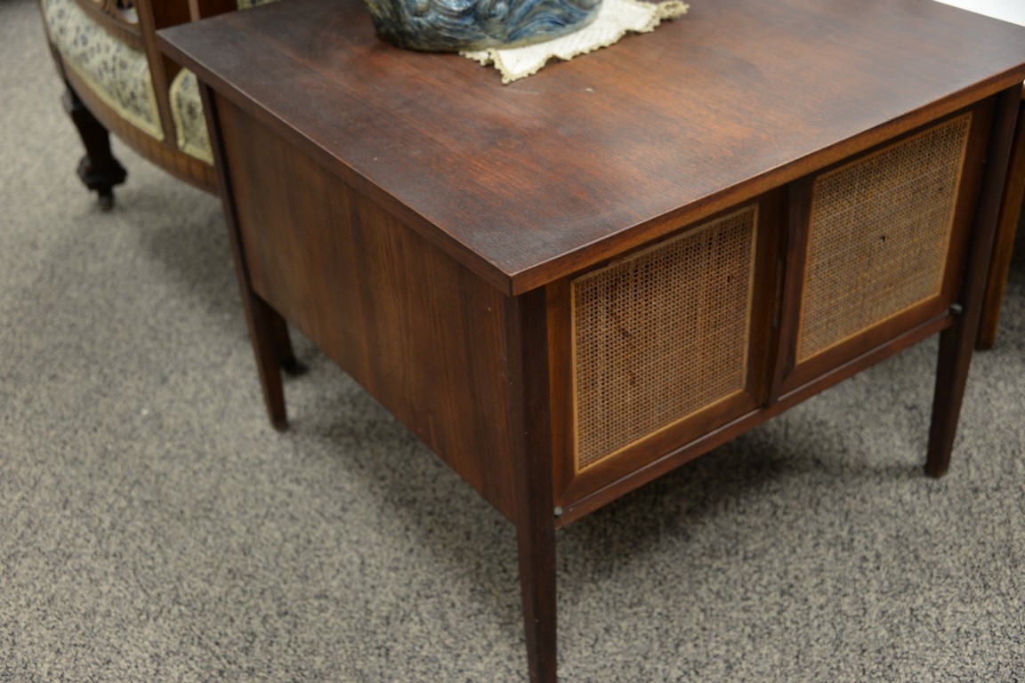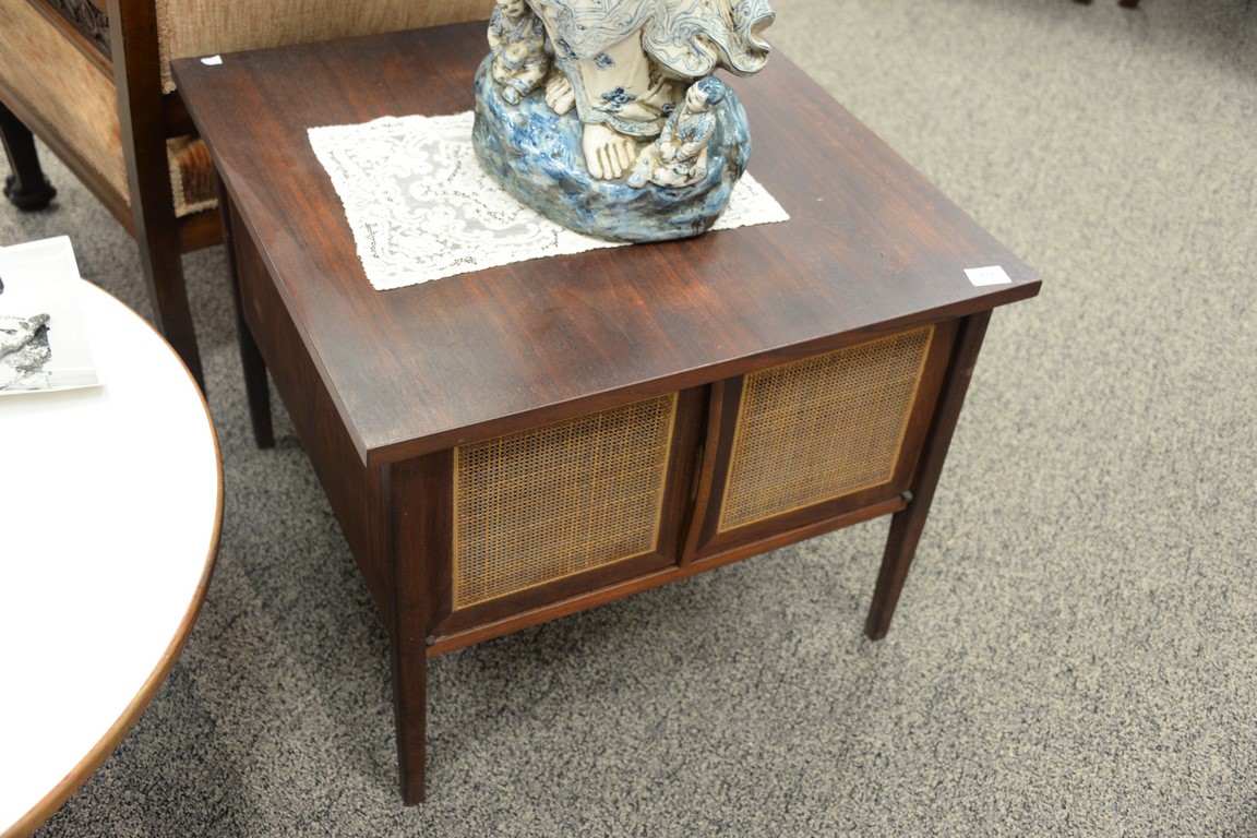 Pair of Mid-Century tables, each with pair of reeded doors. height 21 inches, top: 26 x 26
