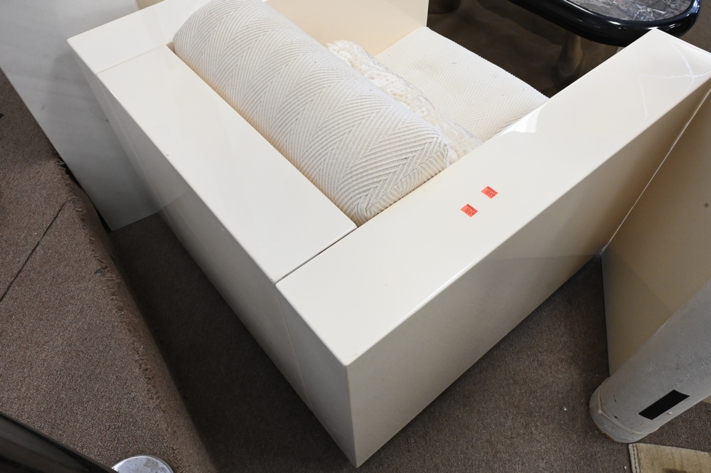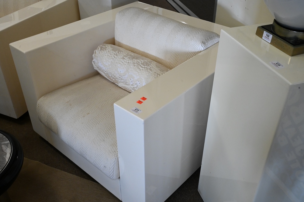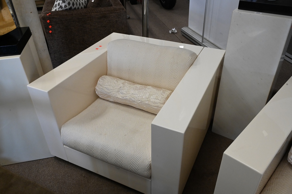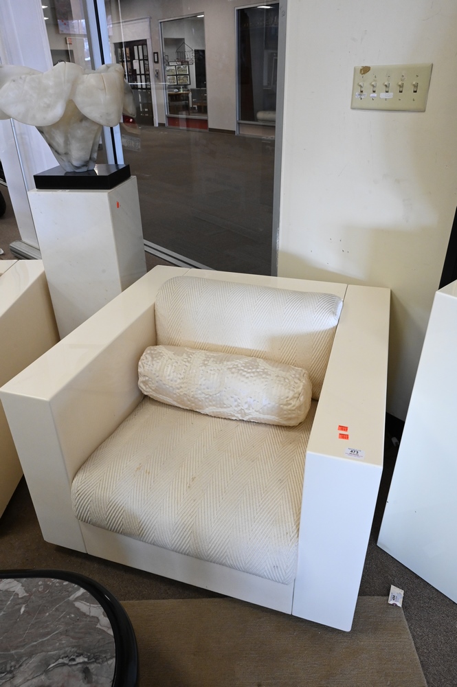 Lot 473: Pair of White Lacquered Modern Club Chairs, ivory or off white with upholstered cushions, height 24 inches, width 35 inches, depth 35 inches.
