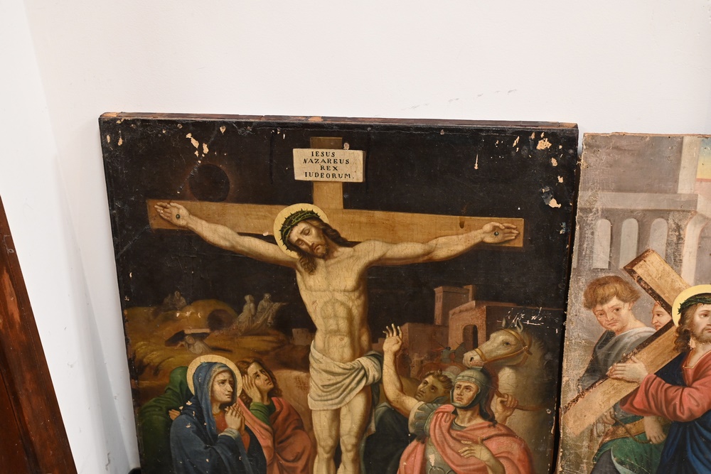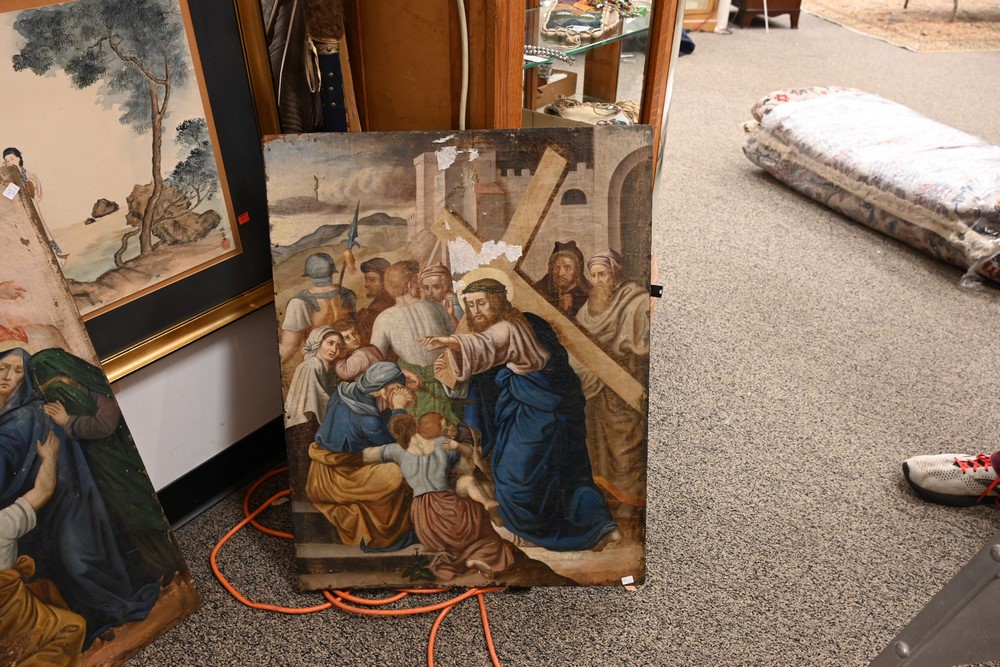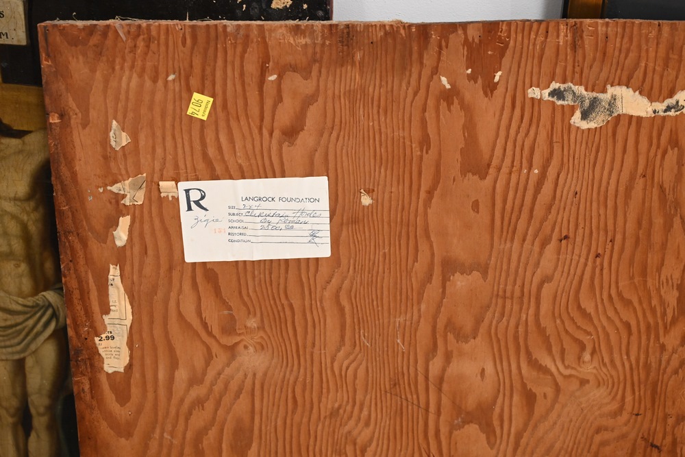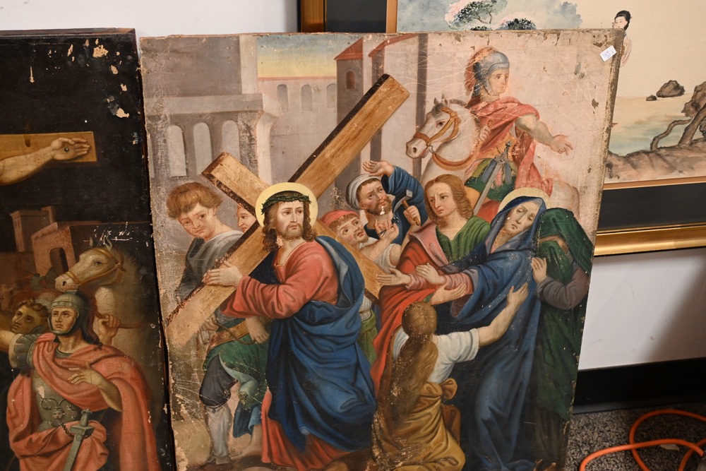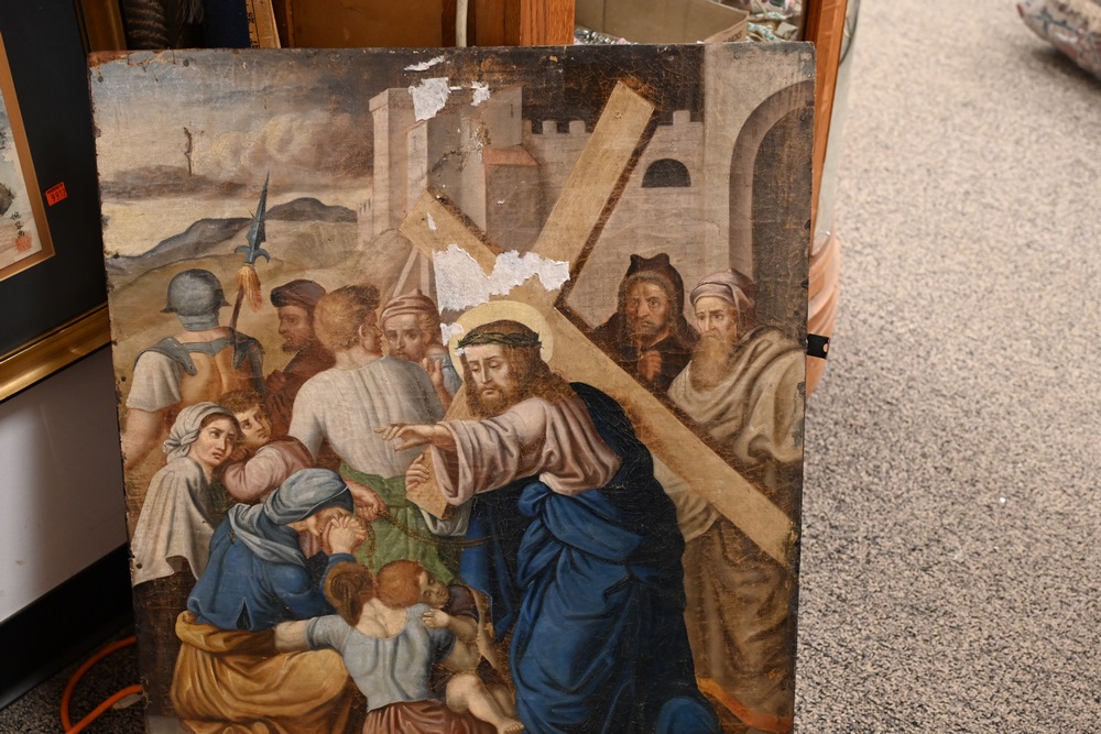 Lot 473: Set of Three Religious Oils on Canvas mounted on panels 18th century or later to include two depicting Jesus carrying the cross along with one of Jesus on the cross marked Jesus Nazarenus Rex Judaeorum Langrock Foundation label on back of each 30 1/2 x 23 1/2 inches