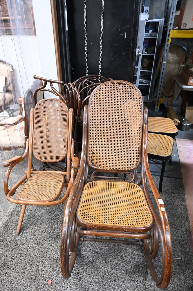 Six Piece Bentwood / Thonet Lot, to include rocker, magazine rack, drying rack, pair of side chairs, along with a folding chair.