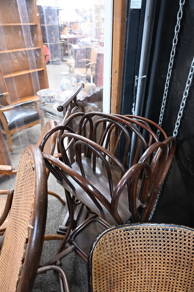 Lot 473: Six Piece Bentwood / Thonet Lot, to include rocker, magazine rack, drying rack, pair of side chairs, along with a folding chair.