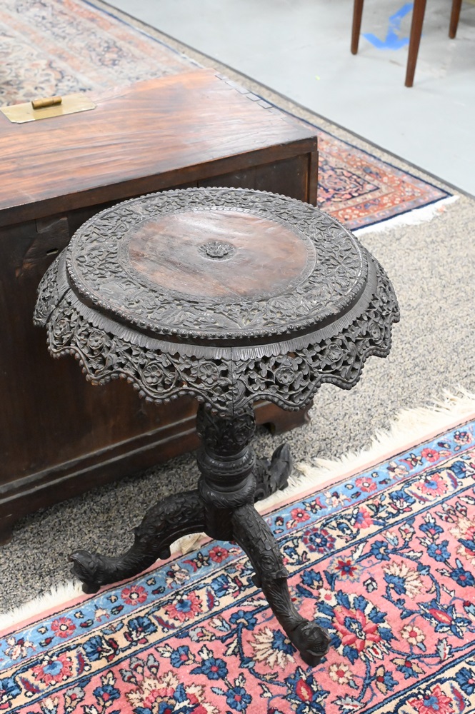 Lot 473: Two Anglo Indian Carved Stands, having bird carved legs, heights 23 and 30 inches, diameter 22 and 14 1/2 inches. Provenance: An estate from Redding, CT.