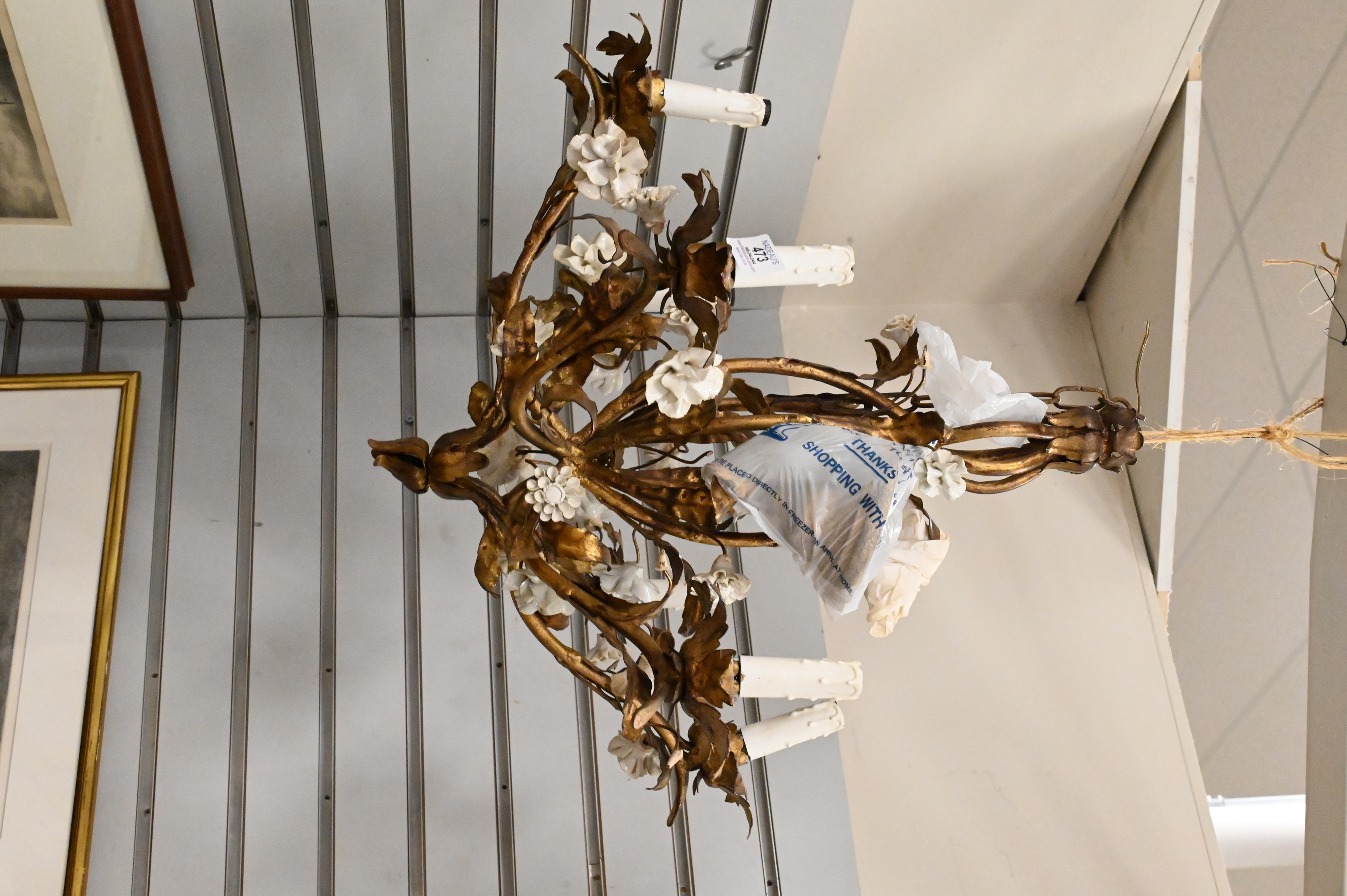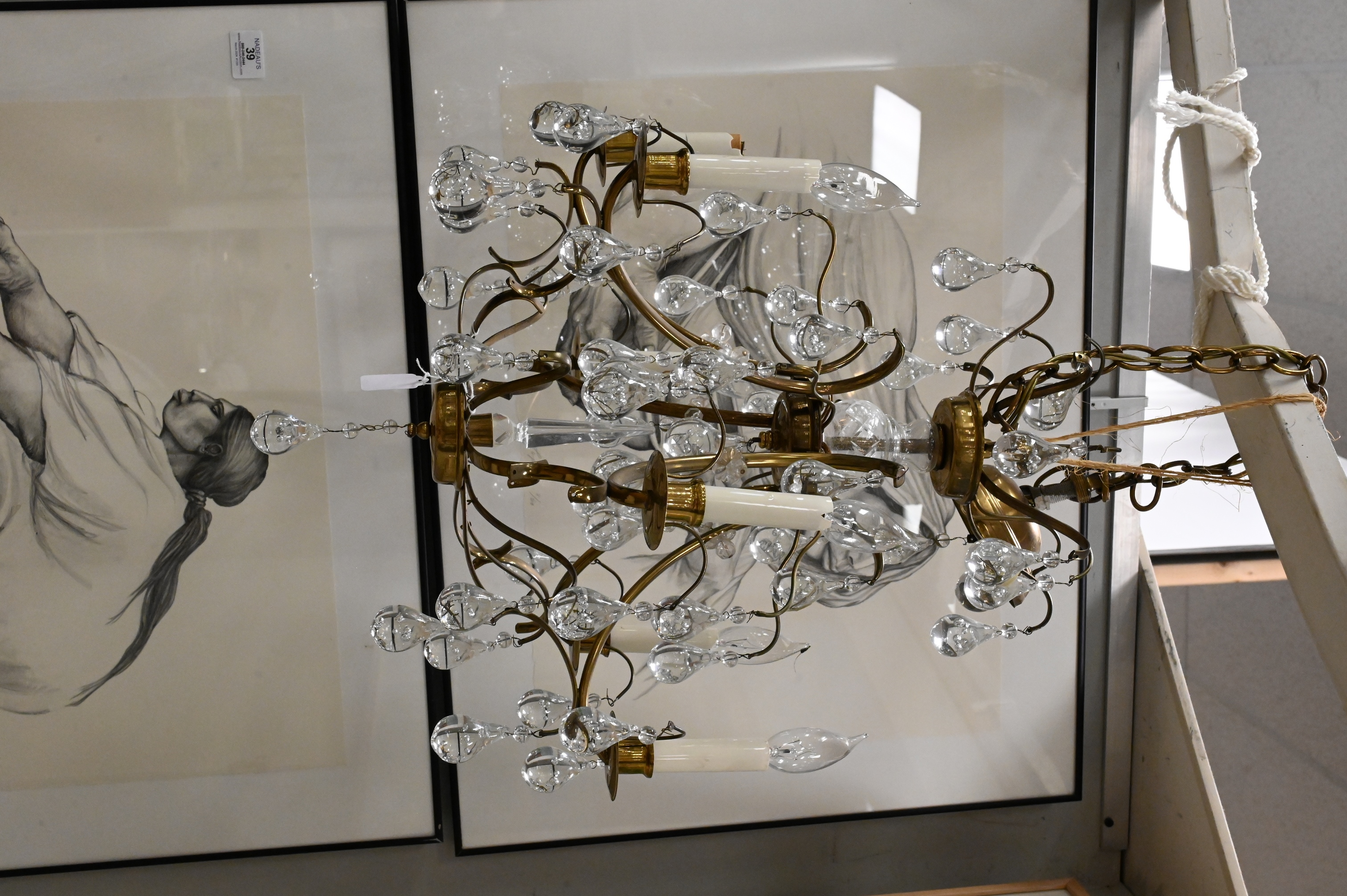 one brass and porcelain six light, along with six light brass and glass ball chandelier