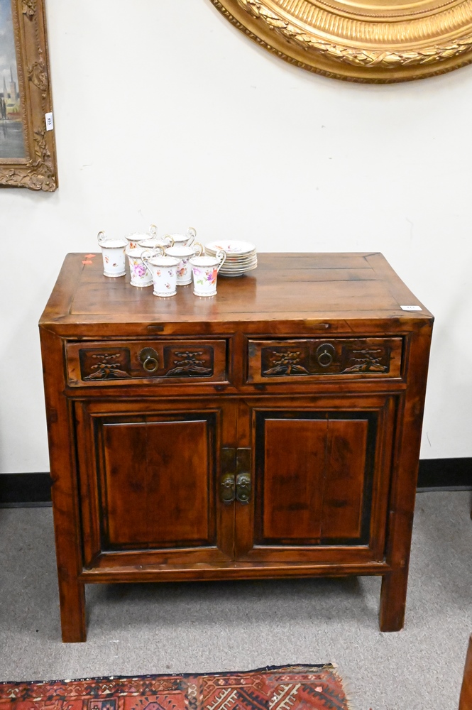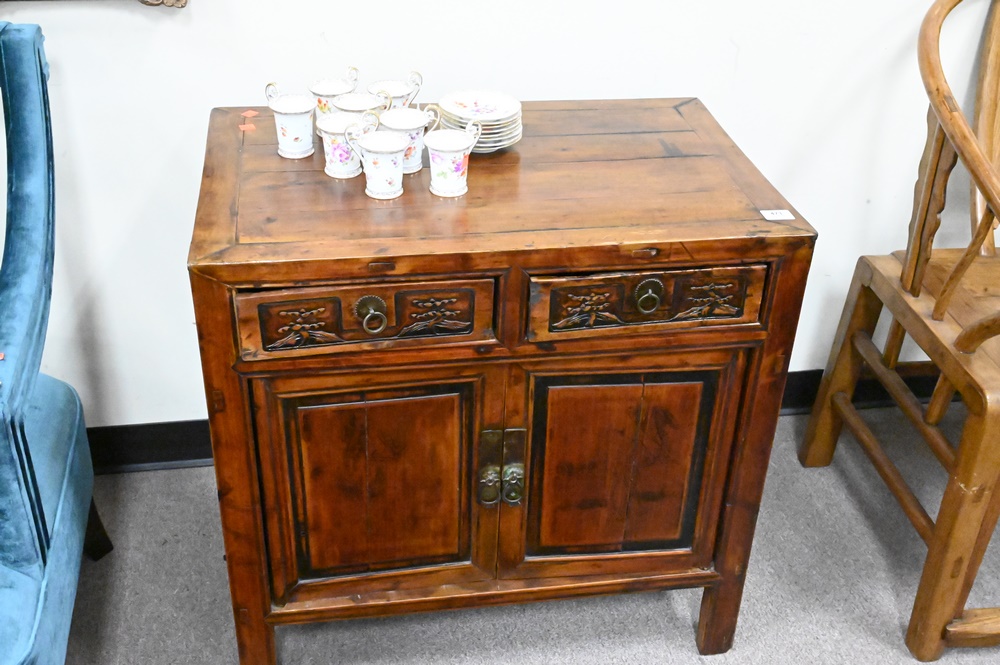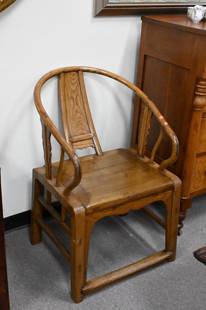 Two Piece Chinese Lot, to include yoke back chair and small cabinet, height 29 inches, top 18 1/2″ x 29 1/2″.