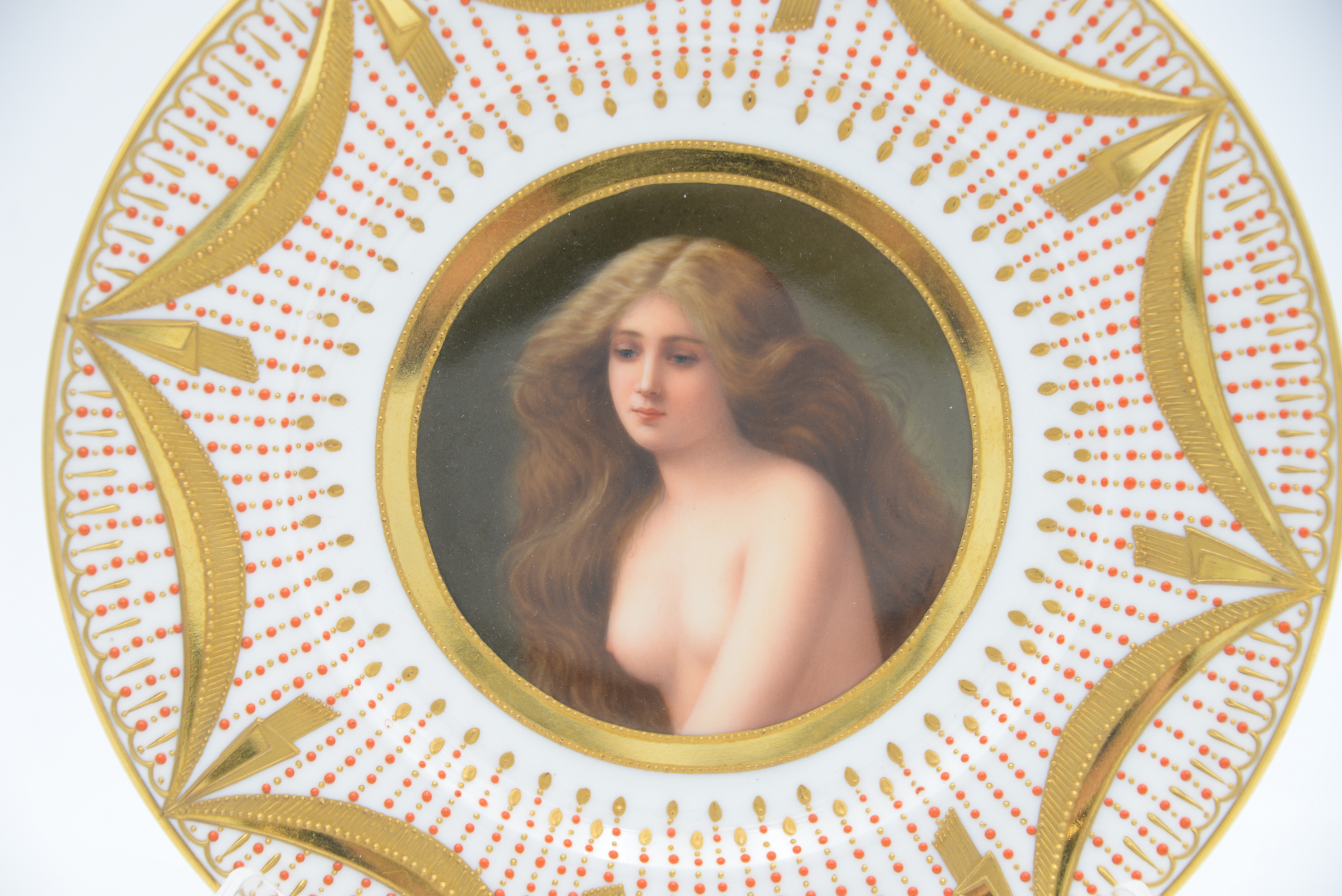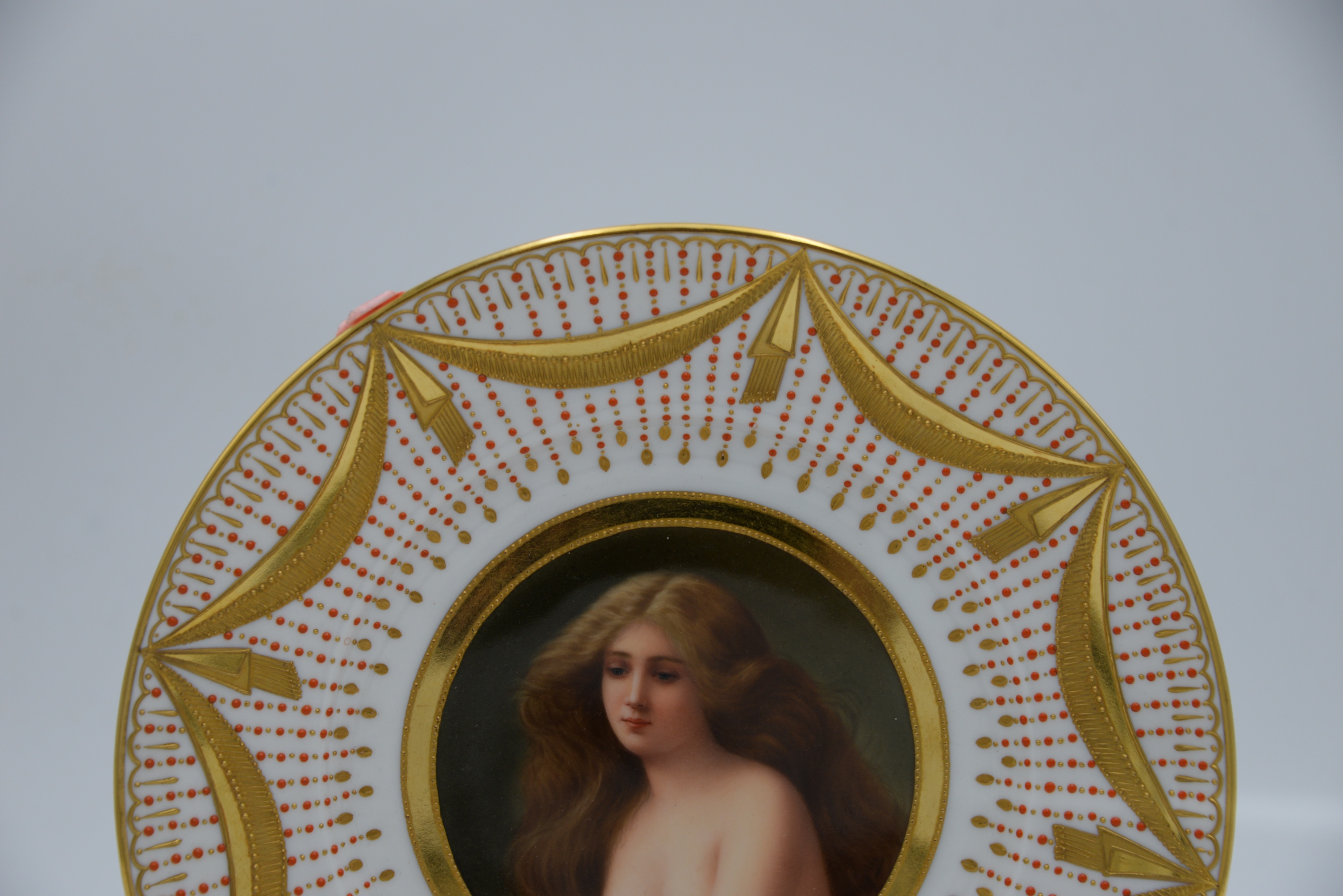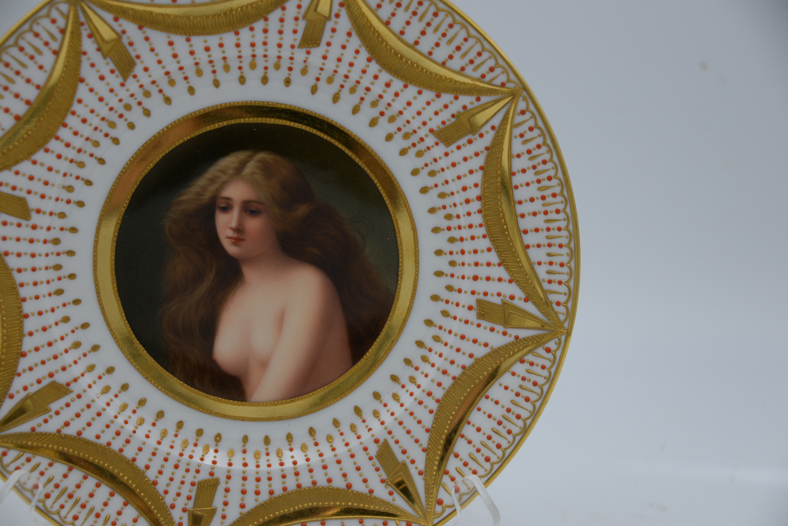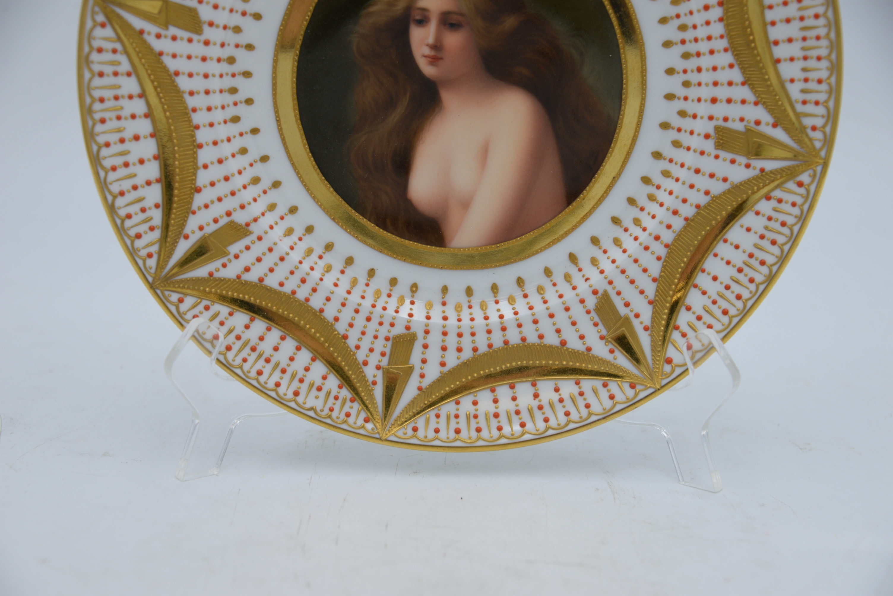 Wagner Royal Vienna Portrait Plate, handpainted, “Solitude”, partially clad woman, with high relief and orange jeweled borders, signed “Wagner”, diameter 9 1/2 inches.