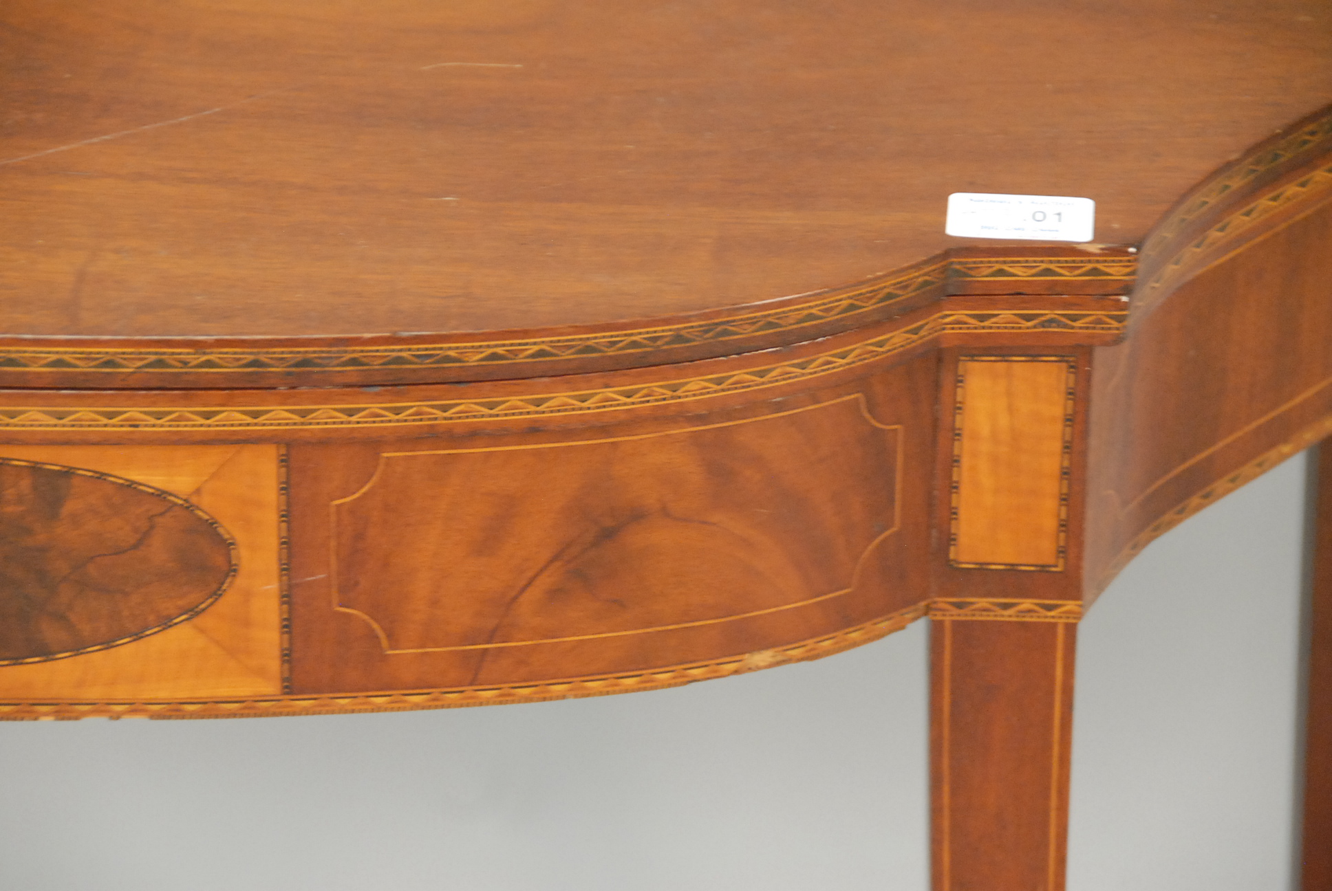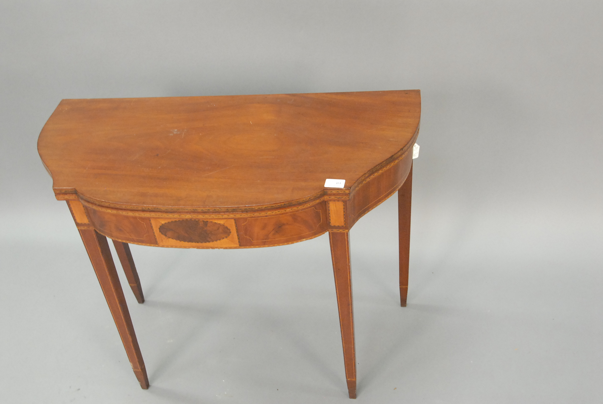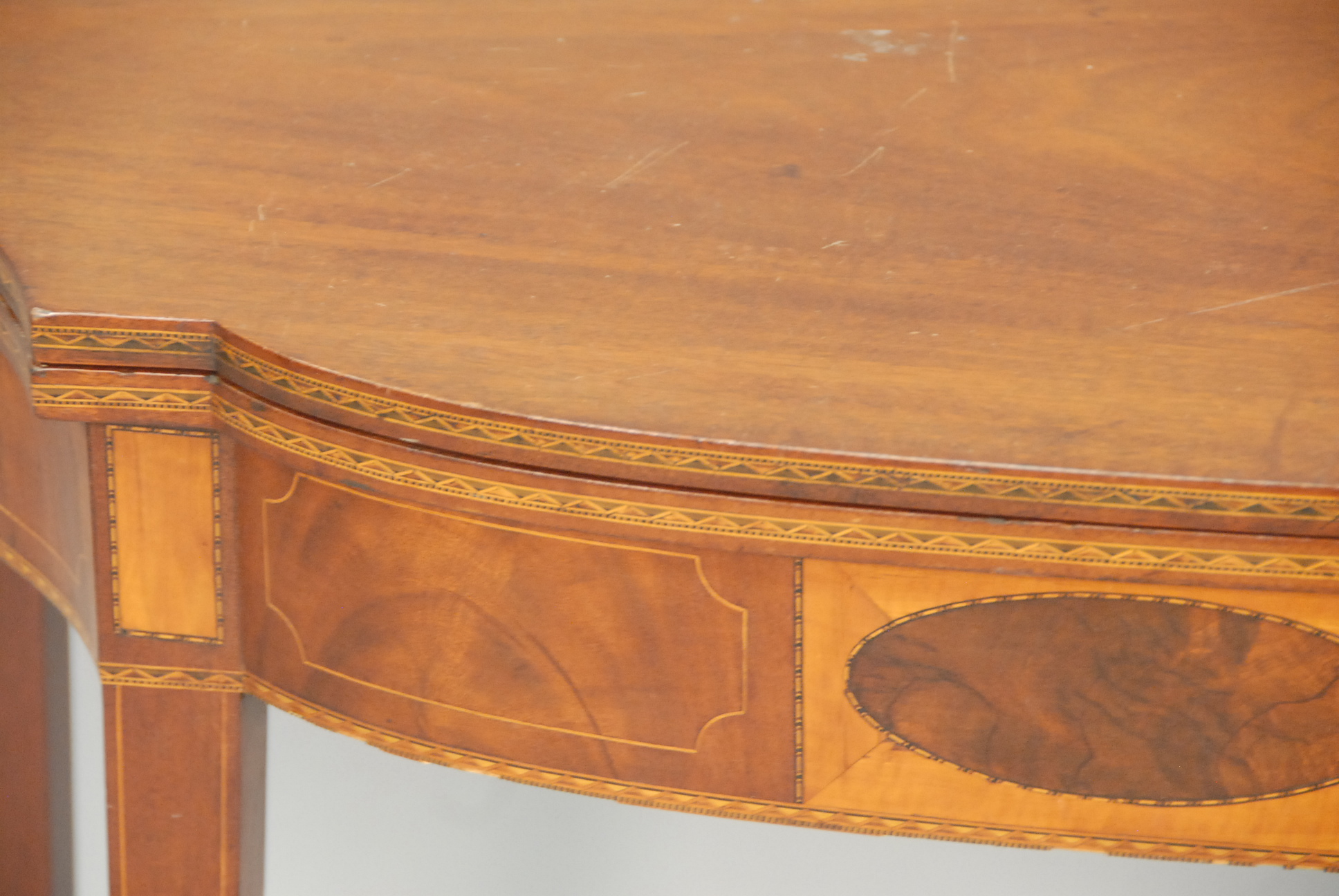 Federal mahogany games table having D shaped top over conforming frieze all set on square tapered legs ending in double tapered feet, frieze and edges with line panel, various wood inlays, minor loses