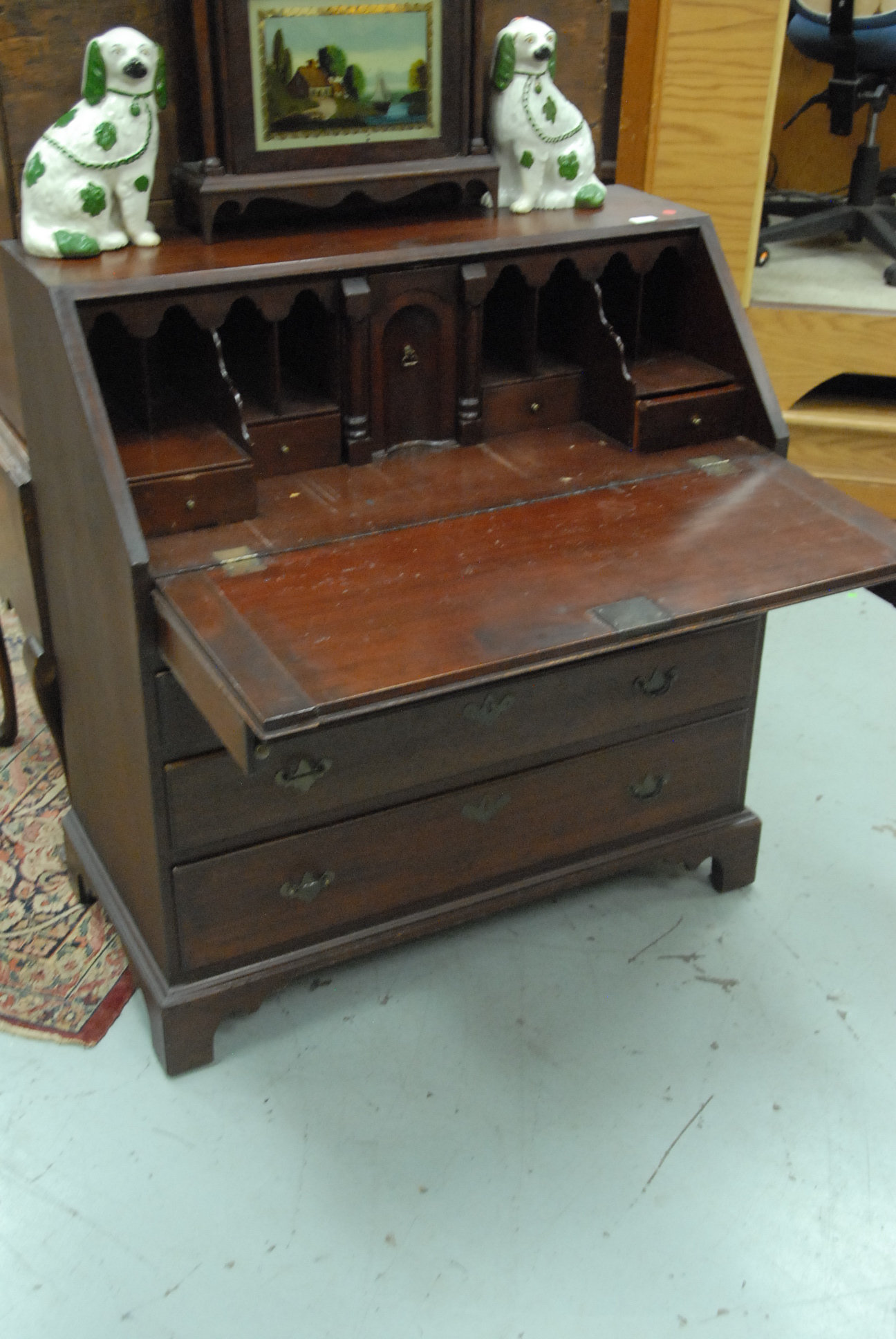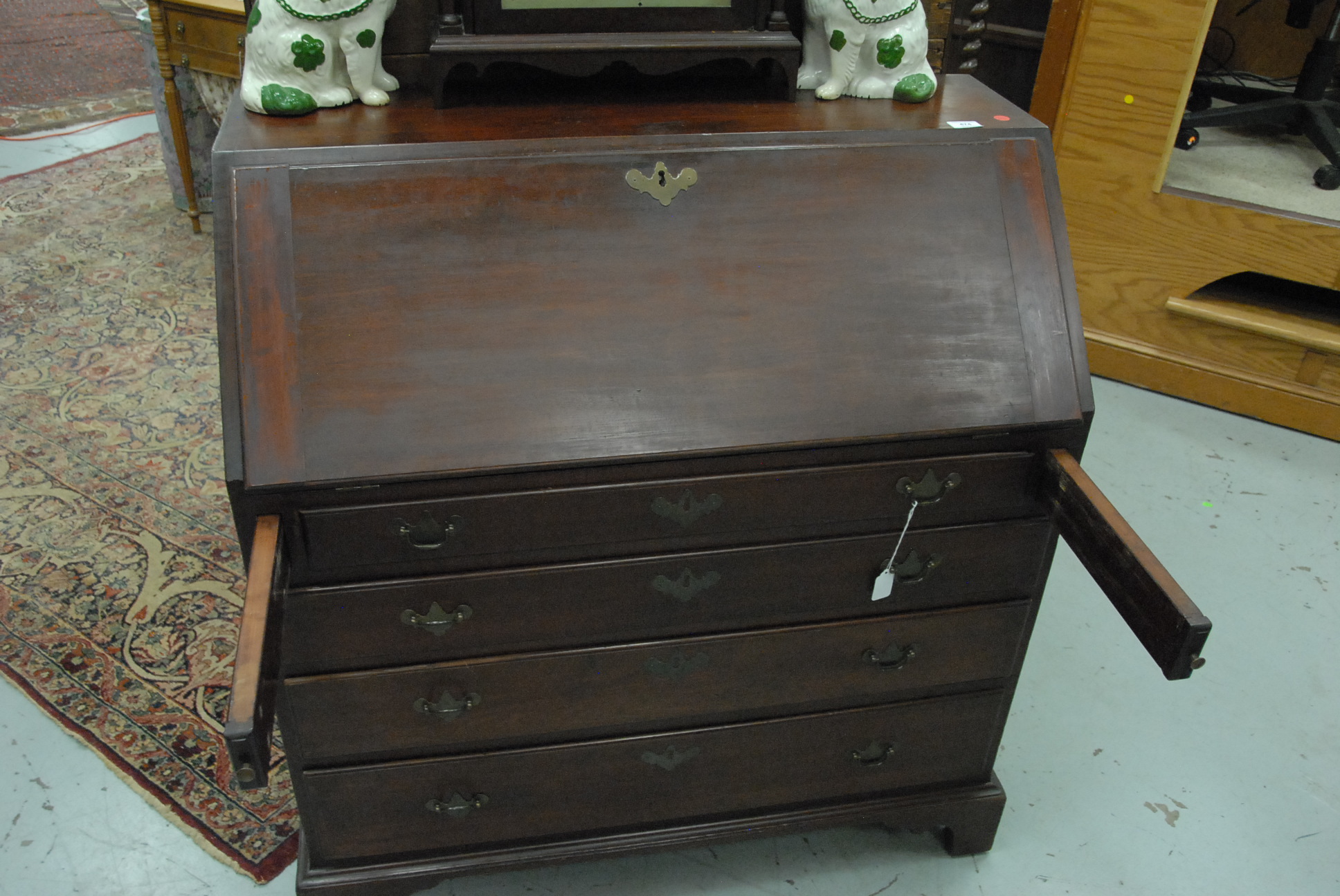 Chippendale cherry desk having slant front over four drawers on bracket base, interior with door, drawers, and pigeon holes. case ht. 40 1/2in. wd. 38in. dp. 18in.