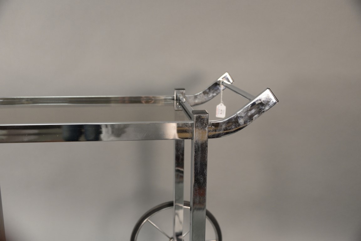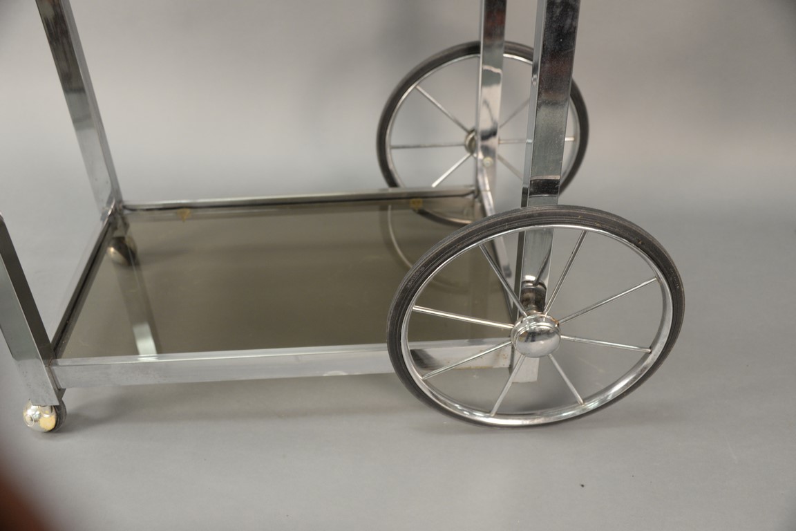 Lot 474: Chrome 1970’s bar cart with inset tinted glass. height 28 inches, top: 29 x 15